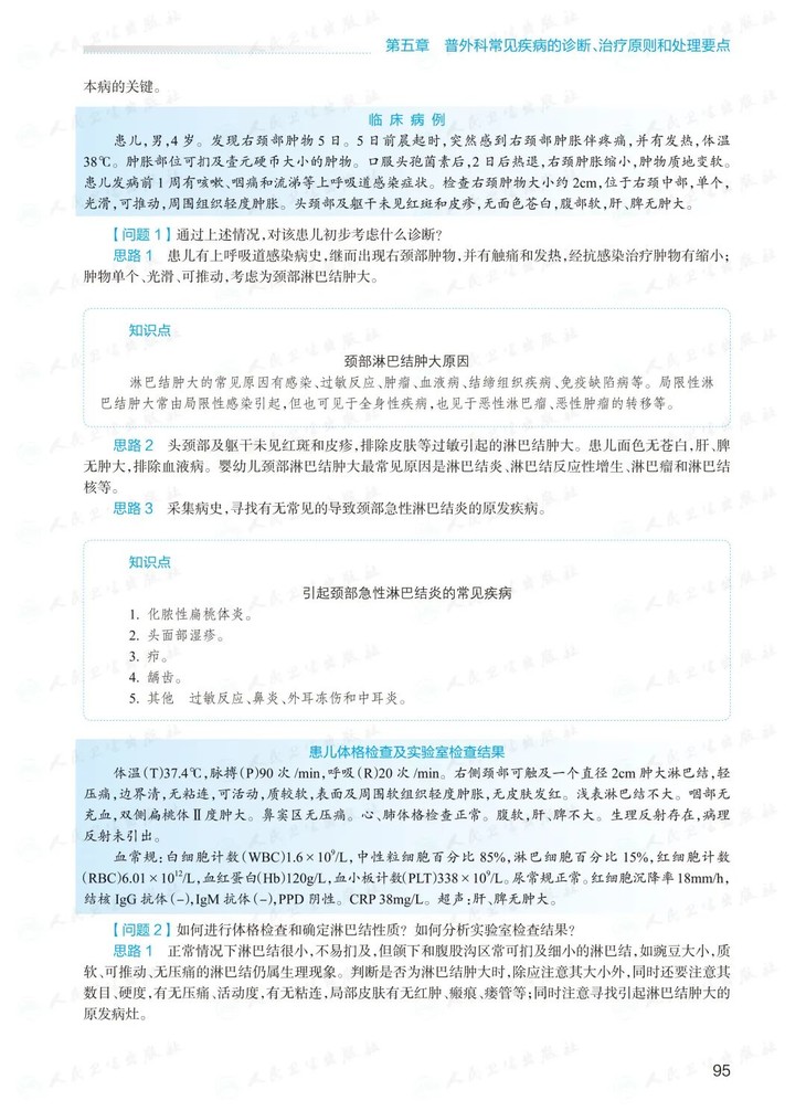 ☮ 本教材共分为十一章:各章节以临床病例入手,从归纳主要临床表现、体格检查特点,到提供实验室辅助检查,层层深入分析,最终总结病例的诊断、鉴别诊断和治疗原则,高度模拟临床收治病例的诊疗过程。既有临床提问带给住培医师的思考,又有知识点的概括,有利于住培医师更好地掌握临床诊疗要点;避免了较为枯燥的单纯理论知识学习,增加了阅读与学习兴趣。