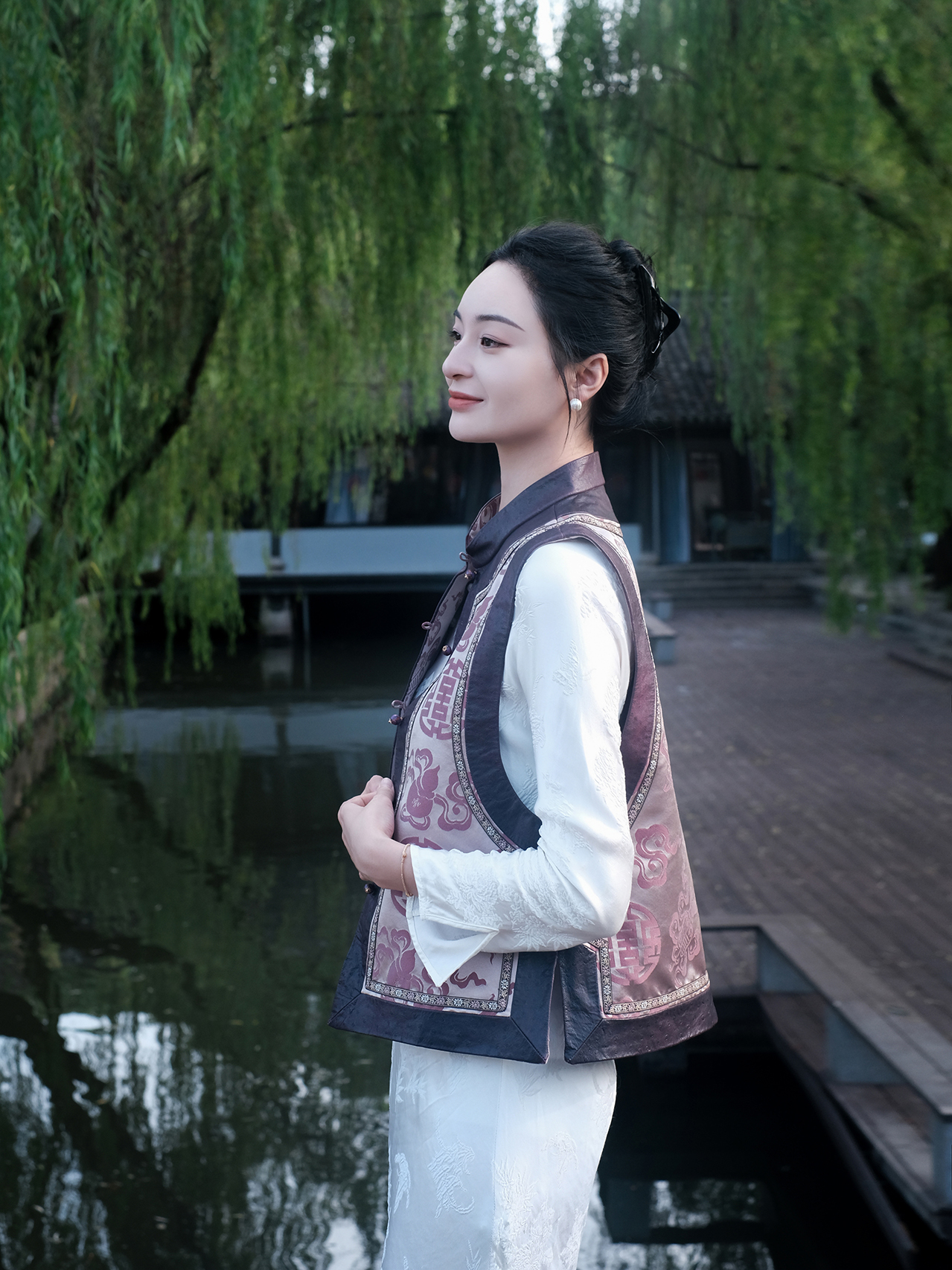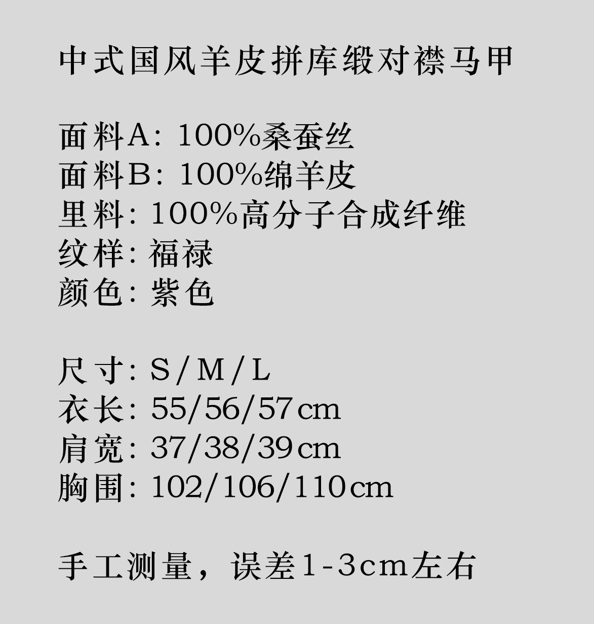 盛唐婧 |中式国风羊皮拼库缎对襟马甲-紫色
