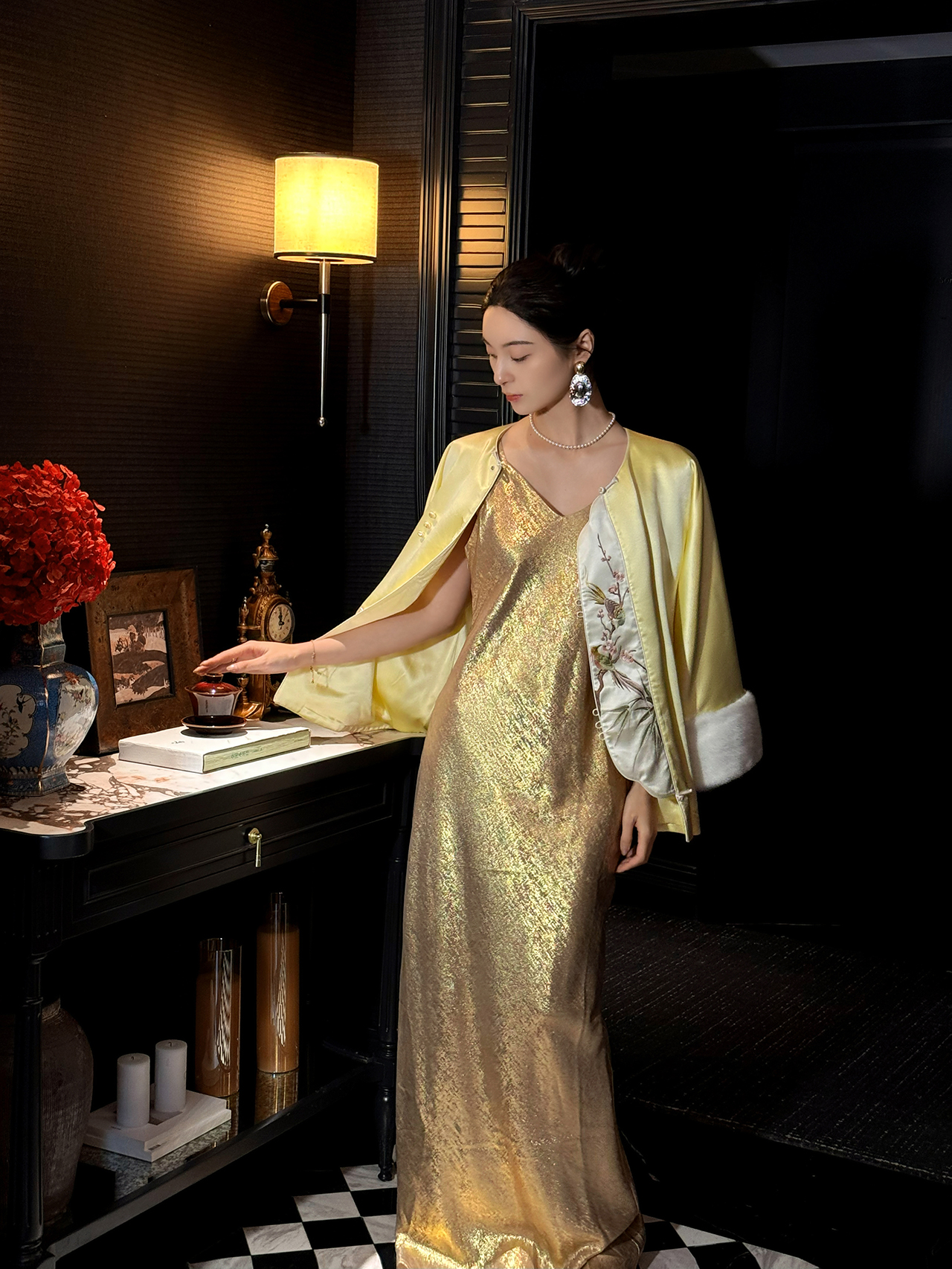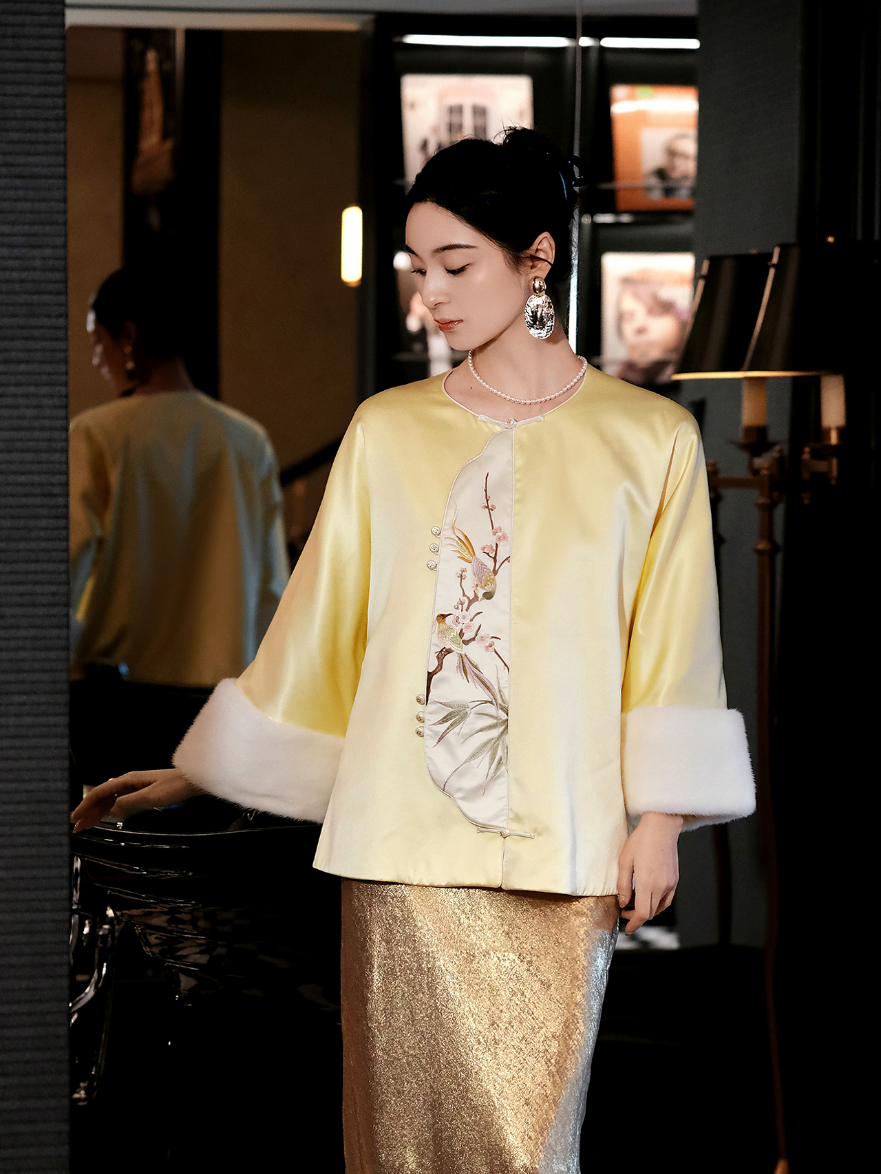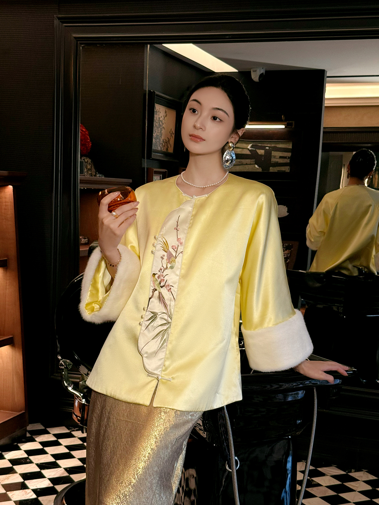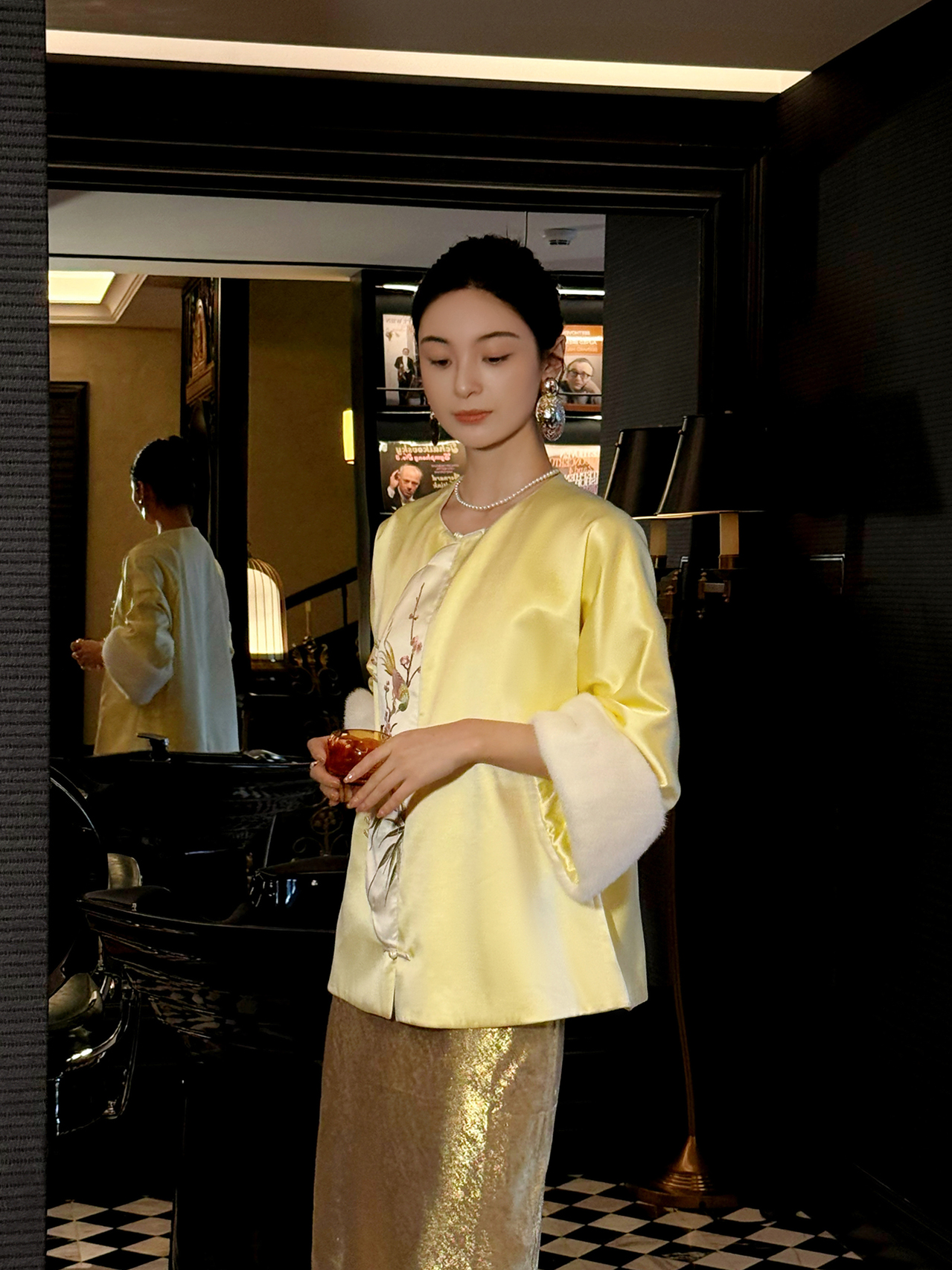 盛唐牡丹大师系列-卢梅红 | 黄执丝毛手绣水貂棉外套