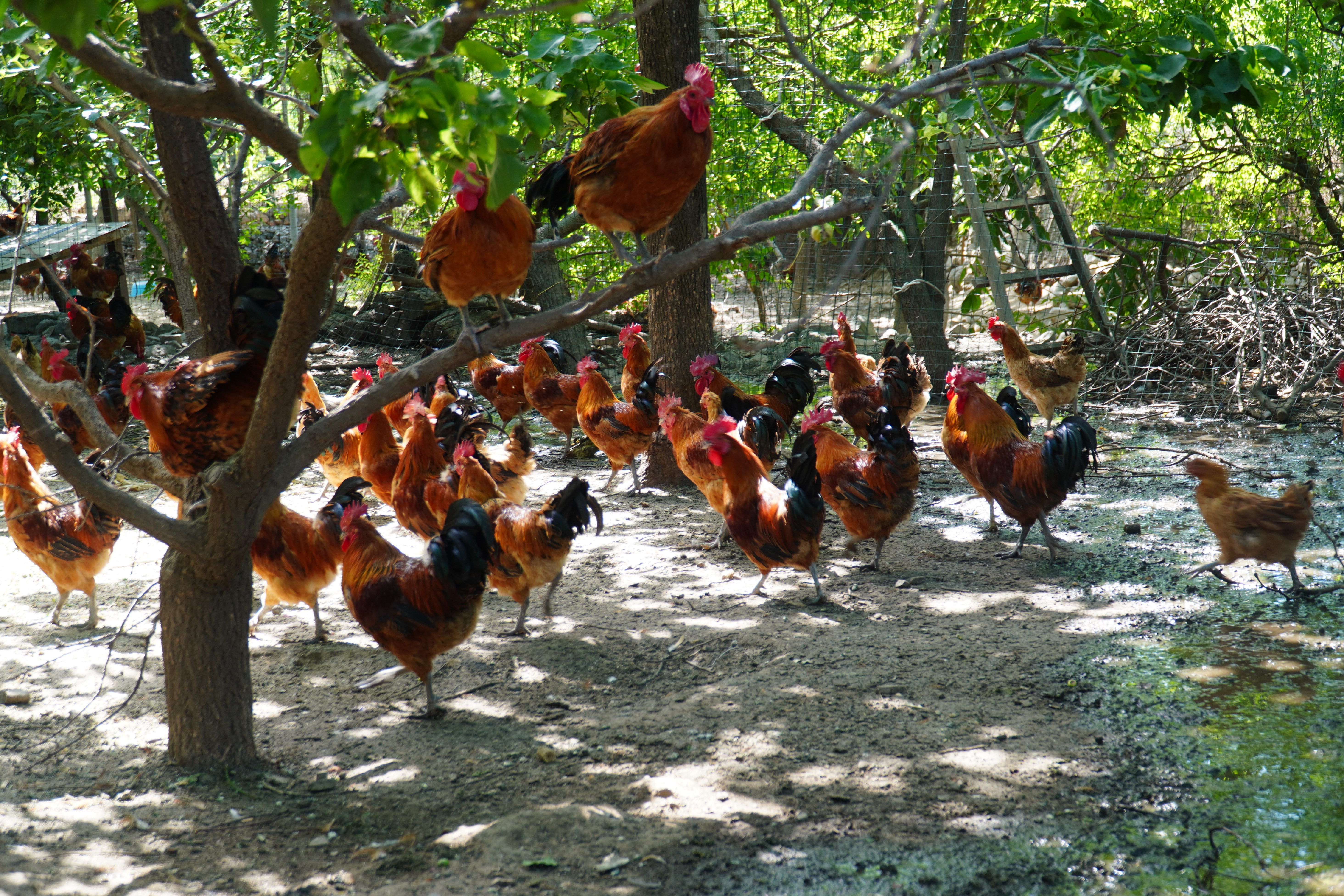 2-3亩的果园,林下放养。在北京过冬,散散两两的鸡舍就可以熬过去。春、夏、秋是它们享受美食美景最好的季节,树上的果子(桃、杏、李子、梨、苹果、枣、柿子)可劲造,整个果园自由活动,活动空间大,运动量足,养殖时间长,肉质更紧实。