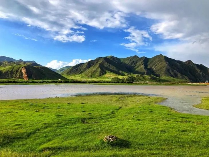 之后驱车前往【桑科草原湿地】,它是桑科乡达久滩(“跑马滩”之意)草原的一部分,湿地有大夏河水从南到北徐徐流过,水草丰茂,风景优雅,蓝天白云下牛羊成群,一派自然田园风光,历来为藏族人民的天然牧场。