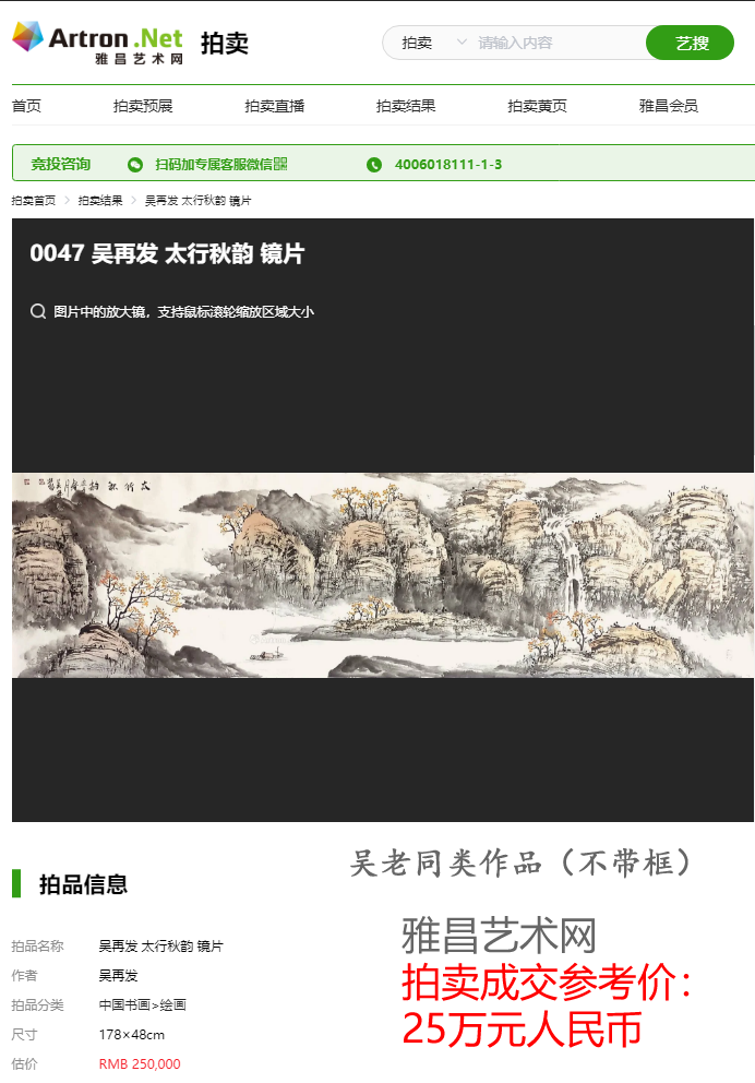 在艺术品拍卖权威的雅昌网上,吴再发的作品非常受欢迎,成交金额在5万~25万元区间,而且屡创新高!暂时未见竖幅作品,可见我们放漏价的这幅吴老作品非常难得!