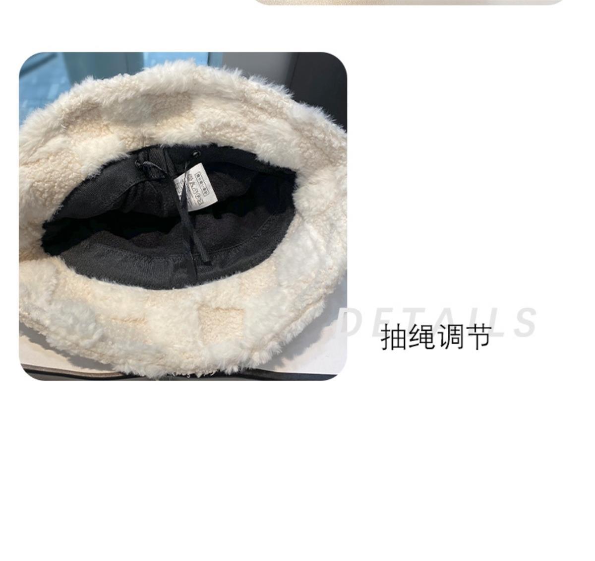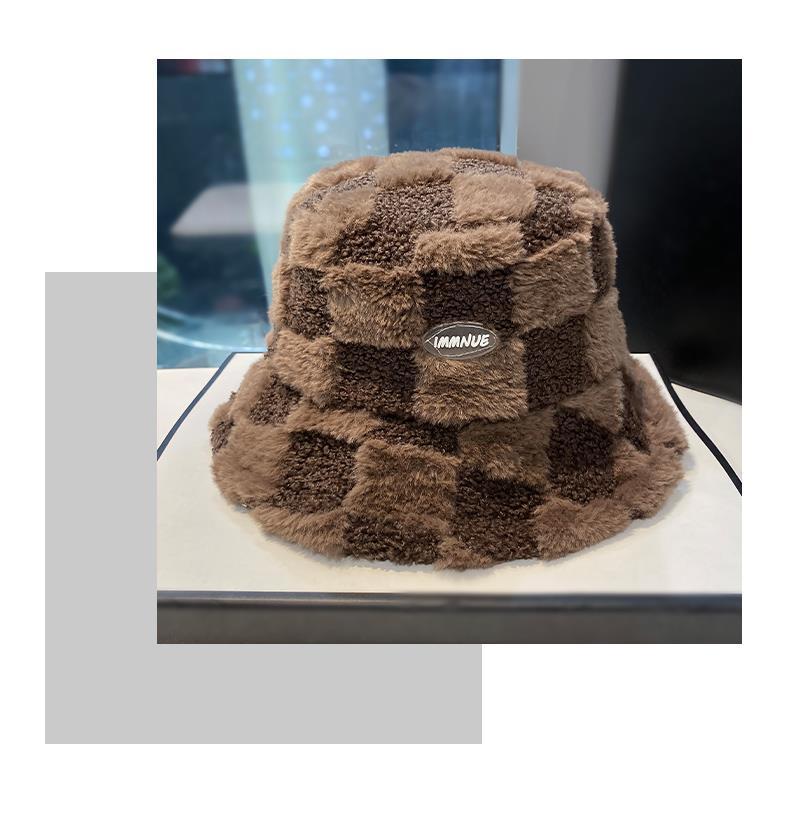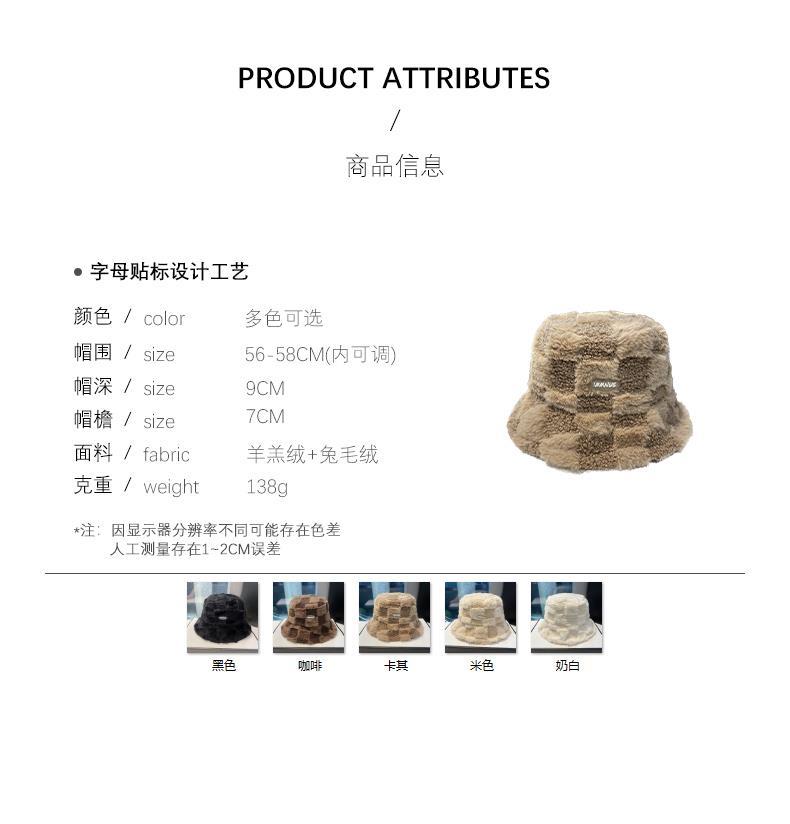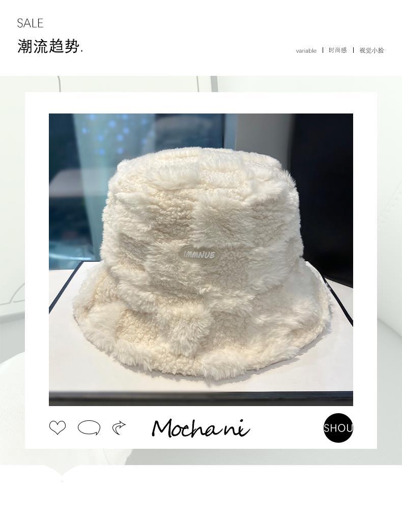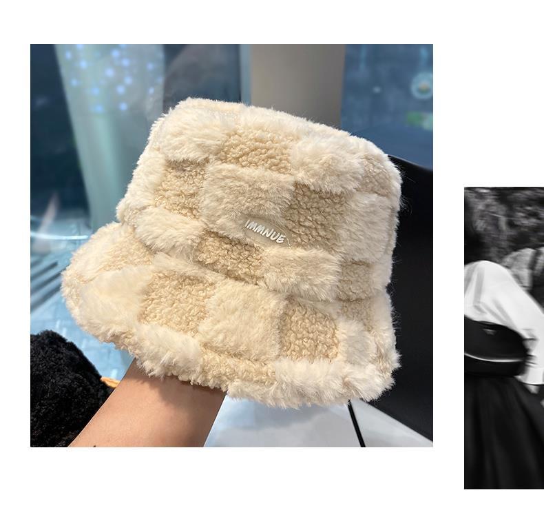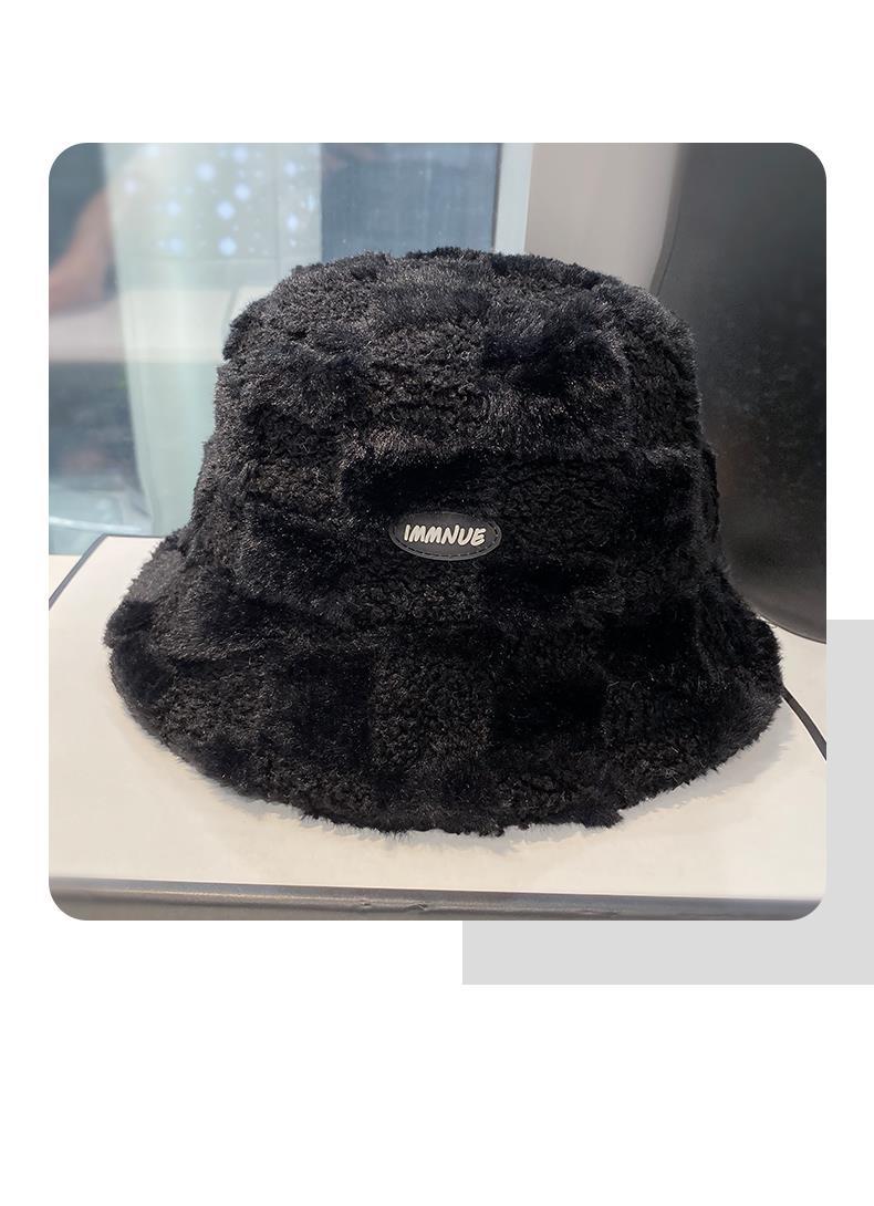 日系羊羔绒格纹渔夫帽女秋冬加厚保暖网红盆帽子字母水桶帽显脸小