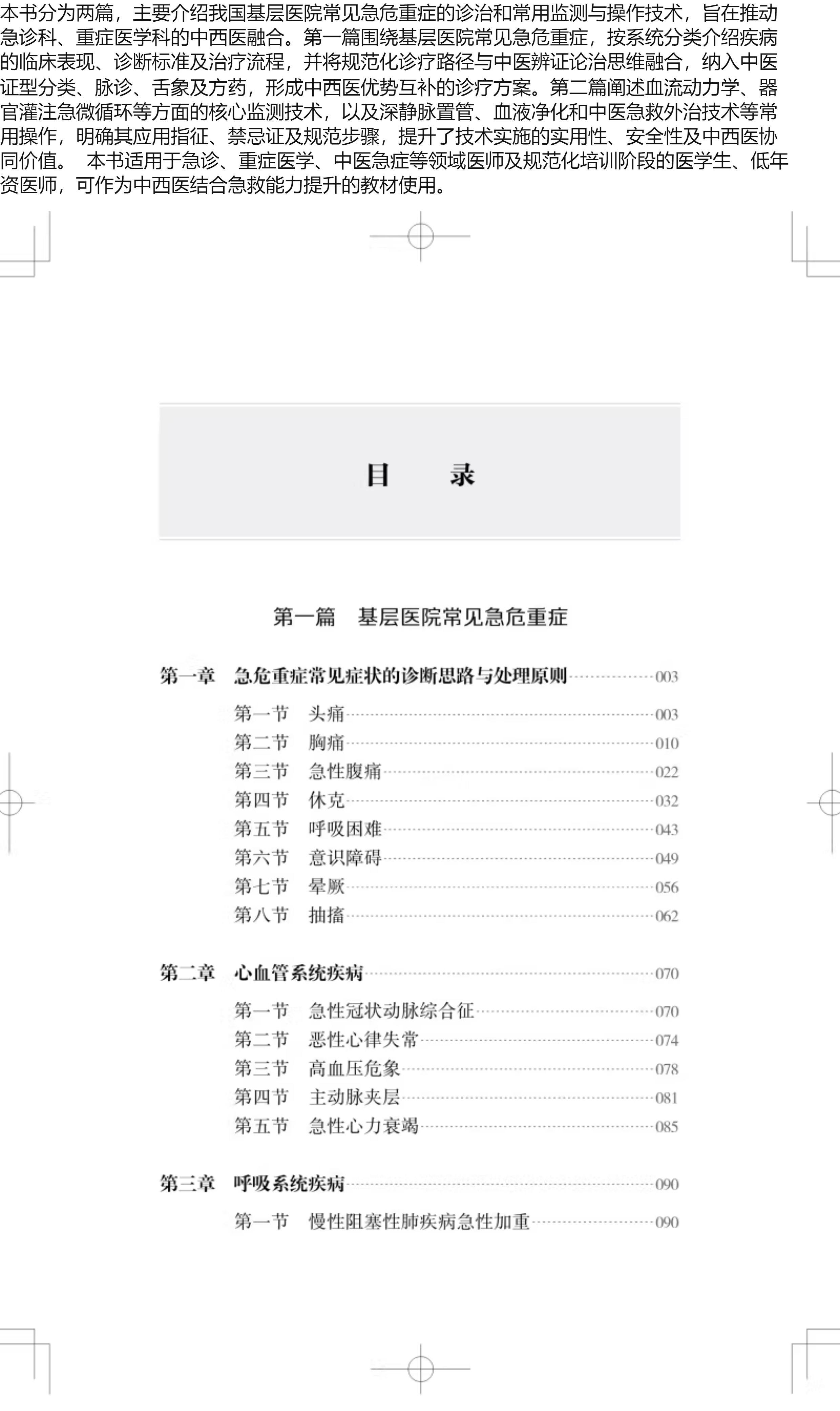 本书分为两篇,主要介绍我国基层医院常见急危重症的诊治和常用监测与操作技术,旨在推动急诊科、重症医学科的中西医融合。第一篇围绕基层医院常见急危重症,按系统分类介绍疾病的临床表现、诊断标准及治疗流程,并将规范化诊疗路径与中医辨证论治思维融合,纳入中医证型分类、脉诊、舌象及方药,形成中西医优势互补的诊疗方案。第二篇阐述血流动力学、器官灌注急微循环等方面的核心监测技术,以及深静脉置管、血液净化和中医急救外治技术等常用操作,明确其应用指征、禁忌证及规范步骤,提升了技术实施的实用性、安全性及中西医协同价值。本书适用于急诊、重症医学、中医急症等领域医师及规范化培训阶段的医学生、低年资医师,可作为中西医结合急救能力提升的教材使用。