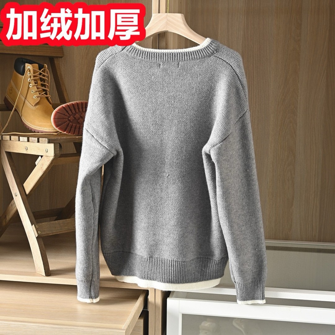 蒙口2026冬季男士底抓绒加厚假两件纯色绵羊绒圆领加厚落肩袖套头毛衣
