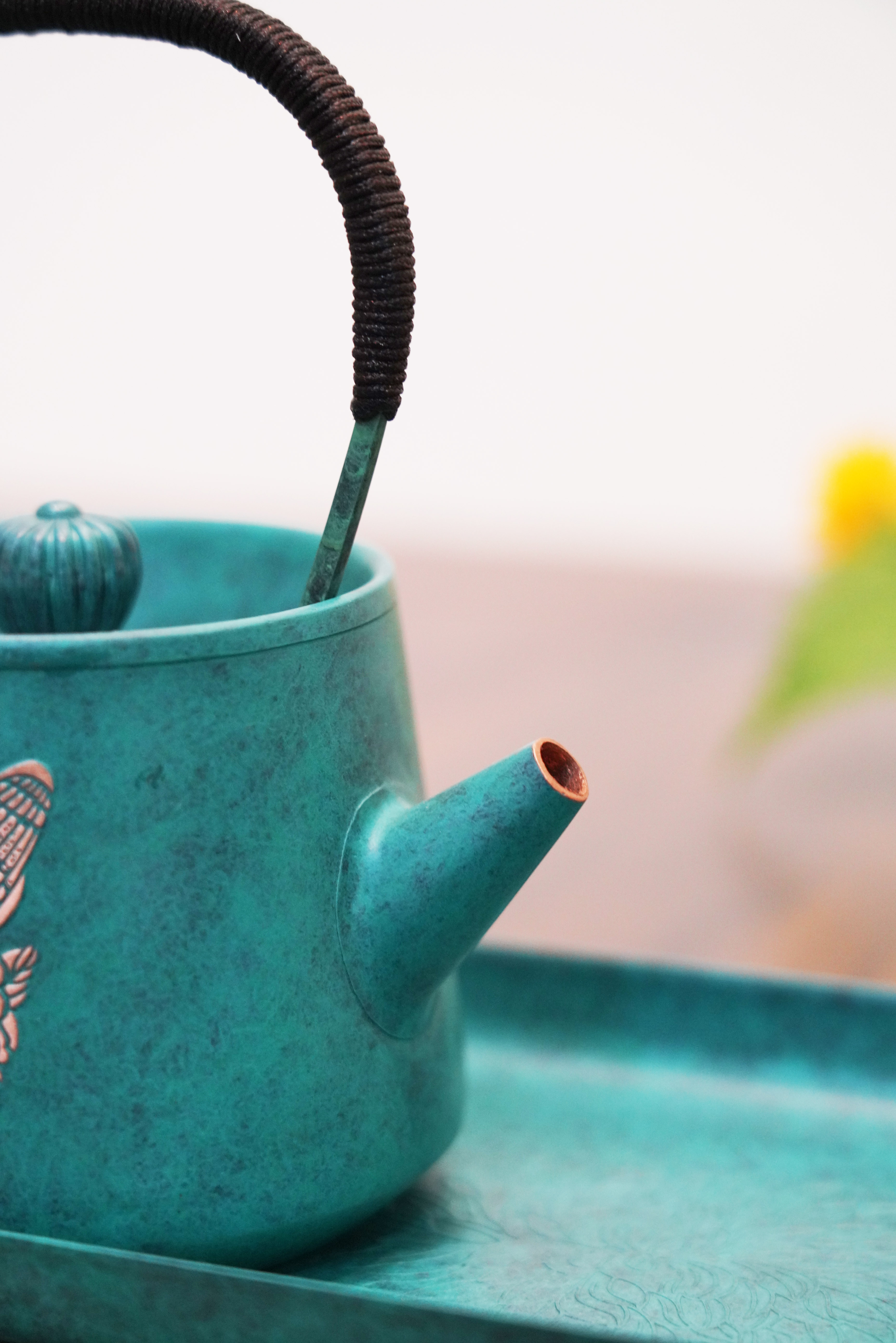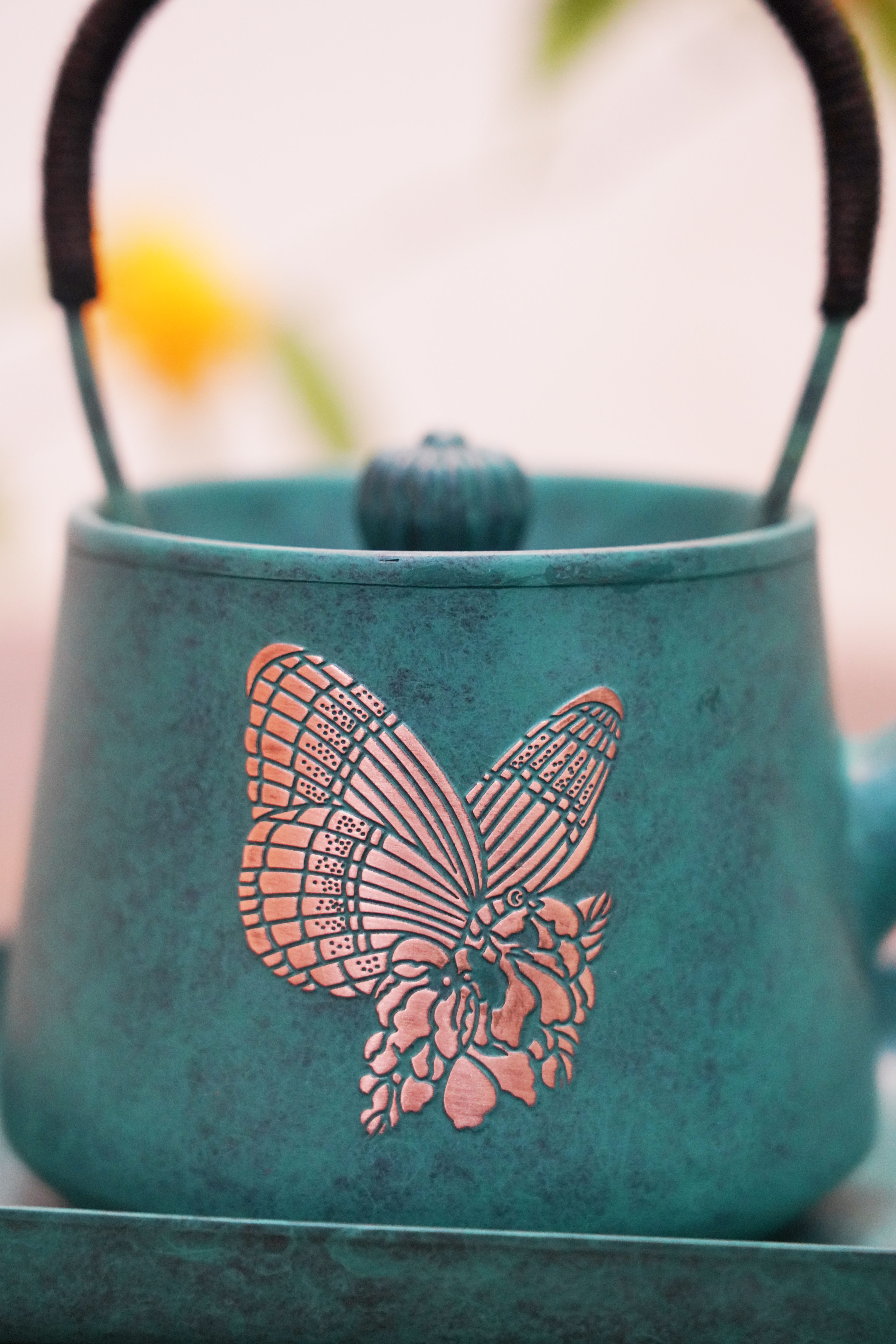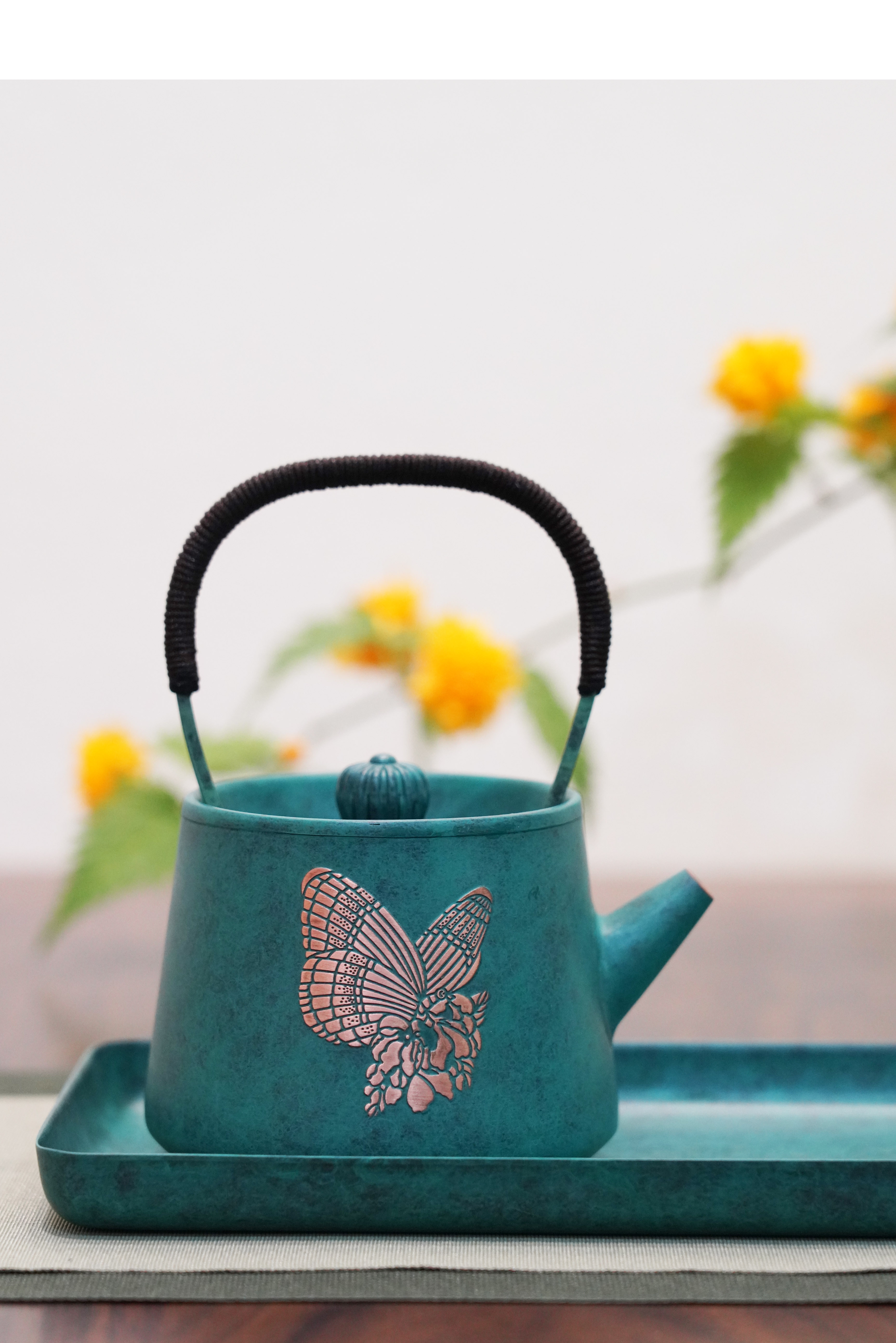 产品介绍:依北京故宫博物院馆藏清·余穉《花鸟图册》而设计。壶身雕刻灵动蝴蝶,依恋着春日盛开的鲜花,飘逸、清美、优雅。使用国家非遗铜雕技艺精制而成,铜壶灵气生动,壶钮为精致的宝珠形,壶提梁上缠绳编,隔热防烫。紫铜材质有天然抑菌性,有益人体也使口感更加饱满顺滑。
