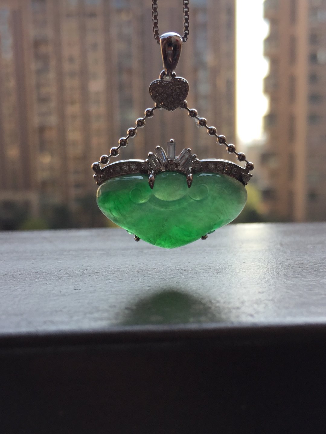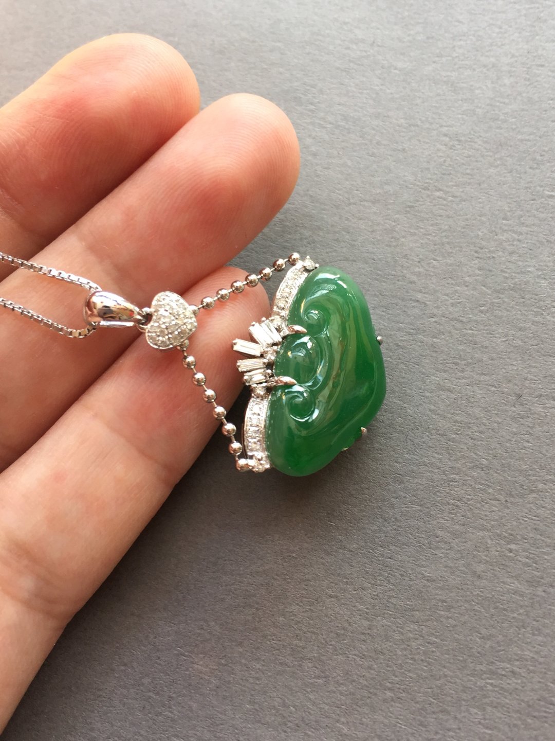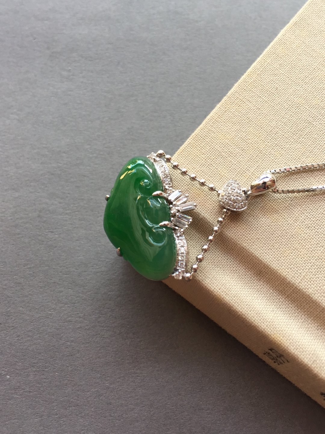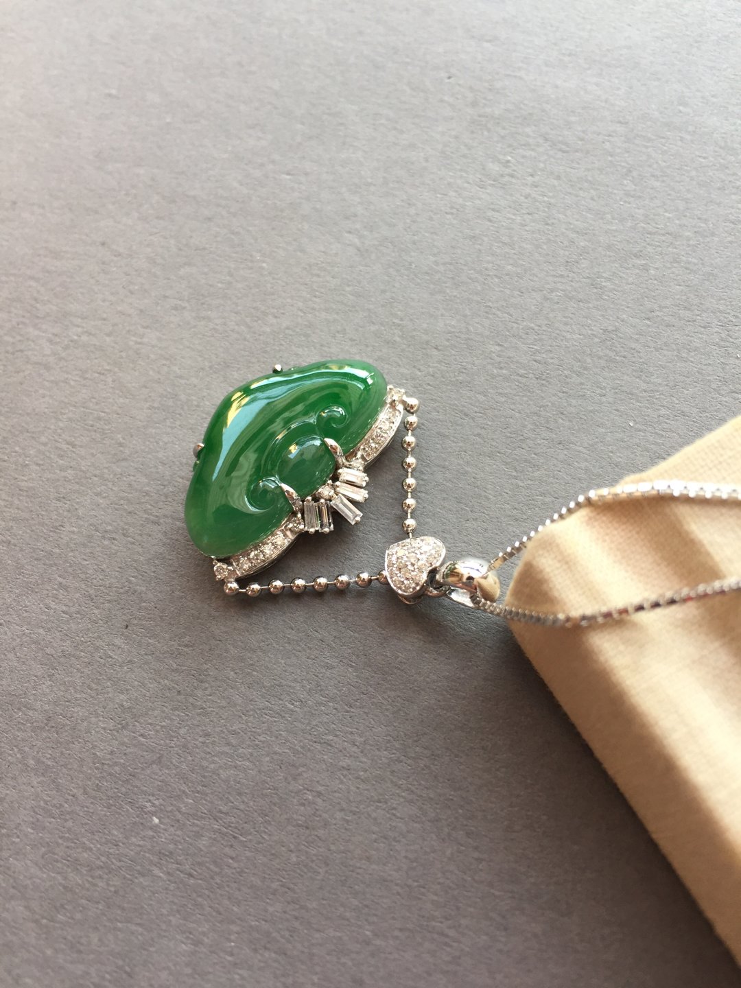 翡翠冰种阳绿如意,24.2×13.1×3mm,镶嵌后32×25.4×6.7mm。周正饱满的如意,种水晶莹剔透,阳绿鲜辣,过目难忘的好东西,18k白金钻石镶嵌,用的是长钻,成本非常高,低调的奢华,上下活动款式,佩戴上身摇曳多姿,值得收藏的绿货,推荐