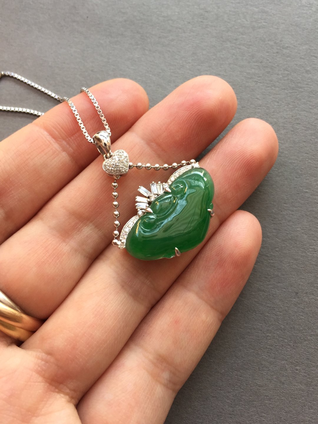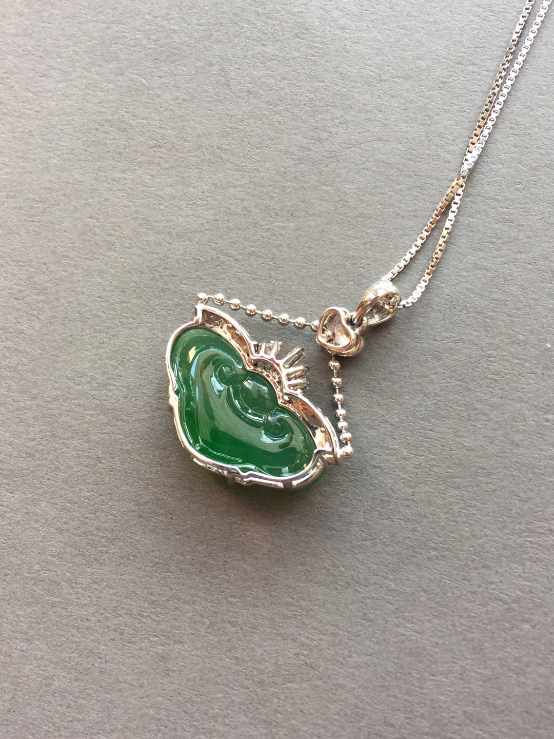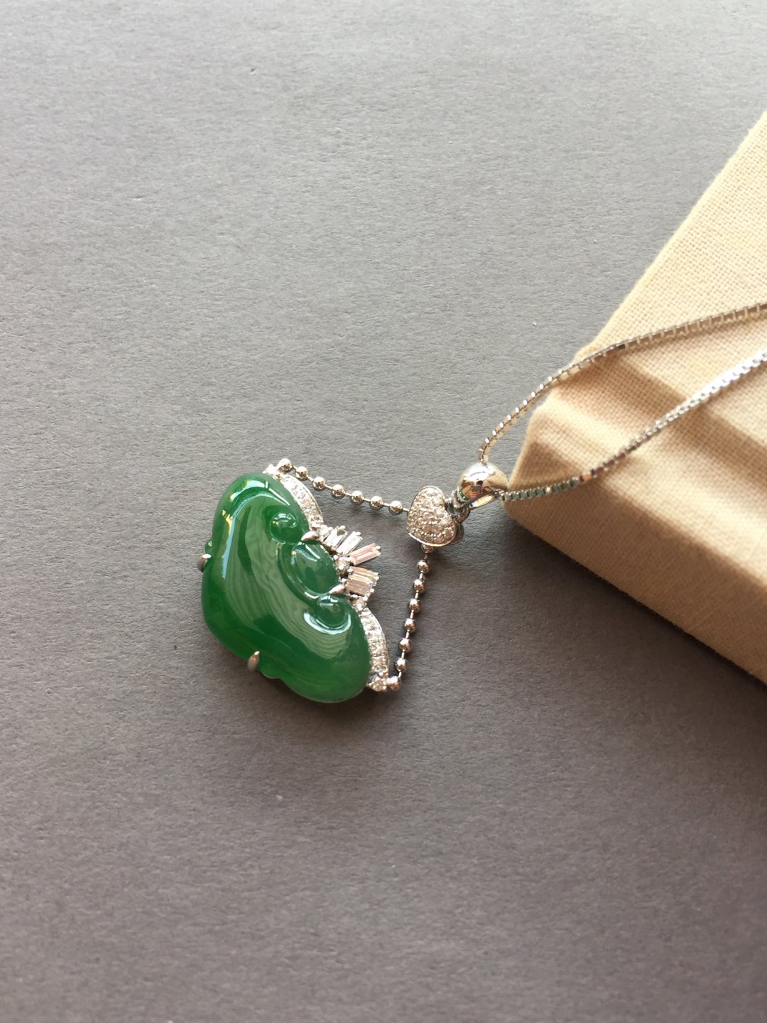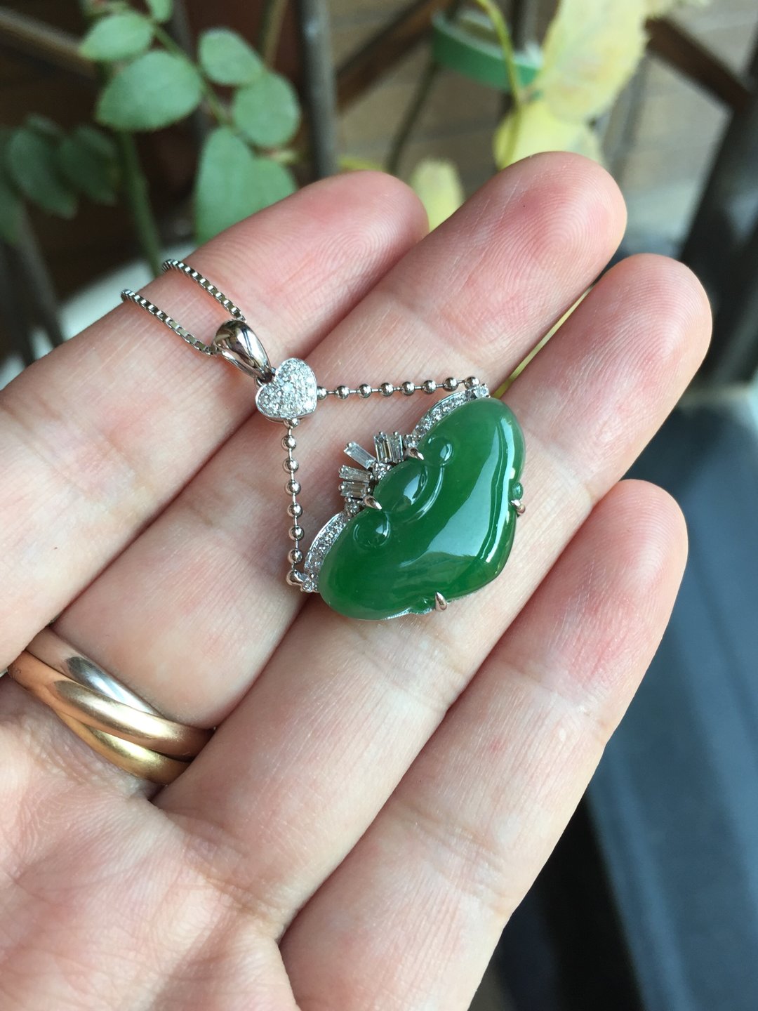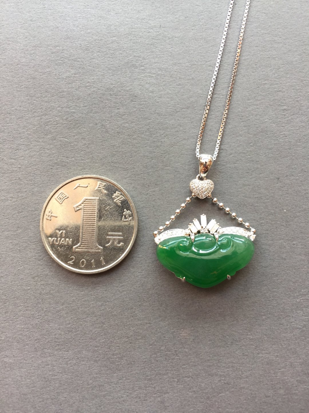 翡翠冰种阳绿如意,24.2×13.1×3mm,镶嵌后32×25.4×6.7mm。周正饱满的如意,种水晶莹剔透,阳绿鲜辣,过目难忘的好东西,18k白金钻石镶嵌,用的是长钻,成本非常高,低调的奢华,上下活动款式,佩戴上身摇曳多姿,值得收藏的绿货,推荐