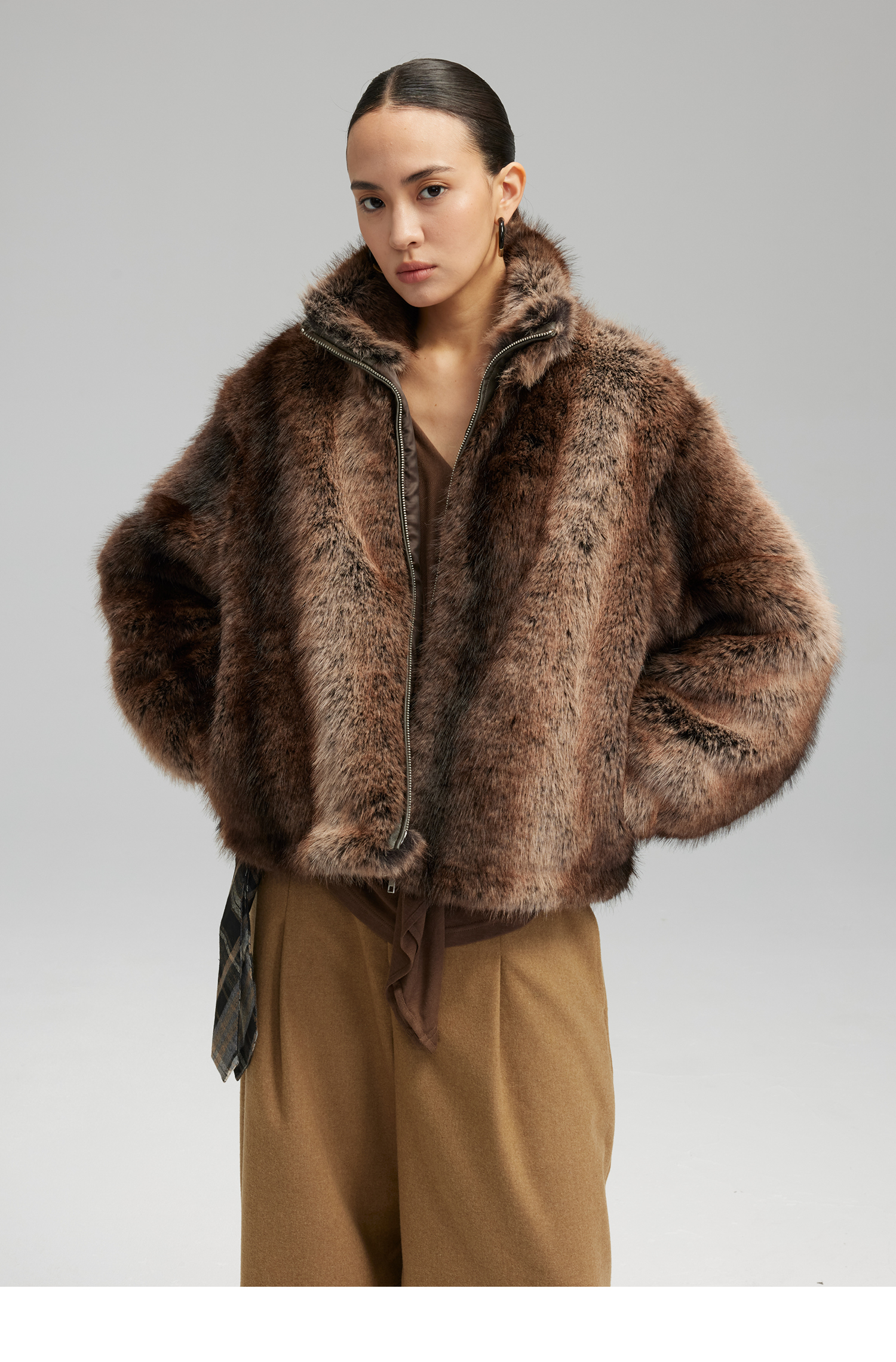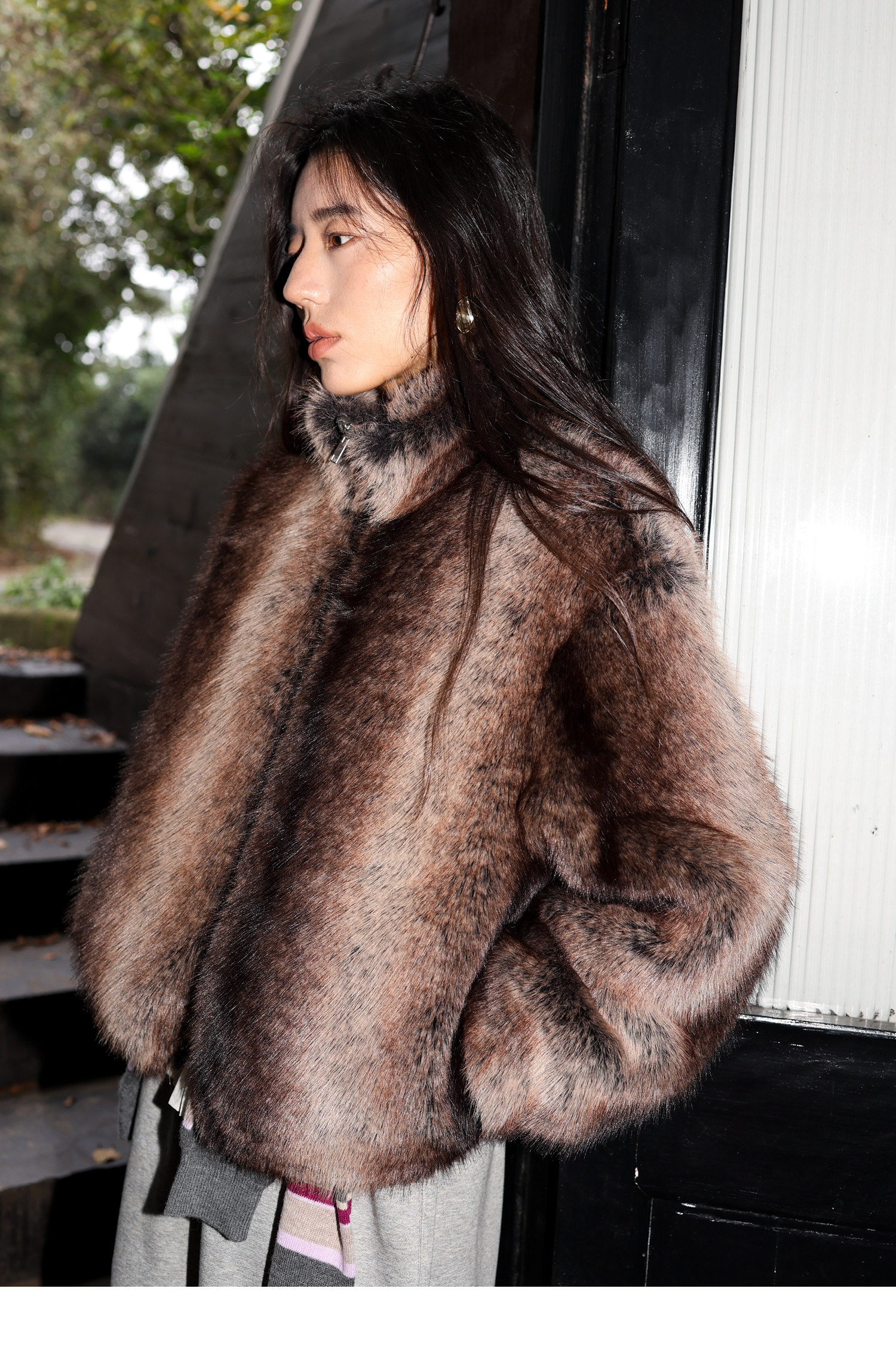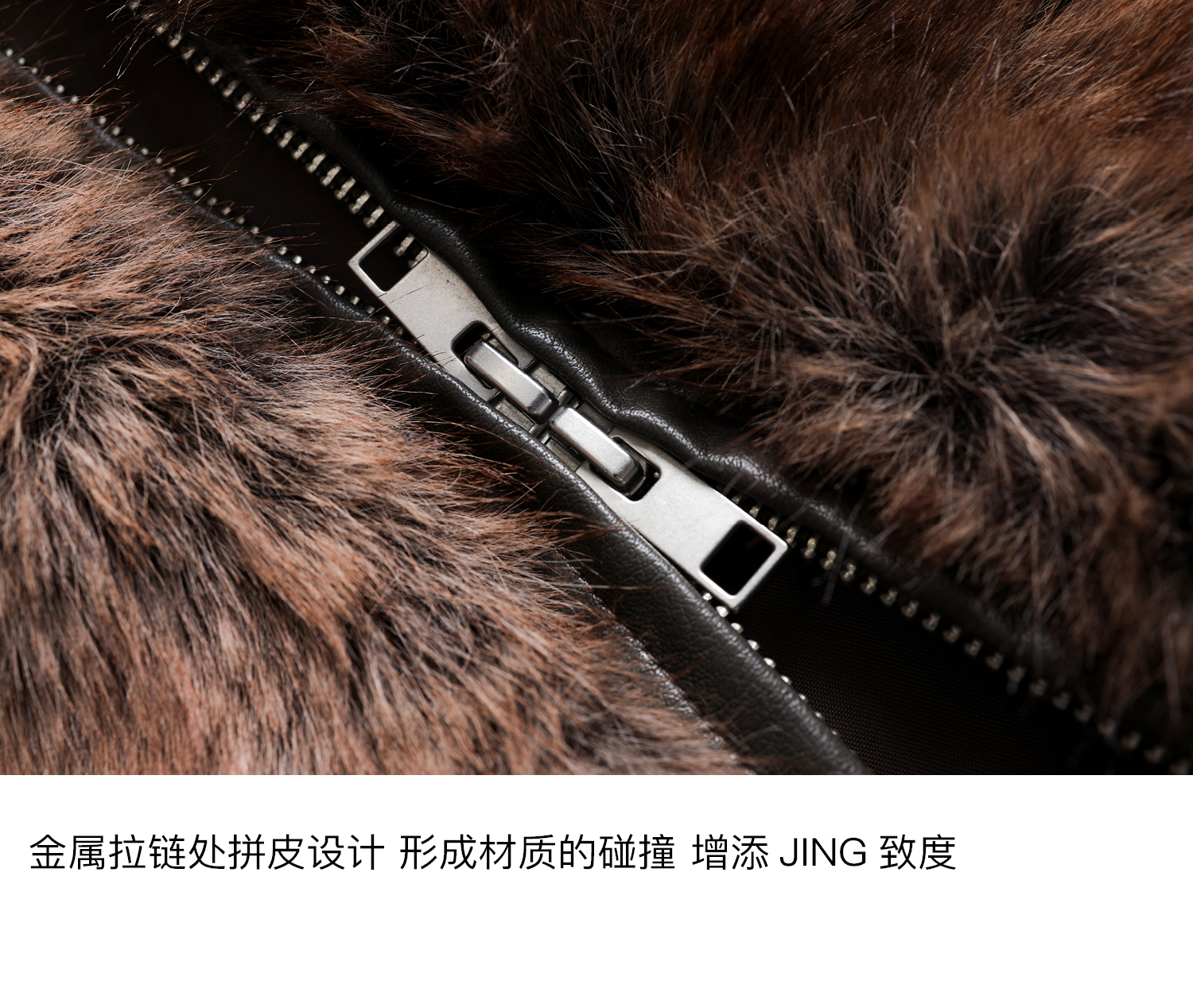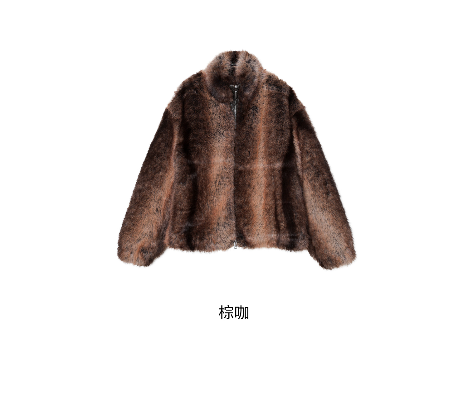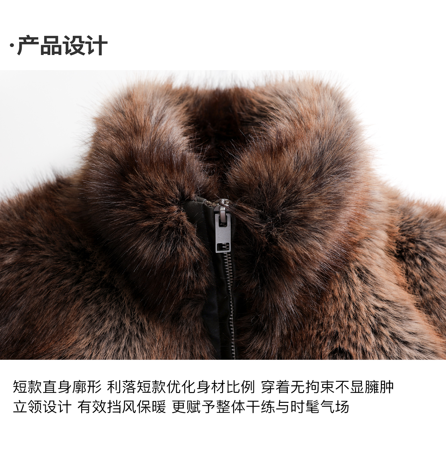 素舶 三色毛环保皮草浓密蓬松拼皮门襟立领拉链抽绳皮草短外套