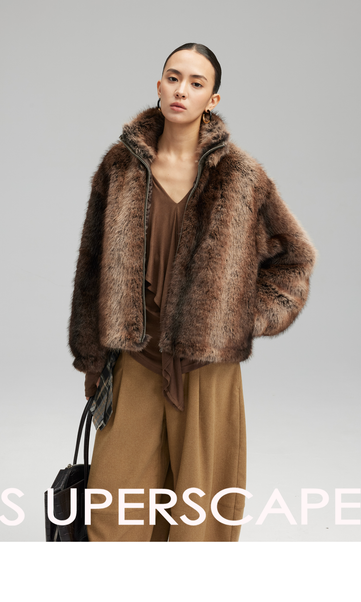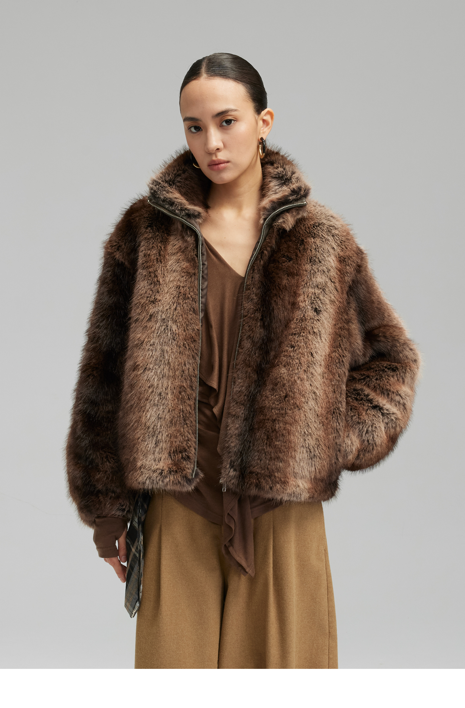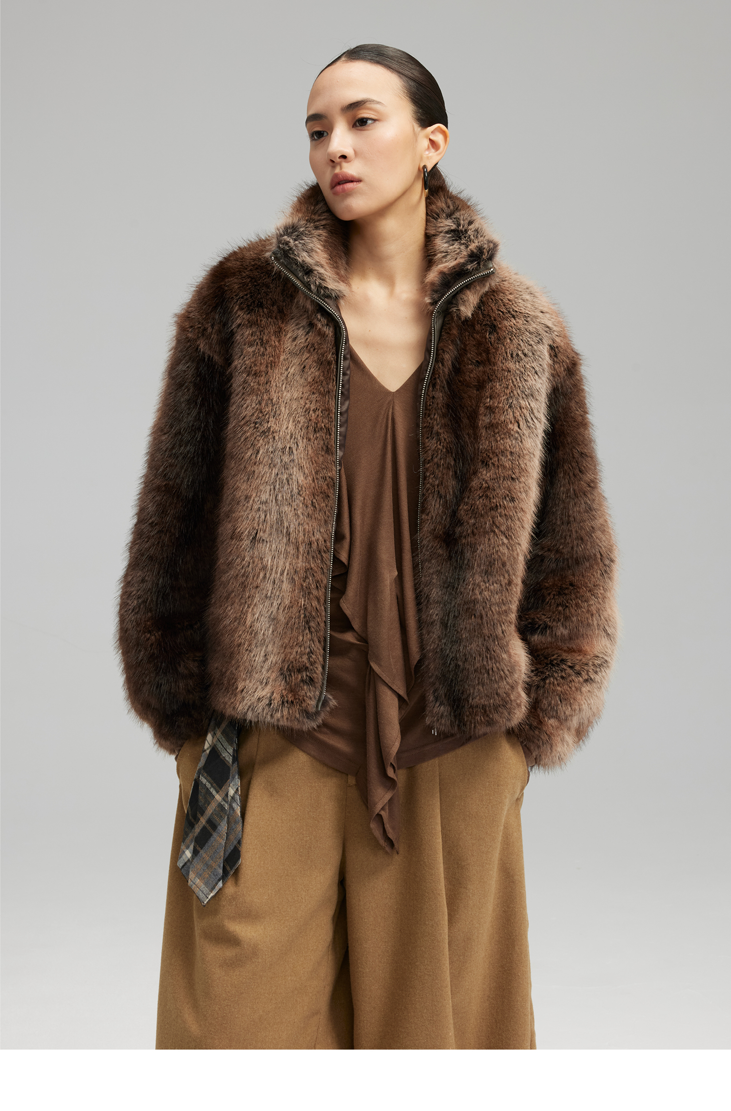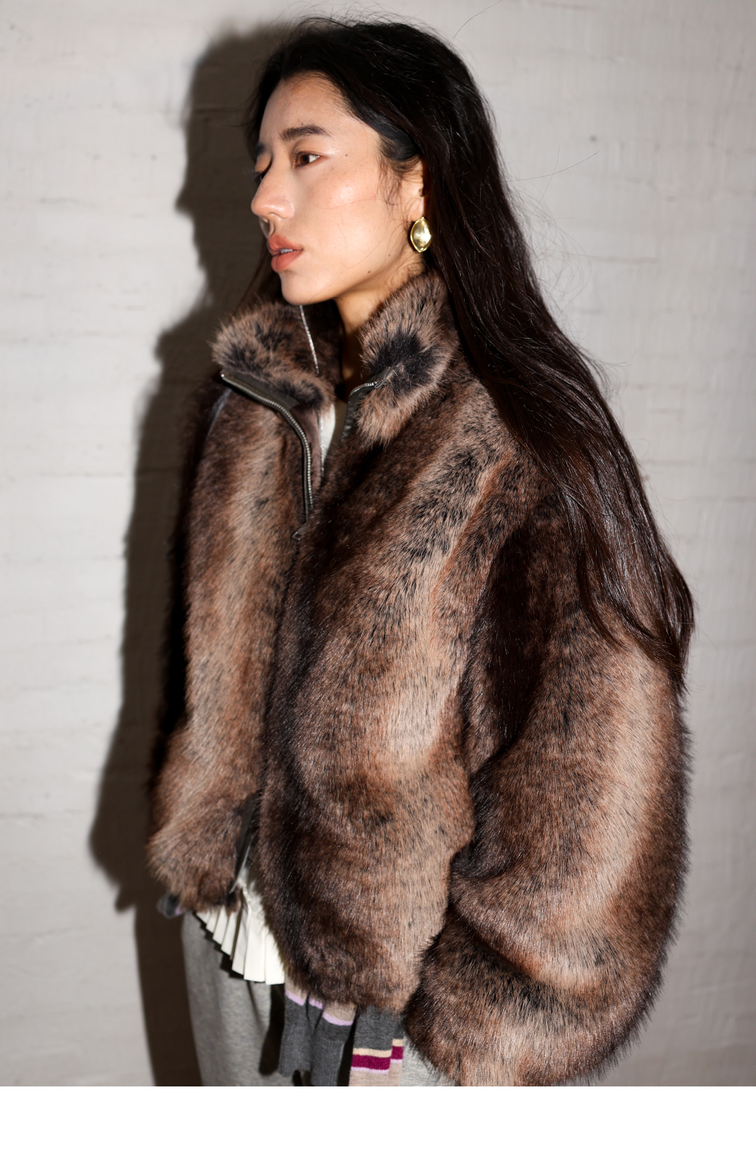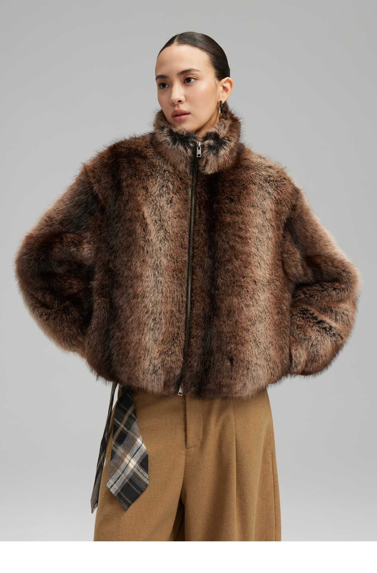 素舶 三色毛环保皮草浓密蓬松拼皮门襟立领拉链抽绳皮草短外套