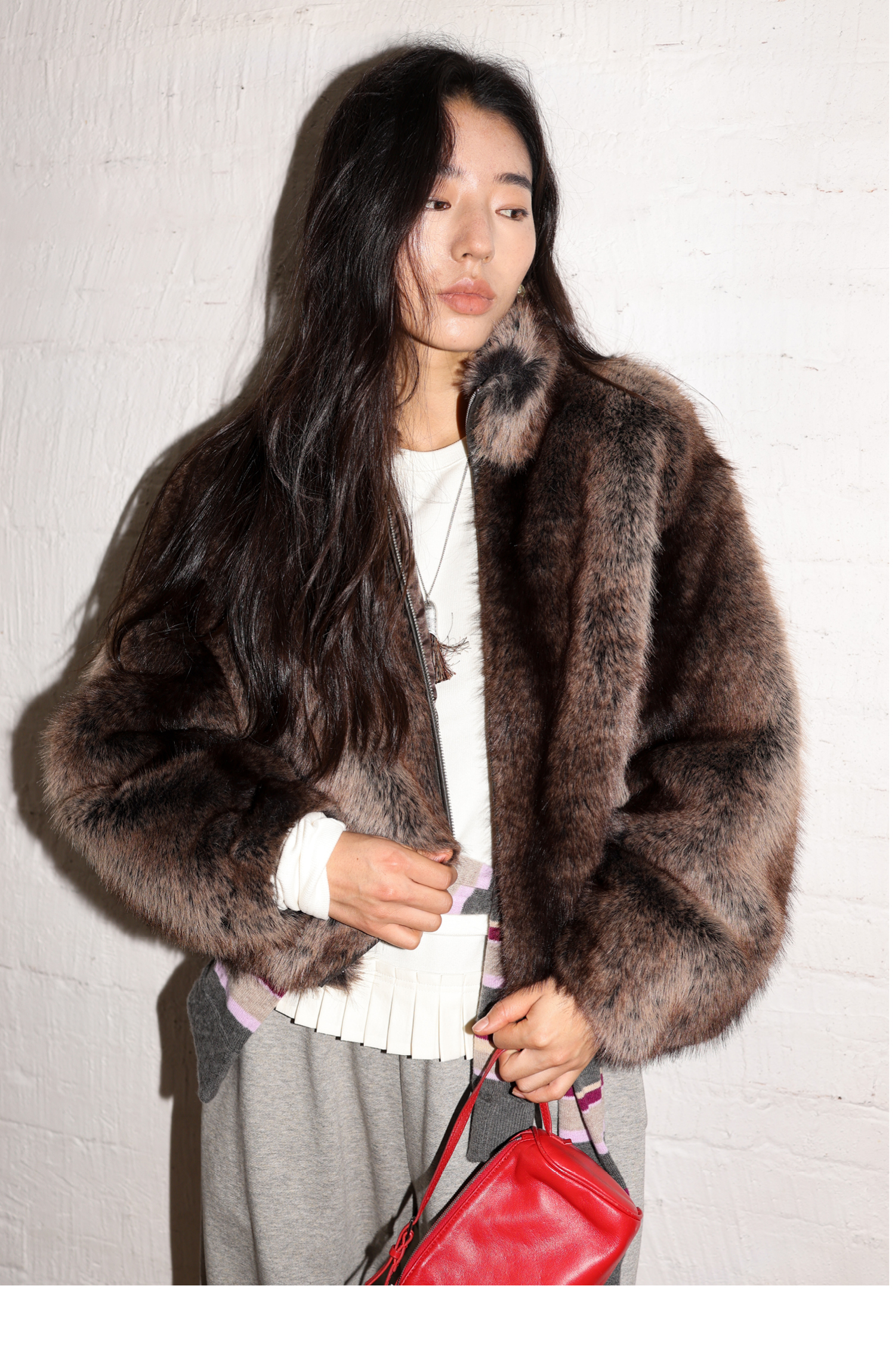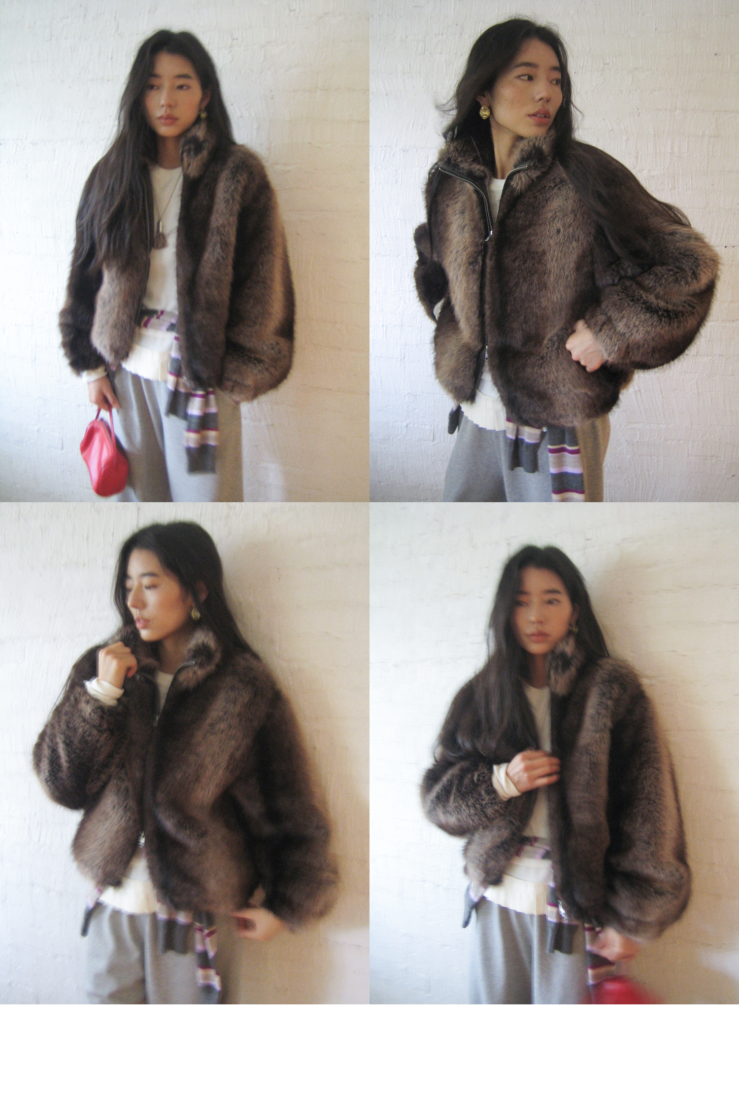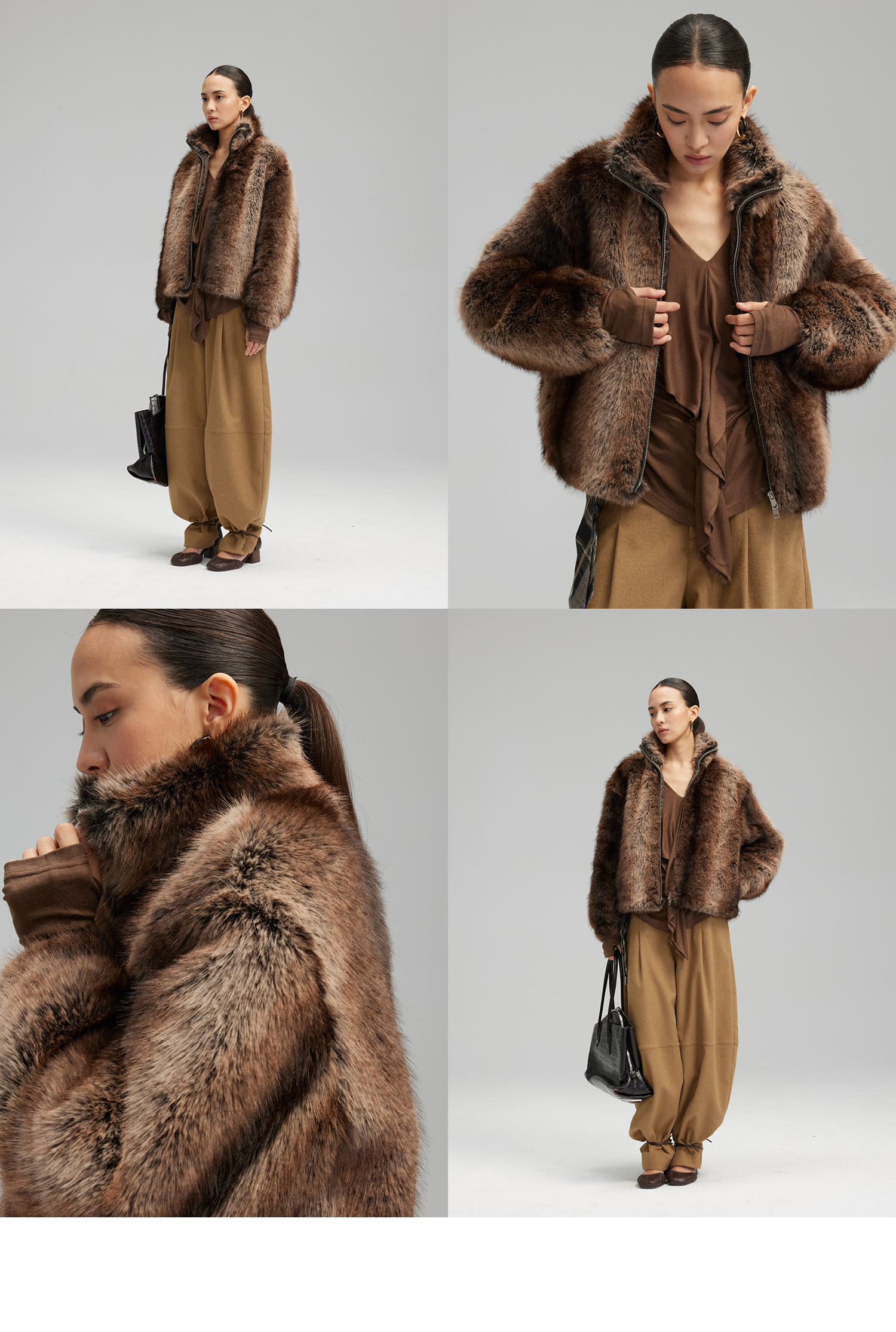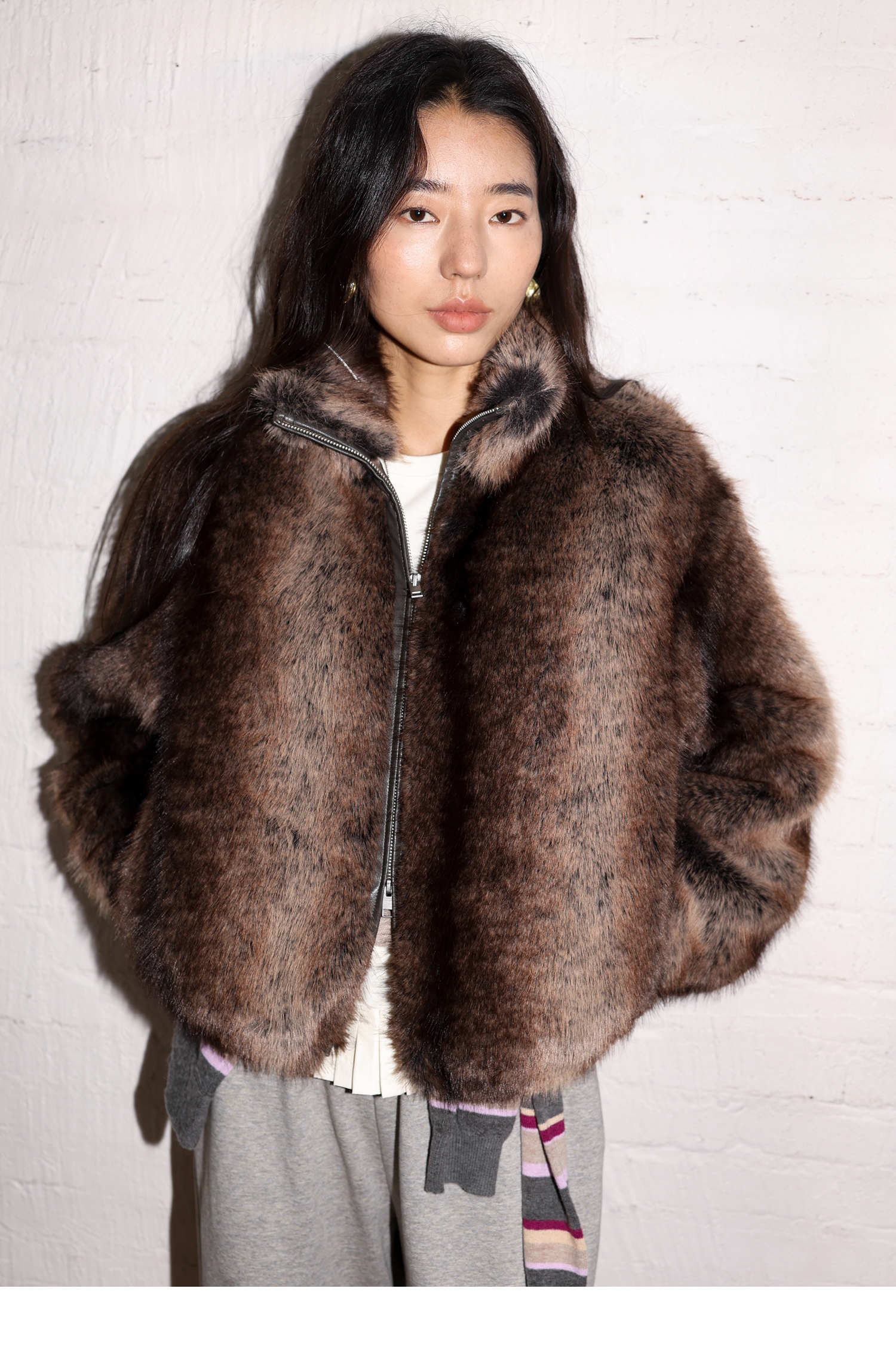 素舶 三色毛环保皮草浓密蓬松拼皮门襟立领拉链抽绳皮草短外套