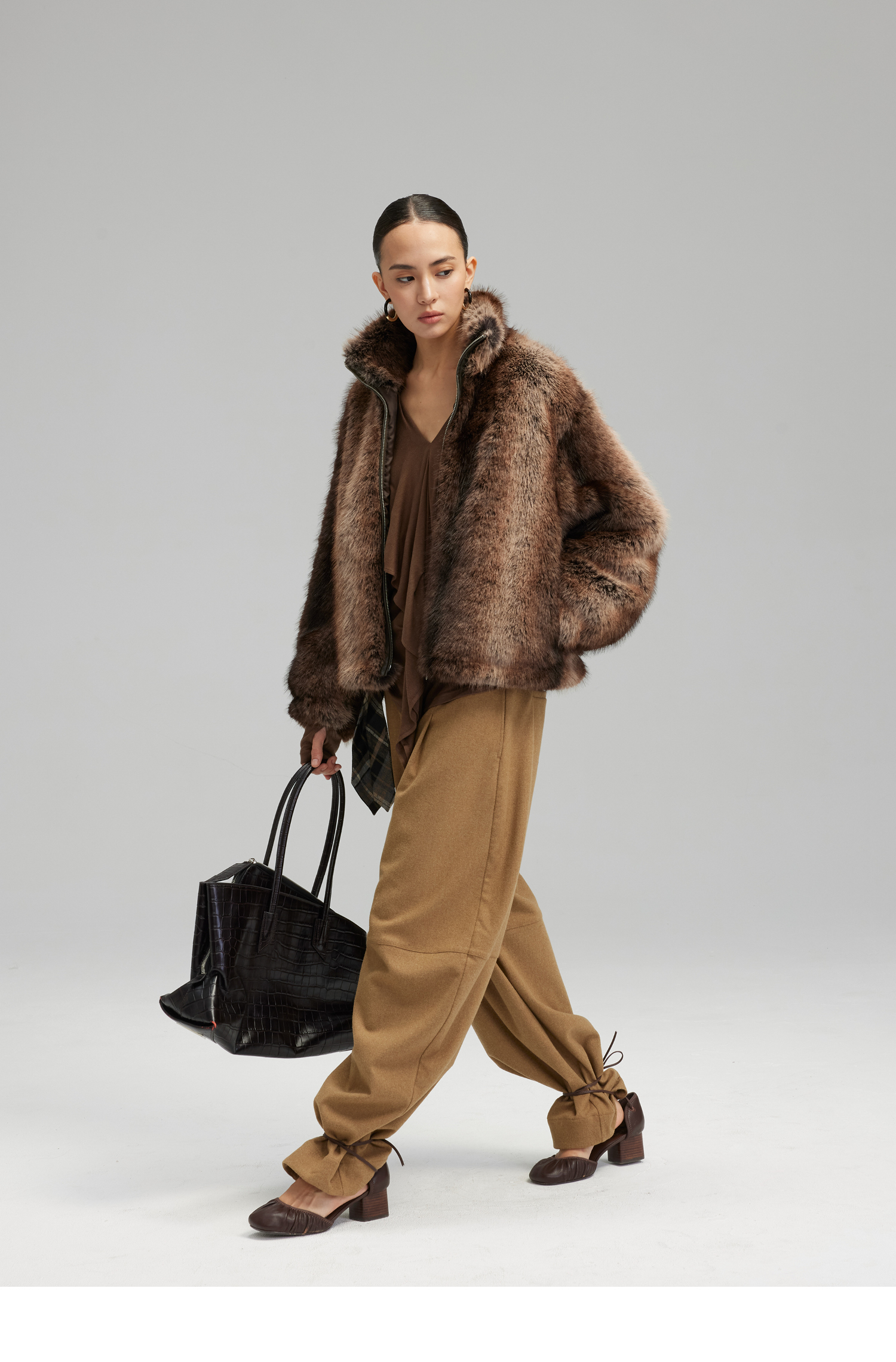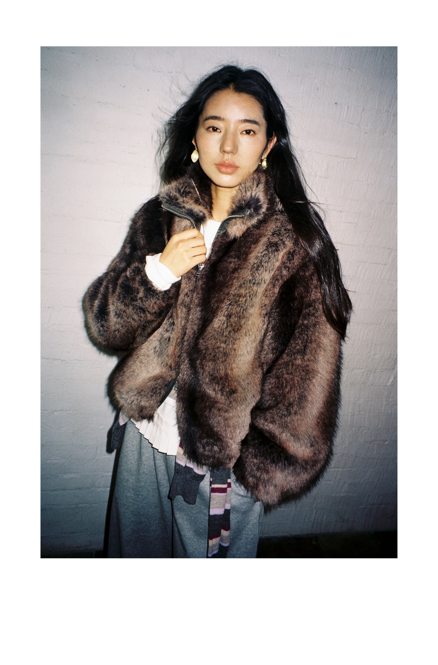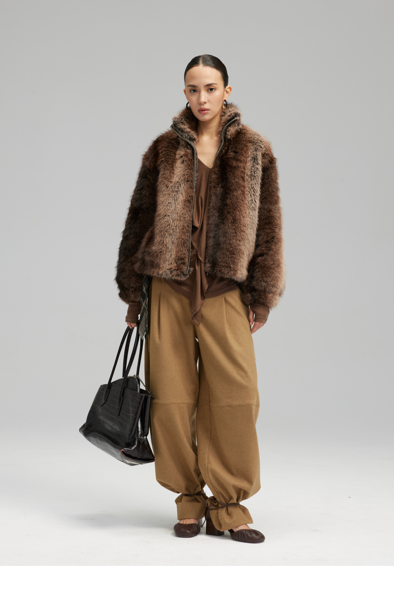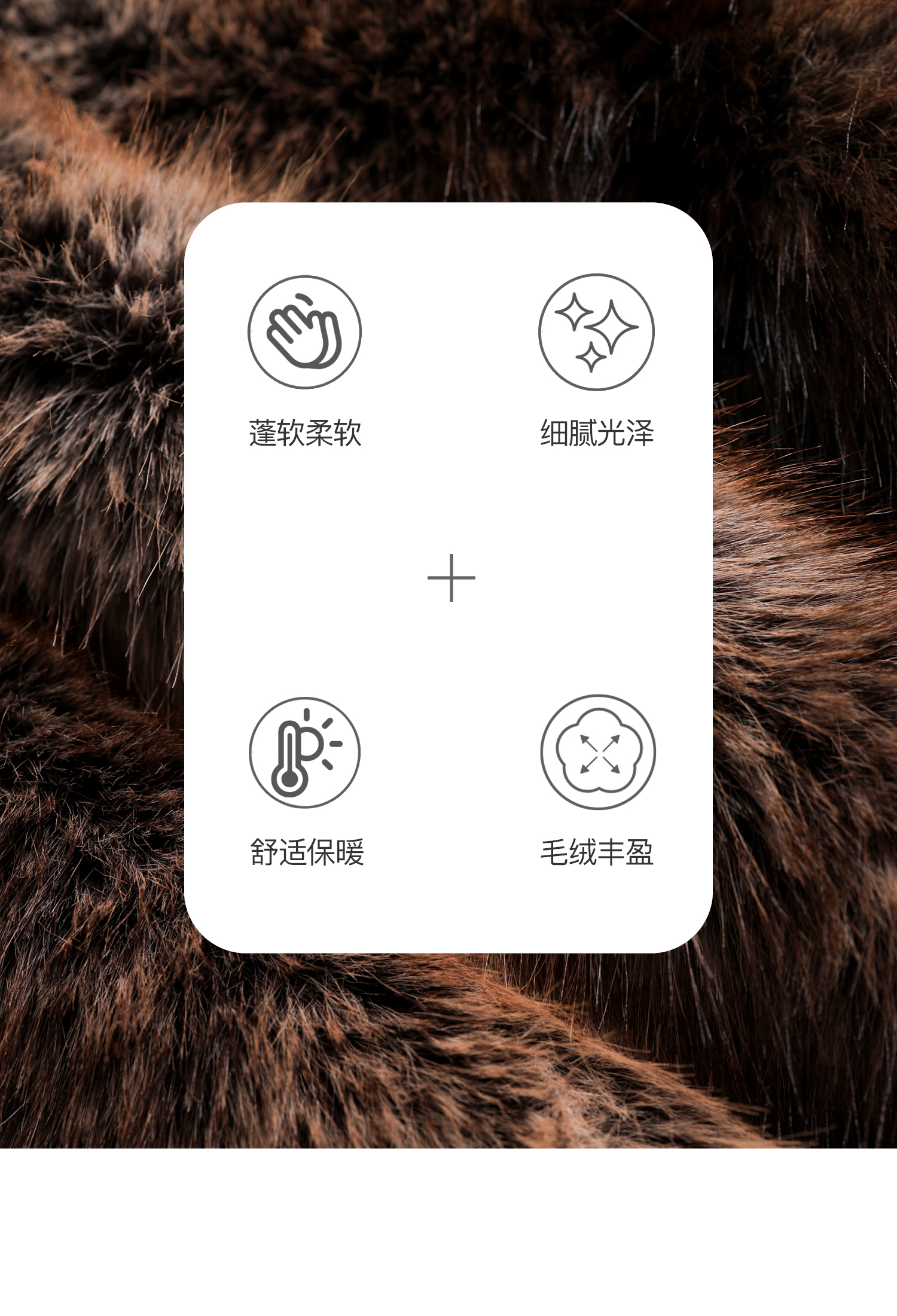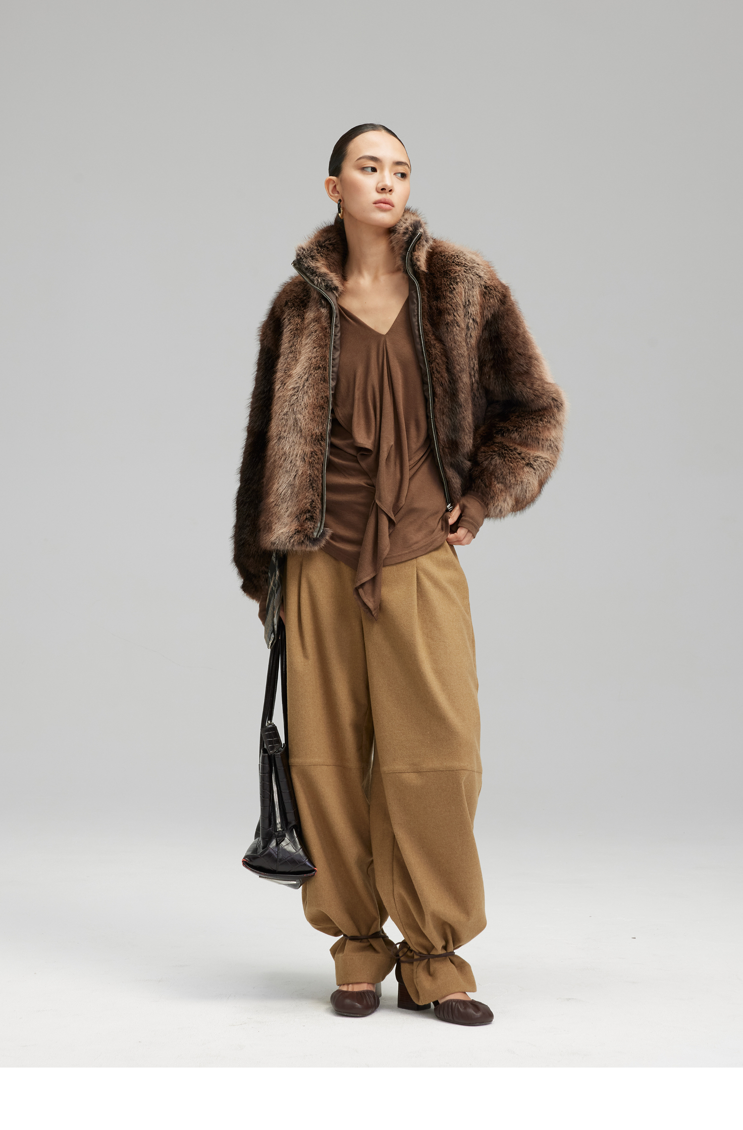 素舶 三色毛环保皮草浓密蓬松拼皮门襟立领拉链抽绳皮草短外套