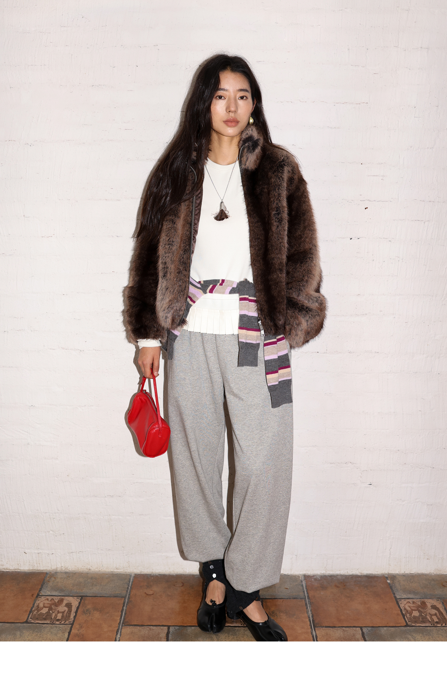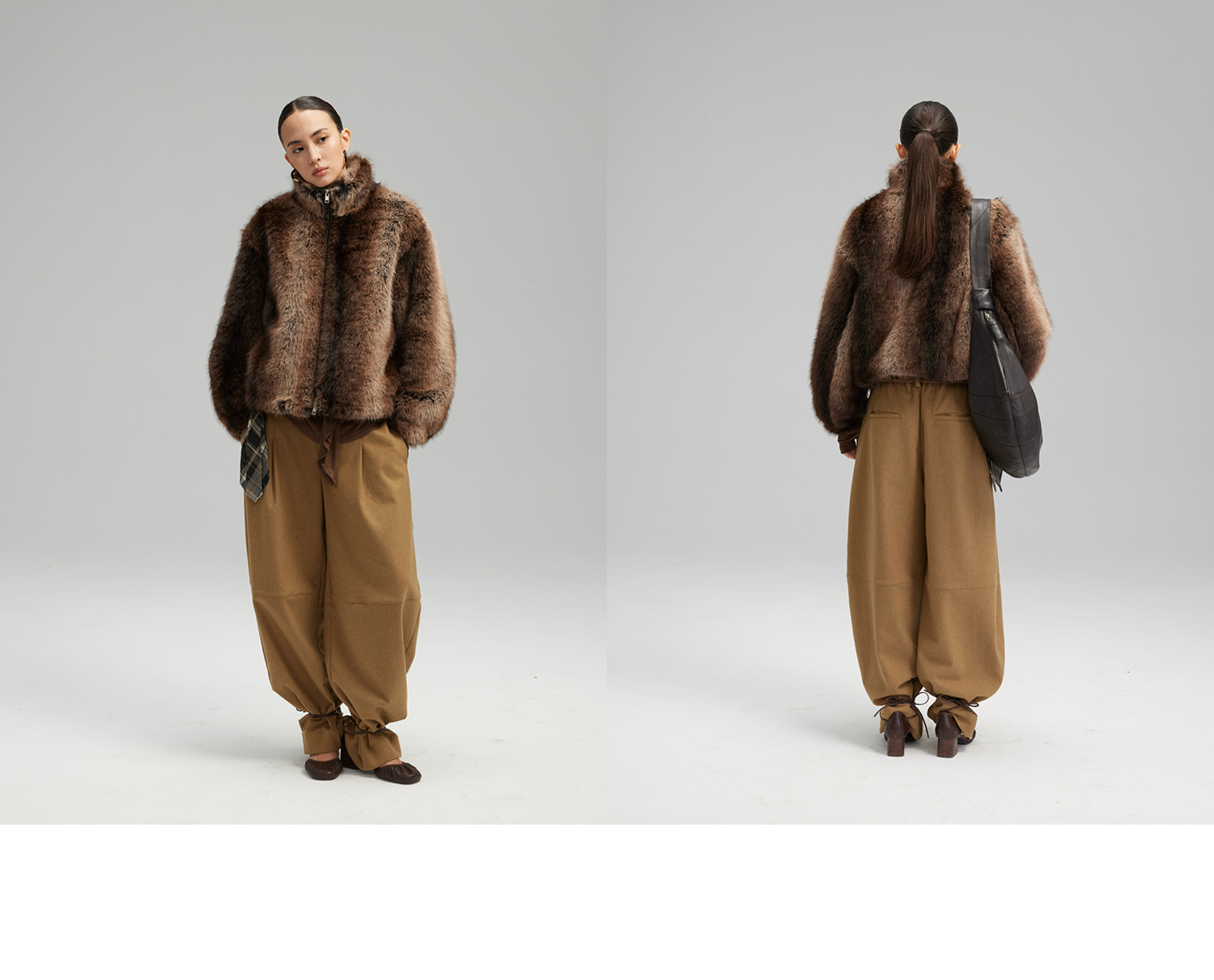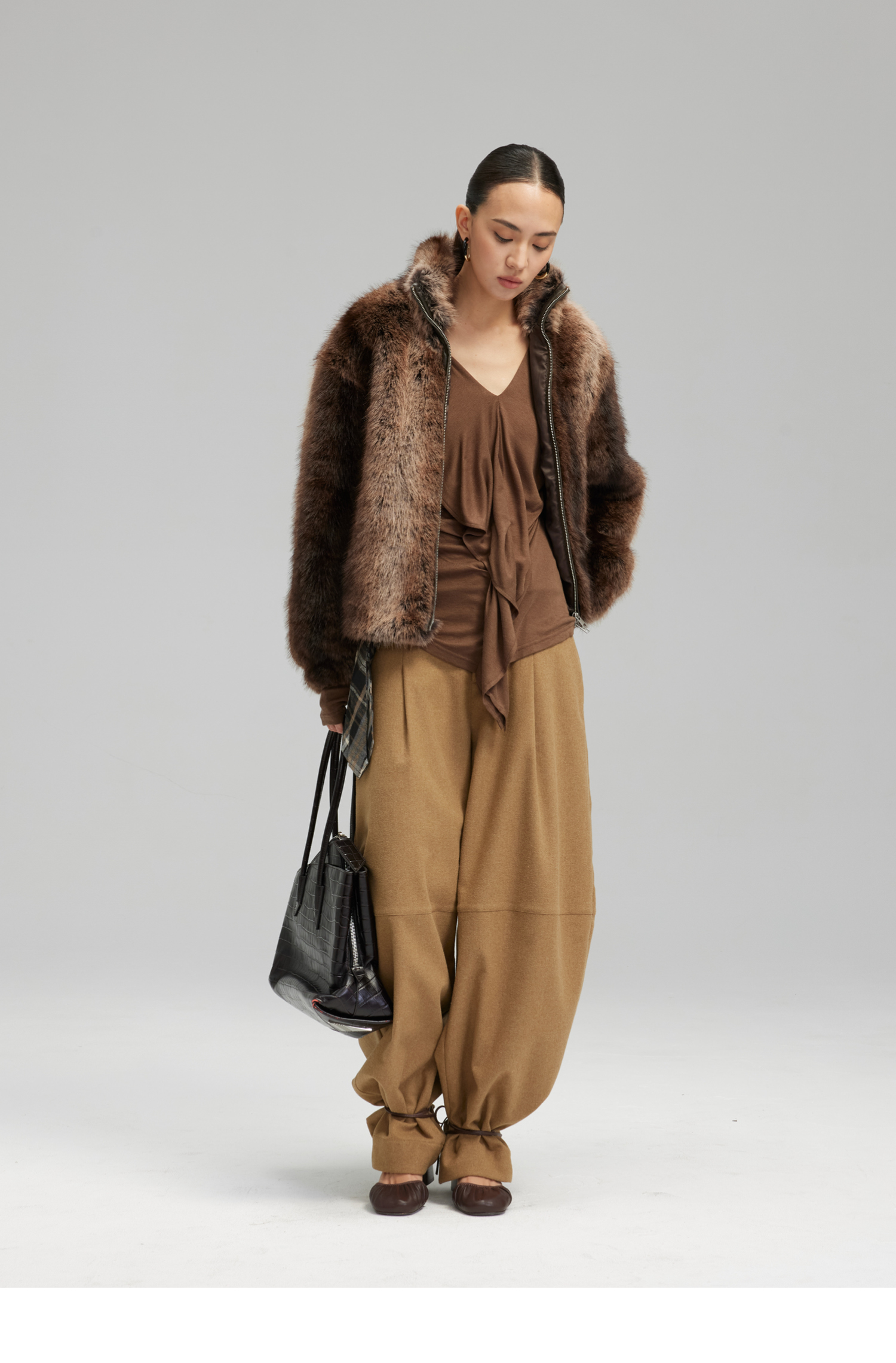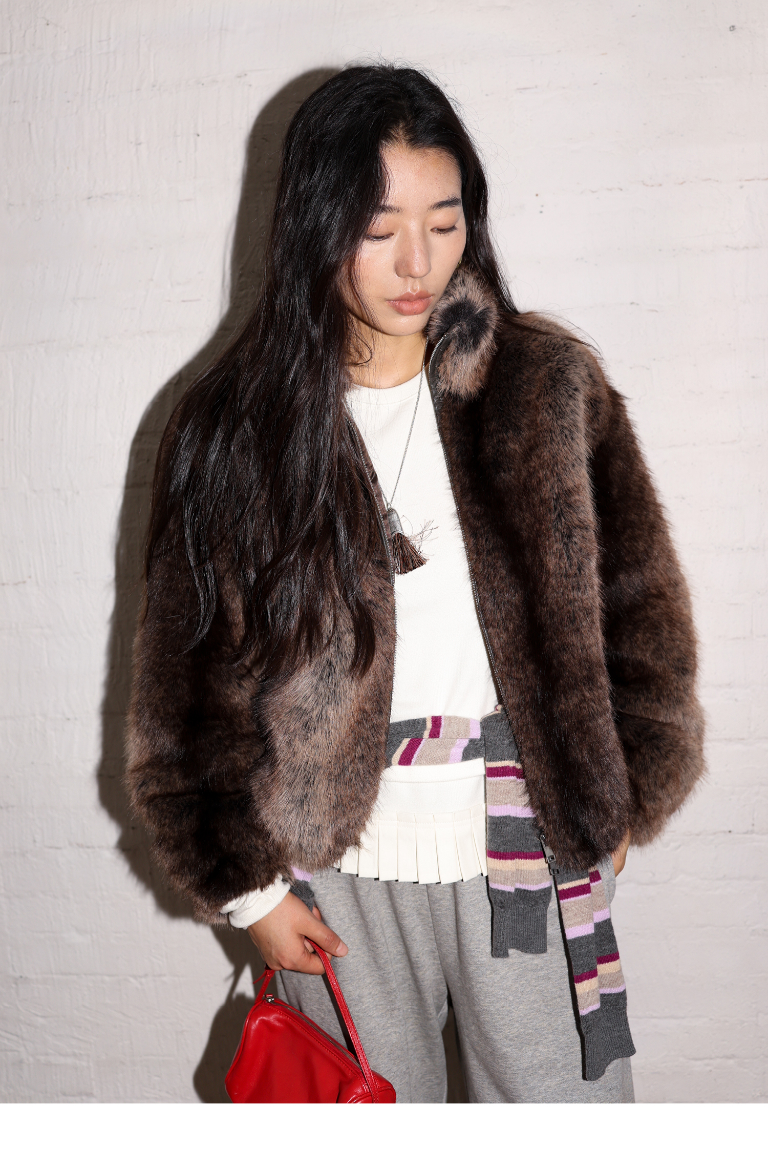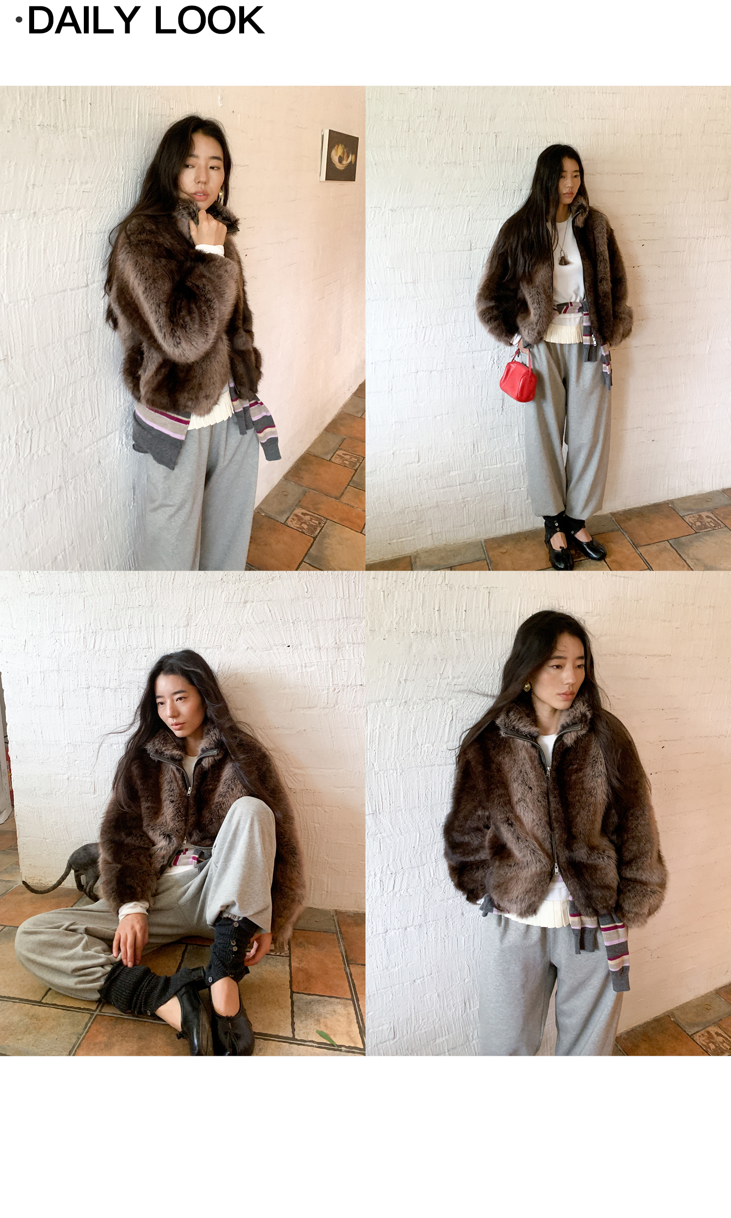 素舶 三色毛环保皮草浓密蓬松拼皮门襟立领拉链抽绳皮草短外套