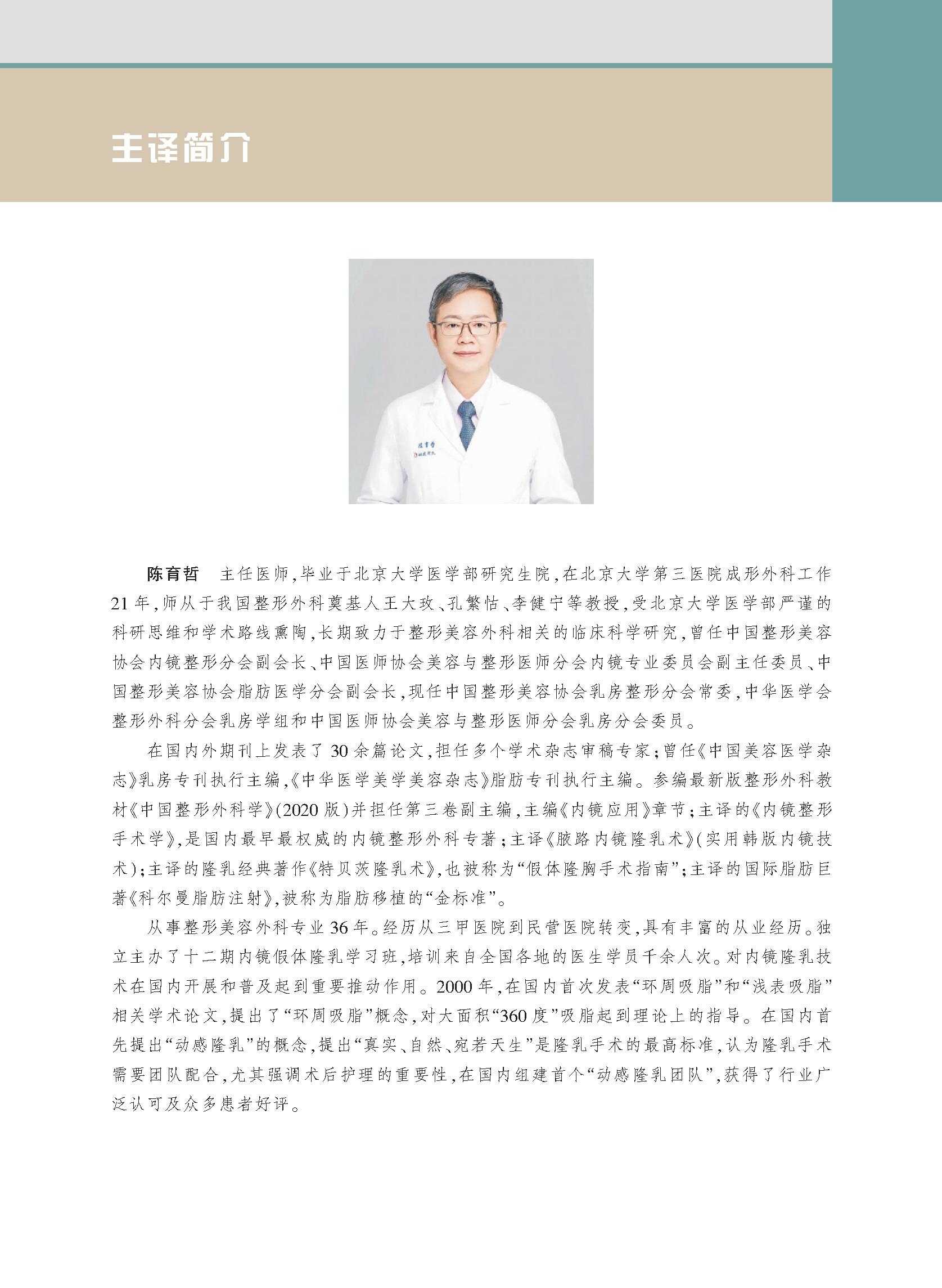 陈育哲,北京联合丽格第二医疗美容医院学科带头人,曾在北京大学第三医院成形外科工作21年,现任中国医师协会美容与整形医师分会内镜技术专业委员会副主任委员,中国整形美容协会内镜整形外科分会副会长,中国整形美容协会脂肪医学分会副会长,中国整形美容协会乳房整形分会常委,北京医师协会医疗美容分会常务理事,中国医师协会美容与整形医师分会全国委员,中国医师协会美容与整形医师分会乳房整形亚专业委员会委员,中华医学会整形外科分会乳房整形与再造专业学组委员,中国整形美容协会民营医疗美容机构分会常务理事,《中华医学美学美容杂志》脂肪专刊执行主编,《中国美容医学杂志》乳房专刊执行主编等。主译《特贝茨隆乳术》《科尔曼脂肪注射》、《内镜整形手术学》。