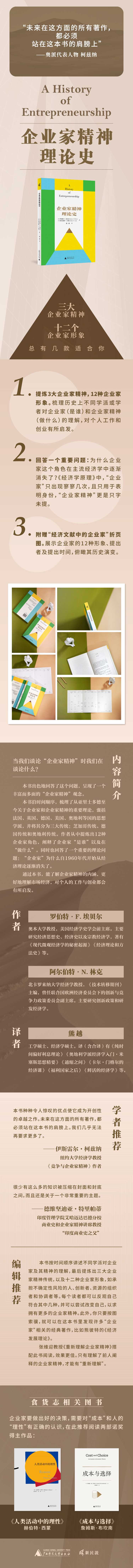 本书按时间顺序清晰讲述不同学派对企业家及其精神的理解,最后提炼出三大企业家精神传统,以及十二种企业家形象,如承担不确定性风险的人、创新者、资源的组织者和协调者等。每个读者都可以反观自己符合其中几种。并可以尝试改变自己,以求拥有更多的企业家精神。此外,你只要按图索骥,就可以在这本书里发现许多;企业家相关的经济学经典著作,比如熊彼特的《经济发展理论》。