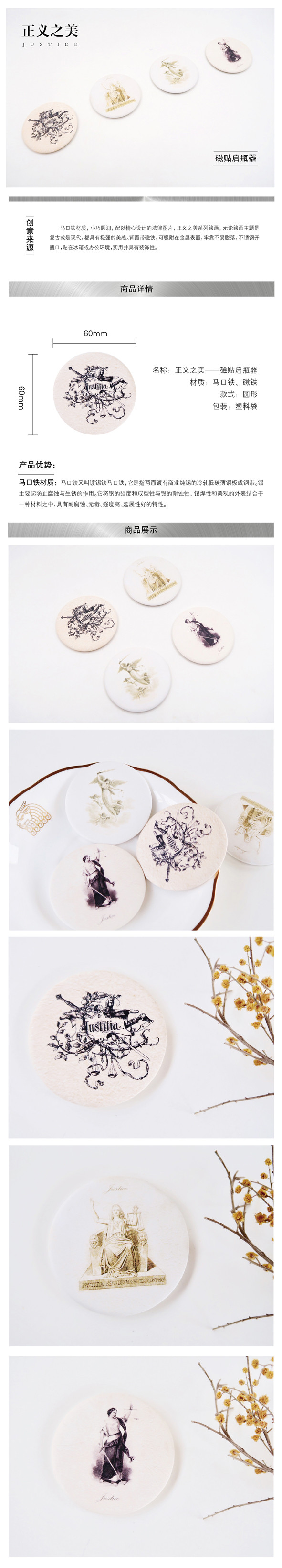 正义之美系列绘画的复古主题,具有极强的美感,可用于居家装饰或装点办公环境。采用独特别致马口铁材质,小巧圆润,背带磁铁可牢靠吸附金属面,加之不锈钢开瓶口的功用设计,可谓美貌与功用并重。