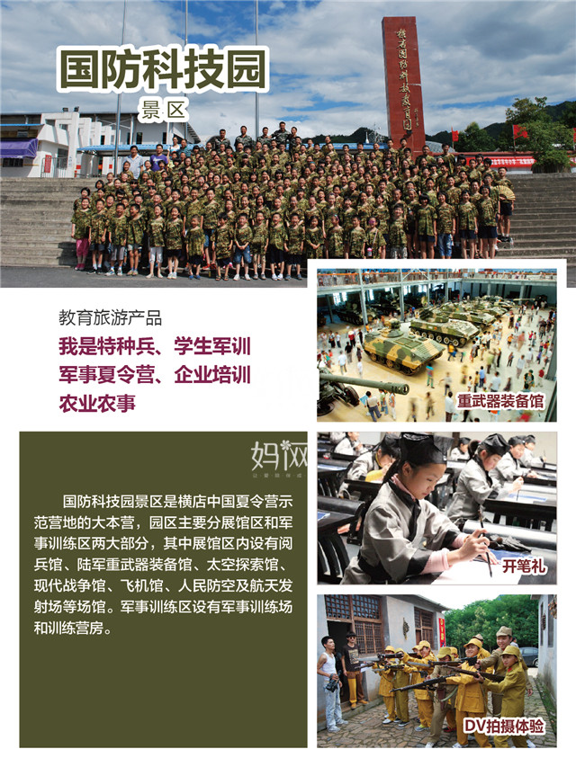 横店国防科技园景区以武器实物和模型为载体,充分展示我军在各个时期的武器装备及我国航空航天的发展历史。景区分展馆区和军事训练区两大部分,其中展馆区内设有阅兵馆、陆军重武器装备馆、太空探索馆、现代战争馆、飞机馆、人民防空及航天发射场等场馆。