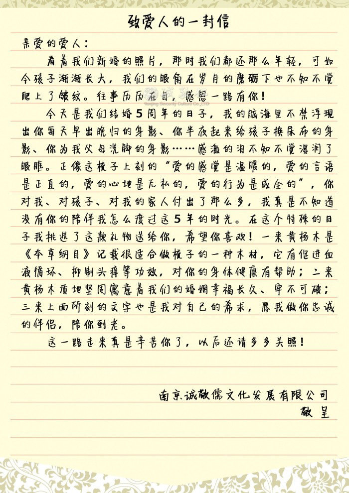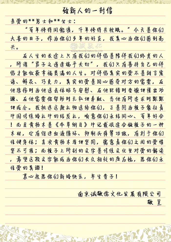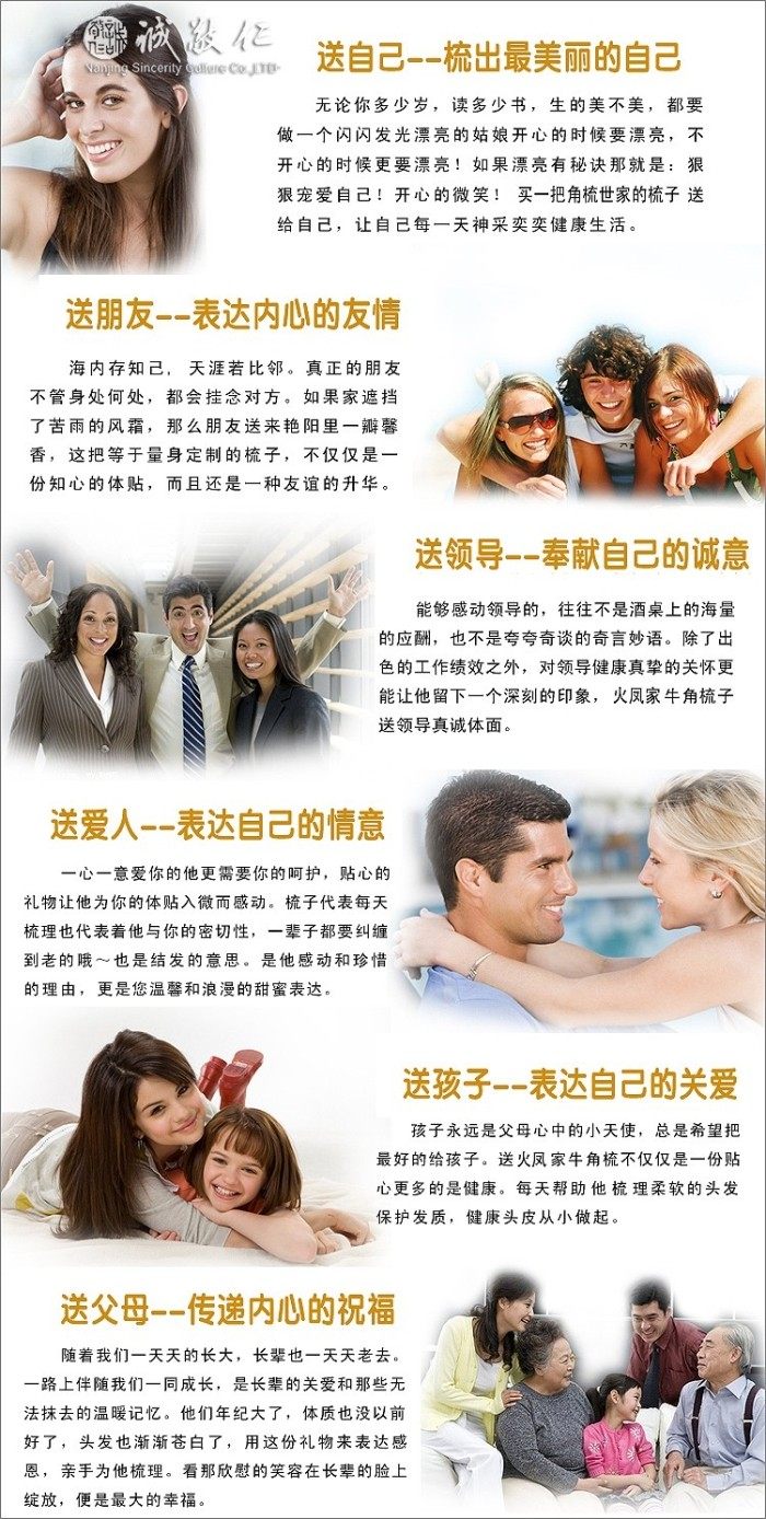 【基本信息】: 产品名称:“真实的爱”中国风黄杨木梳礼盒 产品规格:16.5*5.5cm,13.7*5.5cm,黄杨木梳各一把 产品包装:精美纸盒包装一只 产品材质:黄杨木 定 价:98元! 【产品介绍】: 木梳特点:产品最大优点是无静电,能有效刺激穴位,促进头部皮层血液循环,可畅通经脉,清脑提神,调整血气,对增强记忆,失眠,眩晕,脱发均有明显功效,实现了实用型与保健型的完美统一。因其独特的保健美肤功能。 适合人群:机关干部,白领阶层等脑力工作者和崇尚保健的中老年使用。 产品保养:天然头梳系顺纤维制作,忌摔、忌用力拉折,若遇变形可在温水中浸泡一定时间,然后加压数小时即可复原。 【产品文化】: 「 爱 」是个会意字,中间一个「 心 」,外面一个「 受 」,意思是说「 爱 」是用心去感受他人的付出和需要。当我们时时处处为他人着想,对方会感受得到,这样的感受一定是温暖的,而时刻想着他人的这份存心,自然是无私的,无私的心地流露出的言语自然是正直的,做出的行为也会是成全对方的。 【送梳子的意义】(可供参考) 1、表示送健康,快乐!把烦恼一扫而过,把心结打开,而且梳头会给人精神,带给人自信! 2、以梳为礼送父母:祝愿父母有如黄杨木般,身体永远健康硬朗!同愿子女对父母的孝心如黄杨木般坚定! 2、以梳为礼送长辈:祝长辈健康如意,福乐绵绵!五福常在! 3、以梳为礼送母亲:让妈妈梳尽三千烦恼丝,祝她快乐,永远年轻! 4、以梳为礼送老师:恩师教诲永铭记,祝天下老师身体安康,快乐开心! 5、以梳为礼送婚庆新人:愿她俩恩恩爱爱,意笃情深,爱情永恒! 5、以梳为礼可以送亲戚朋友、送长辈领导祝他们生意红火、五福临门、身体健康、万事顺意! 可作为企业福利礼品,送给员工父母。也适合作为母亲节、父亲节、长辈生日等礼品哦! |