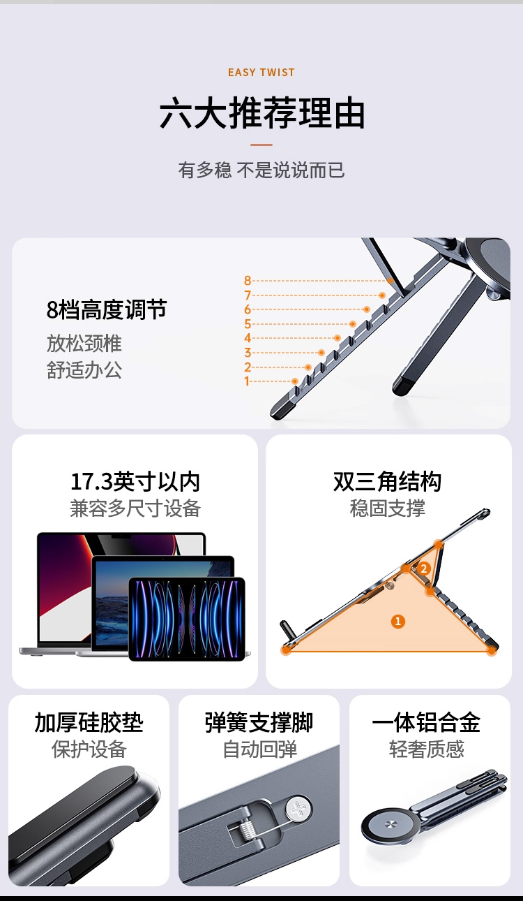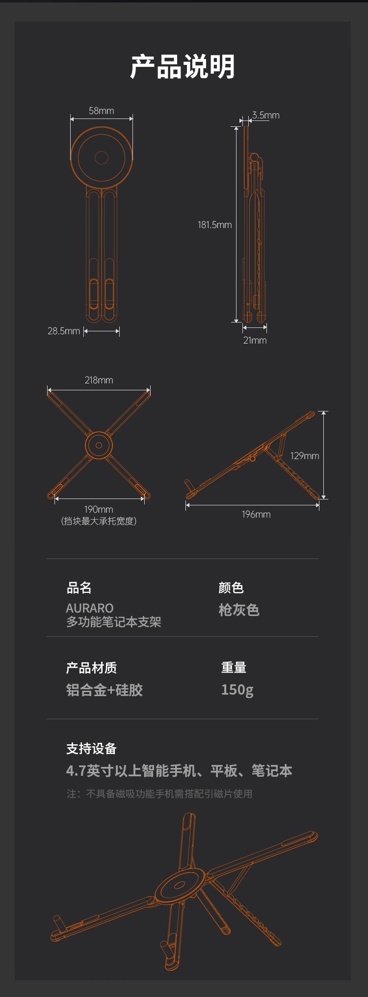 【品名】瑞士AURARO 多功能支架 笔记本电脑/pad/手机皆可用 可摆可手持 航空级铝合金材质高克重支撑稳 【规格】枪灰色 【产地】国内 【发货包装】独立包装 【发货地】广东 【发货快递】韵达、圆通、中通随机发 【不发货区域】新疆、西藏、港澳台 【发货时效】48-72小时,周末节假日顺延 |