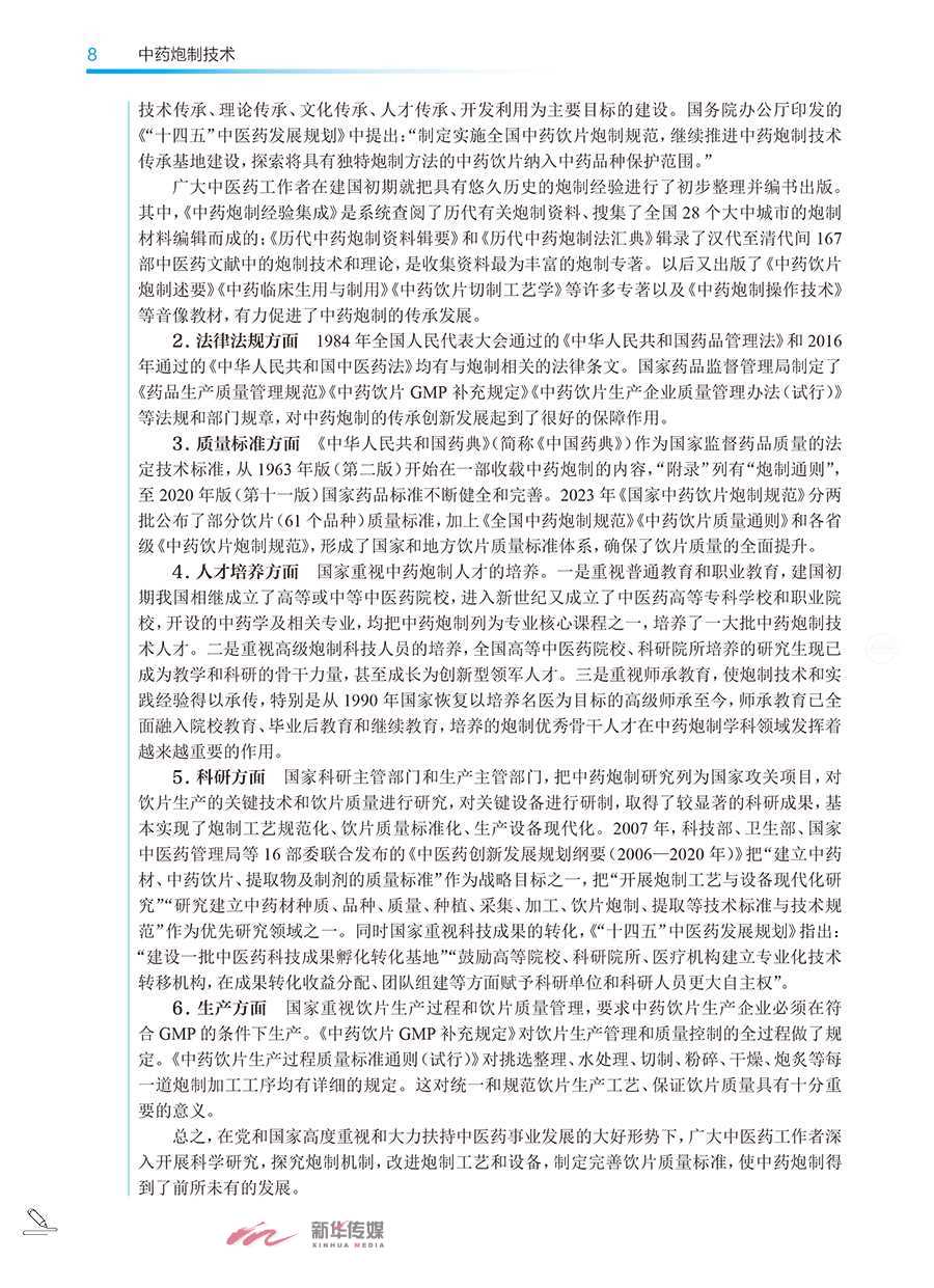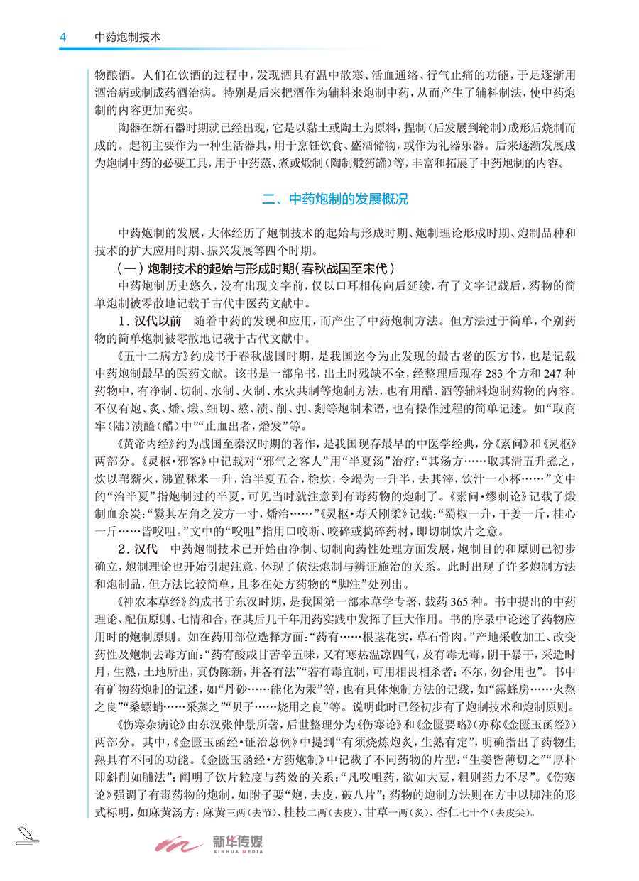 【前言】为贯彻落实党的二十大报告强调的;促进中医药传承创新发展,推动中医药高职高专教育高质量发展,培养高素质技术技能人才,我们依据高等职业教育专科中药学专业教学标准、中药学和中药制药专业人才培养方案和中药炮制技术教学大纲,编写了《中药炮制技术》(第5 版)教材。供全国高等职业院校中药学、中药制药等专业使用,也可作为中药炮制工国家职业技能鉴定和执业中药师资格考试的参考用书。本教材自2005 年第1 版至2018 年第4 版出版以来,在全国广泛使用,受到广大师生的一致好评。随着中药炮制技术的创新发展和《中华人民共和国药典》(简称《中国药典》)2020 年版的颁布实施,有必要对教材进行新一轮修订。人民卫生出版社从全国范围内遴选了优秀的编者,对前四版的编写和使用情况做了充分调研,保留了原有的优点和特色,同时将思政元素、《中国药典》新增内容、炮制技术保密管理、炮制研究新成果纳入本教材,使教材的思想性、科学性、创新性、启发性和先进性更加突出。全书分为上、下两篇。上篇为基本知识与技能,分4 章叙述了中药炮制的基本理论、基本知识和基本技能。下篇为炮制技术部分,分11 章系统介绍了276 种中药的处方用名、来源、炮制方法、性状、炮制作用、炮制研究、贮藏等内容。书后附有实训指导、主要参考书目、药名索引、教学大纲等,便于读者学习或查阅。本版教材有四大特色:一是编写体例上,将传统炮制技术与现代新技术有机衔接,知识技能突出重点,技术技巧突出特色;二是编写内容上,主要收载《中国药典》2020 年版一部及四部的药材和饮片、成方及单味制剂中的处方品种和炮制方法,并用;*号标注,以利于学习时把握重点;也从国家和各省级中药炮制规范中选取代表性饮片品种和炮制方法,但不标;*号以示与药典区别;三是技术传承上,编录了与教材配套的炮制操作技术音像教材(另行出版),选取了部分视频操作植入本版教材,以随文二维码的形式呈现,通过扫码即可观看;四是数字资源上,与纸质教材相融合,扫描二维码可学习每章的教学课件、思维导图及重点难点、知识测试等内容。本教材修订过程中,我们得到了人民卫生出版社、各参编单位和全国兄弟院校的大力支持和帮助,查阅了国家有关法律法规及饮片质量标准,参考了古今许多文献资料,在此一并表示衷心的感谢。为了打造精品教材,编写组老师精诚配合,对文稿句句推敲,反复审校。但由于业务水平所限,书中可能存在不足之处,敬请专家和读者提出宝贵意见,以便进一步修订和完善。《中药炮制技术》编委会2023 年4 月