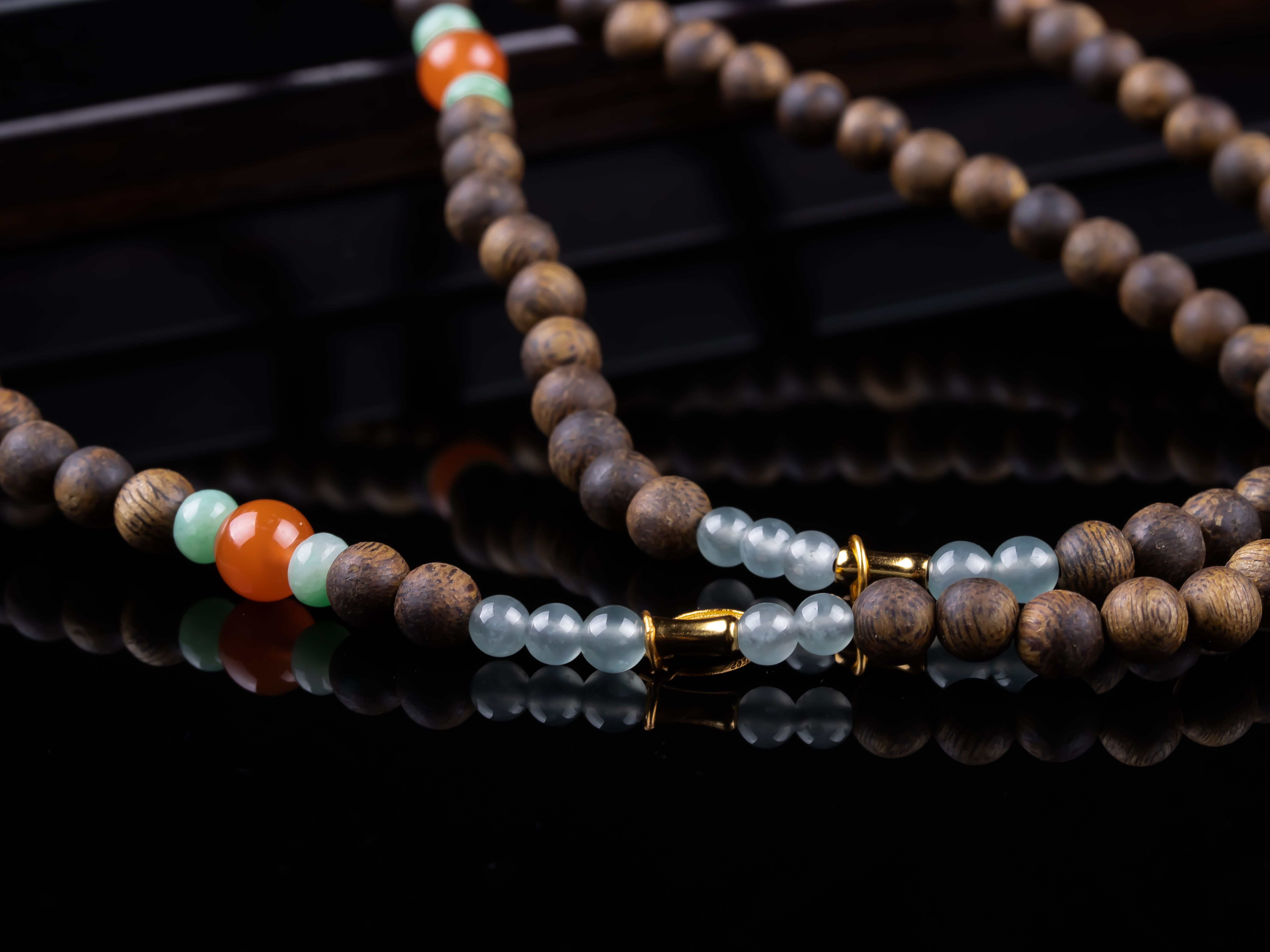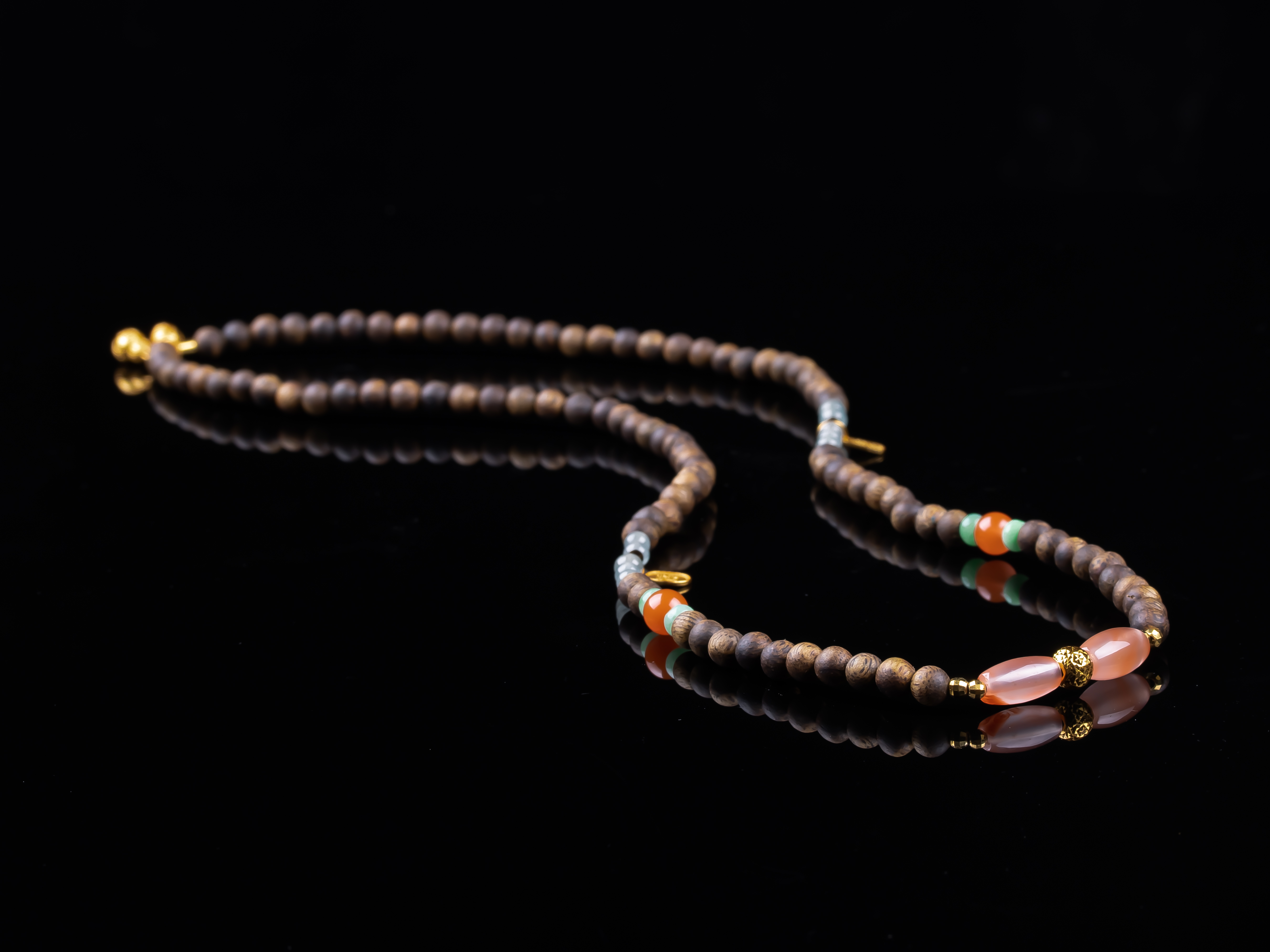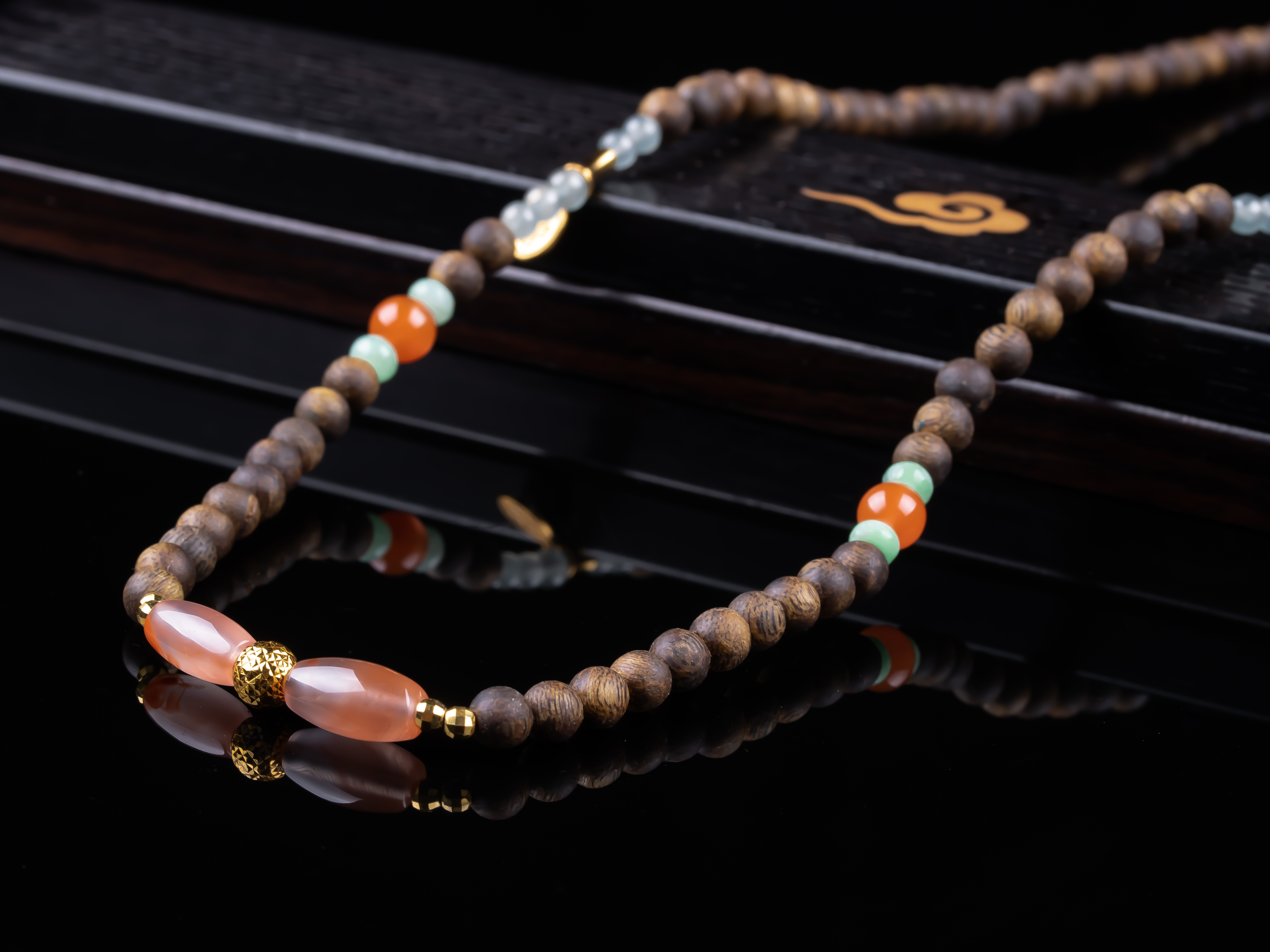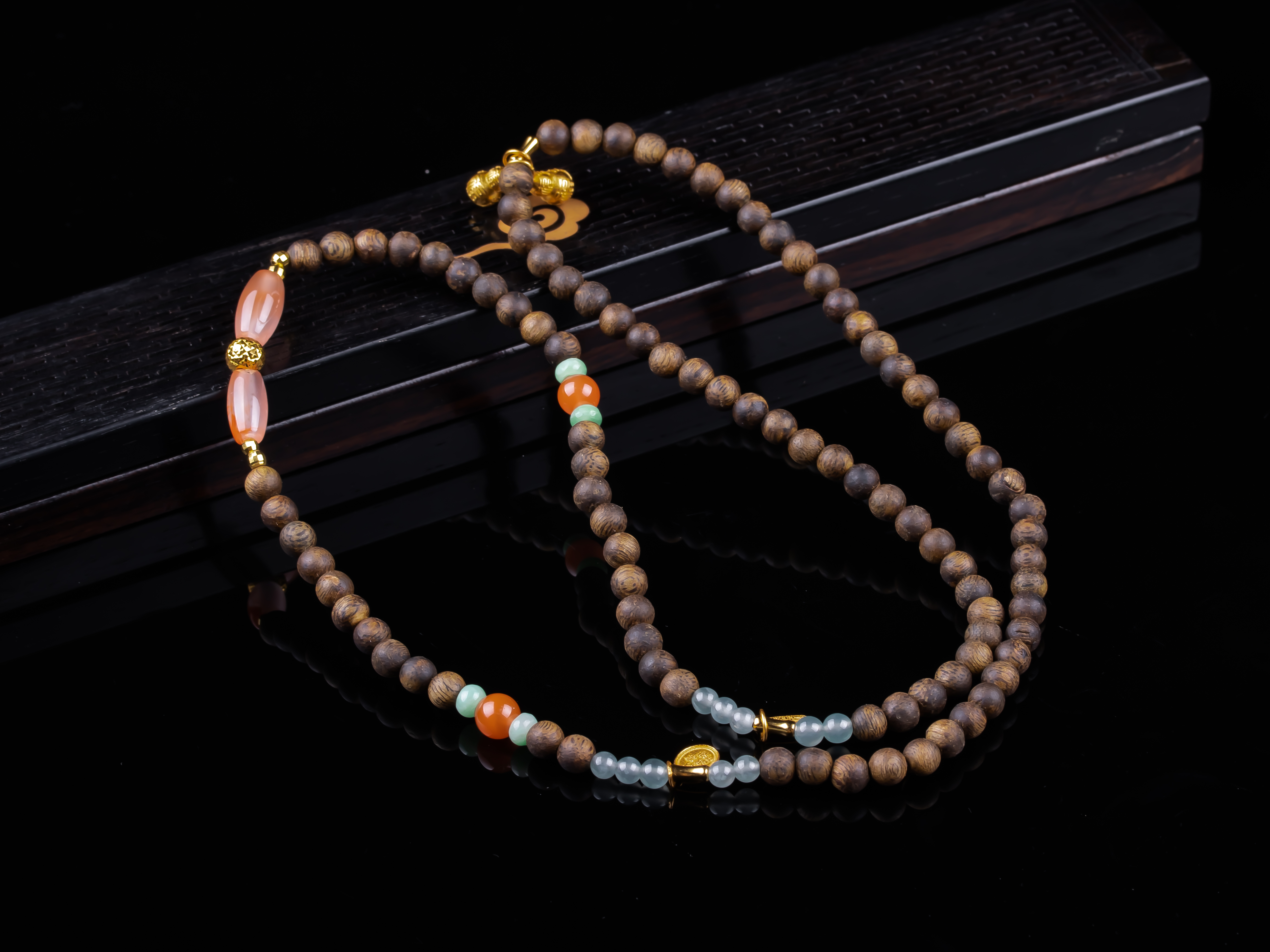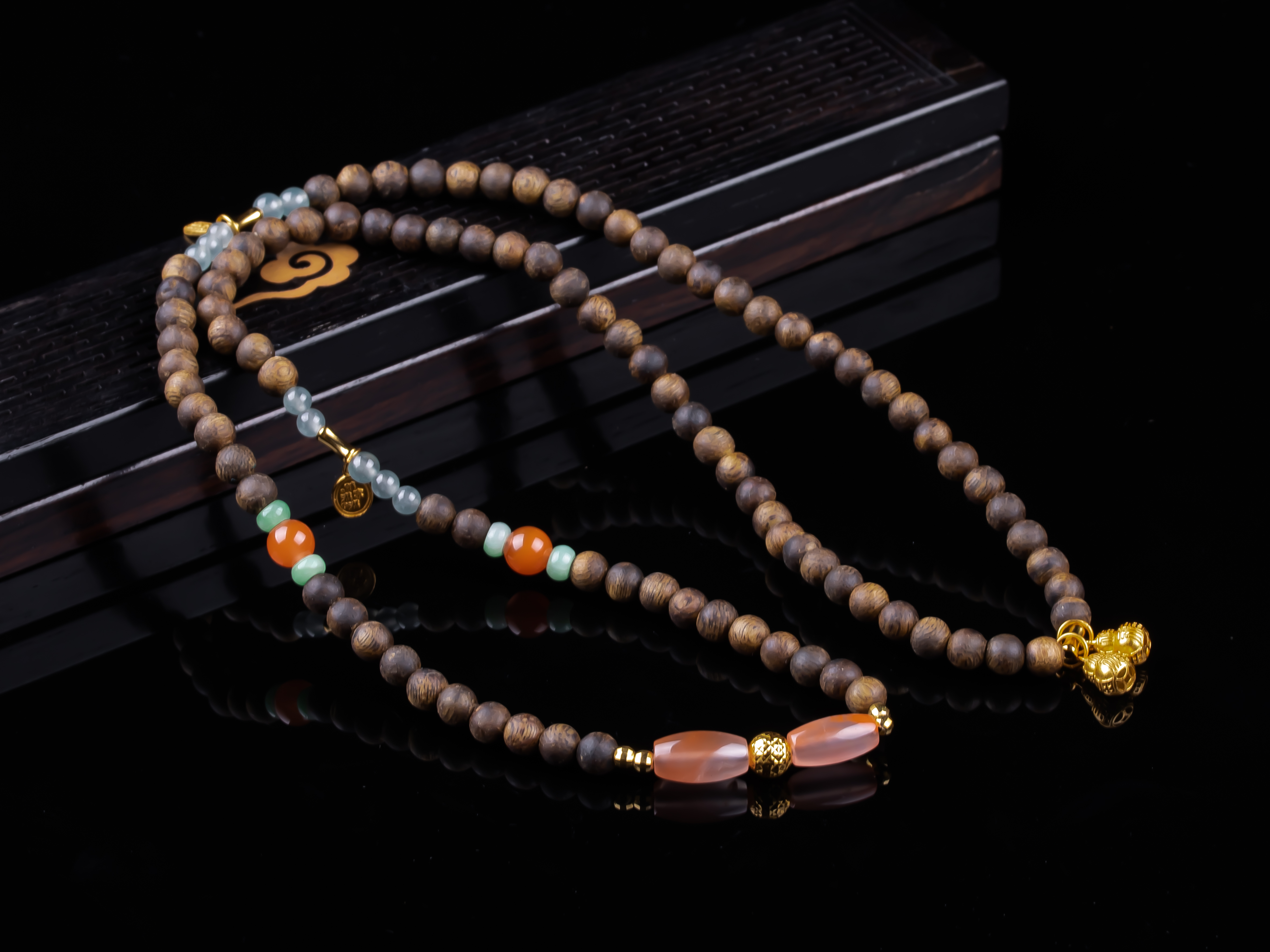 XY0220沉香+翡翠南红双葫芦项链多圈,天然沉香,原色原味,香味自然清甜,一端为双冰飘南红,一端是925银镀金的双葫芦小提溜,中部是翡翠与银竹节穿搭挂的两个小坠子,款式搭配丰富多样,可做项链、可作多圈手链,生活多彩,福禄常伴。