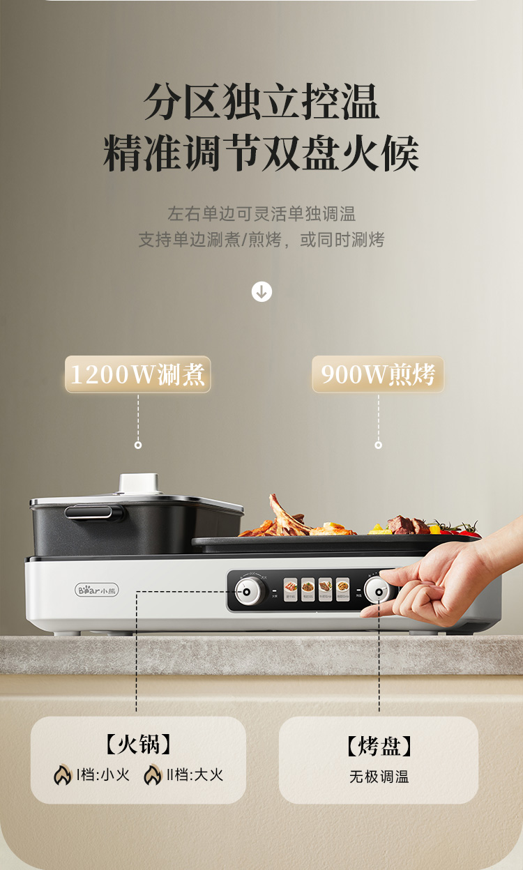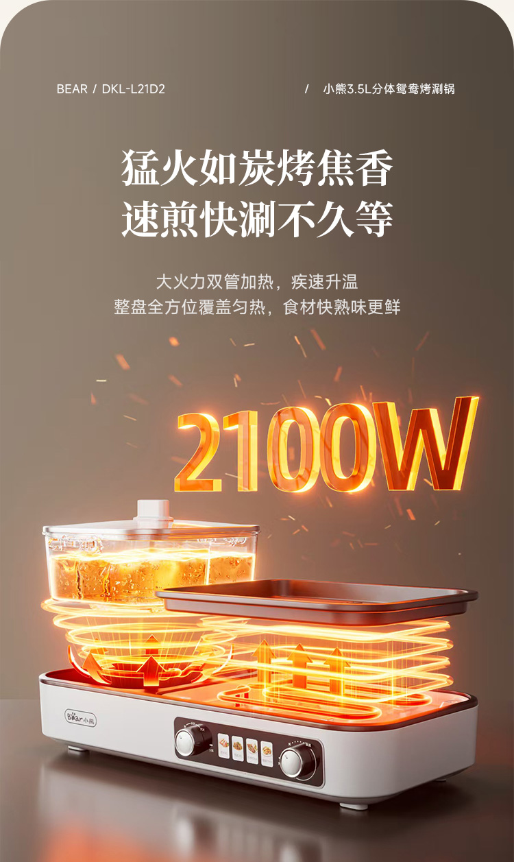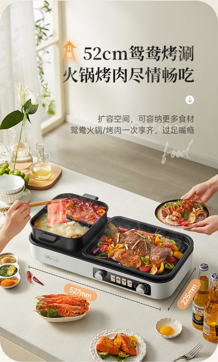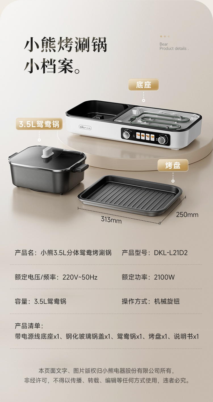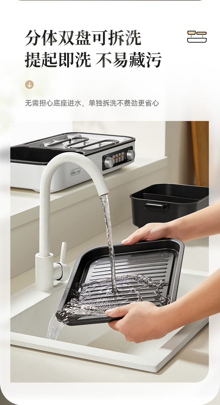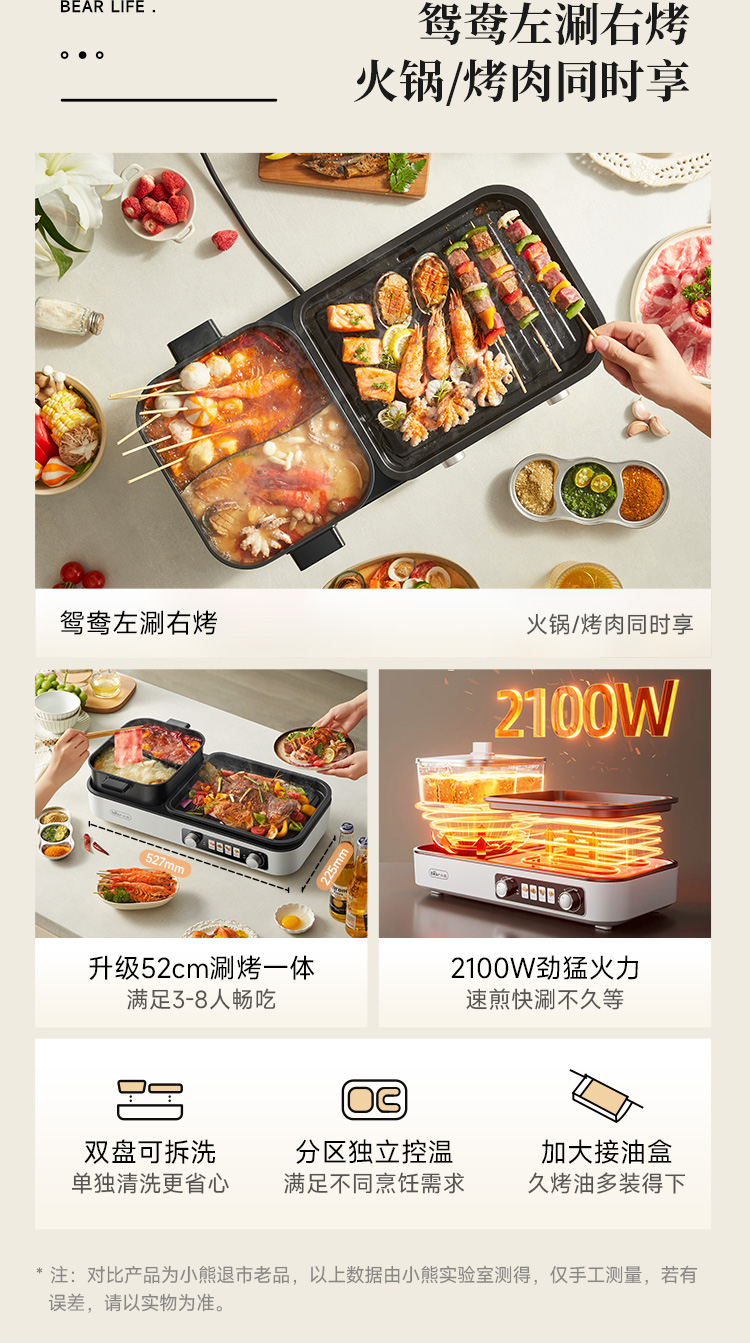 小熊(Bear)烤涮一体两用锅 烤肉锅电烤盘 家用电烧烤炉火锅烤肉一体多功能锅 鸳鸯锅分体可拆洗分区控温L21D2