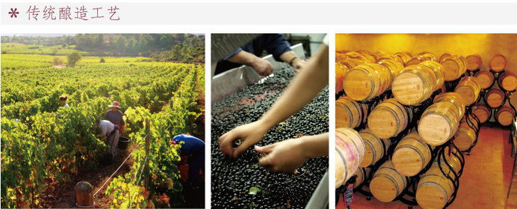 全部选用当地农场种植的歌海娜、佳丽酿葡萄,手工采摘、筛选,借鉴法国传统工艺和多年的酿造经验精心年造而成。