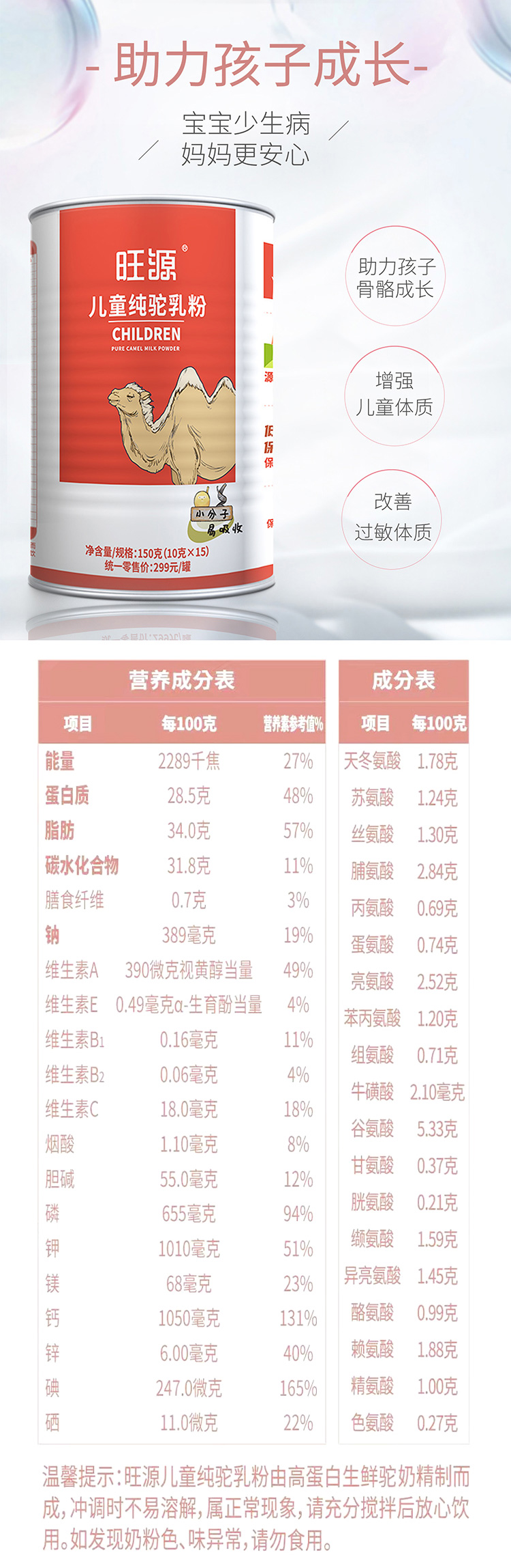 品名:新疆旺源儿童纯驼乳粉 【有机认证】 配料表:纯骆驼生鲜乳 成分含量: 驼乳固体含量>99.9% 生产许可证编号:SC10565432300125 产品标准号:DBS 65/014 单瓶净含量: 150g 是否为有机食品: 是 保质期:540 天 厂名:新疆旺源驼奶实业有限公司 |