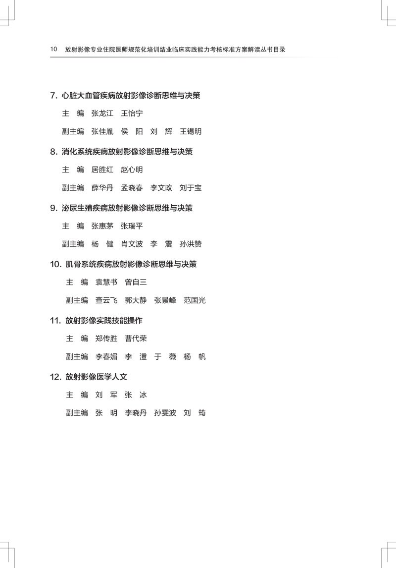 该丛书将由中国医师协会放射科医师分会候任会长梁长虹为第一总主编,中国工程院院士王振常为第二总主编,中华医学会放射学分会前任主任委员金征宇为第三总主编。中国医师协会放射科医师分会常务委员及委员担任分册主编。丛书共分为12个分册,各分册分别对应建立相应的题库(临床阅片实战场景、视频操作和专家视频解读)。内容围绕:放射诊断基本功、放射诊断报告书写、临床思维与决策、实践技能操作和临床医患沟通。其中临床思维与决策是核心问题。 本套书的第4到第10分册依系统分类,根据疾病的发病特点,分列不同的章,不同的章下分列不同的疾病病例。每一病例包括题目(临床资料,影像检查图,问题)、答案、结构化评分表。病例库内容包括病例全套的DICOM图像 + 病例讲解。