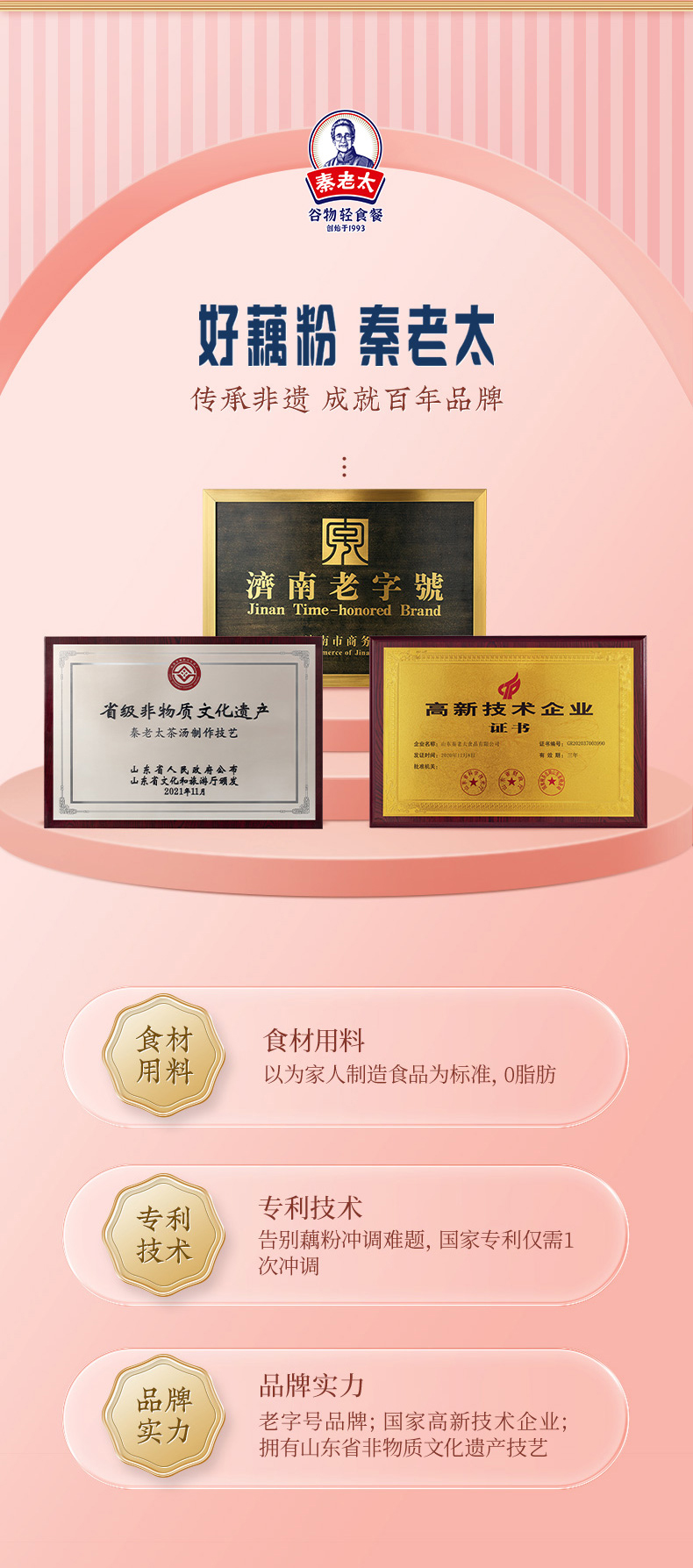 秦老太创始于1993年,专注谷物轻食餐。秦老太茶汤,2012年被正式授予非物质文化遗产。进入新时代,秦老太人怀揣匠心精神,以 “为家人制造食品”为理念,传承中华食养文化!