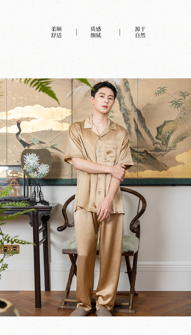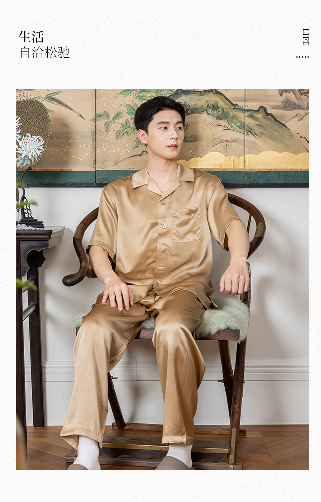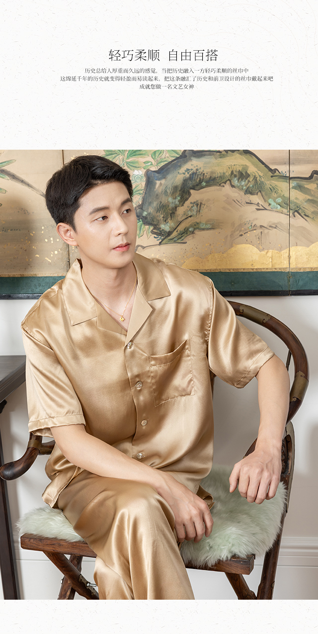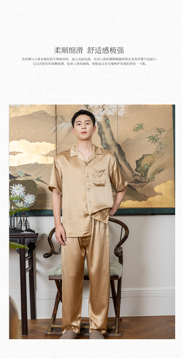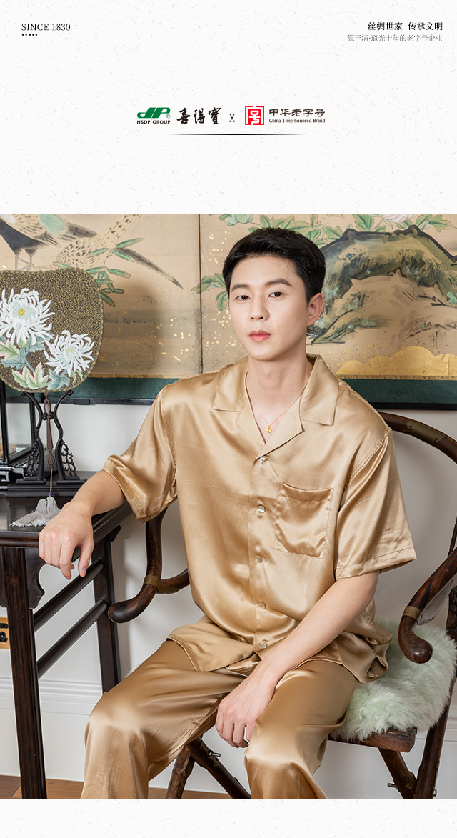 喜得宝100%桑蚕丝男士短袖重磅真丝纯色睡衣简约