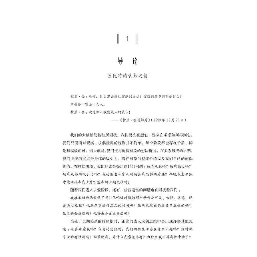 我们的大脑始终被性所困扰。我们要么在想它,要么在考虑如何得到它。我们只能面对现实:求偶世界的规则并不简单。每个阶段都会存在矛盾、悖论和模棱两可。结果就是,我们被与配偶有关的想法折磨。在关系形成的早期,我们关注的重点是身体的吸引力、潜在对象的整体价值以及我们自己的配偶价值。在择偶阶段,我们经常会提出这样的问题:她喜欢我吗?她有魅力吗?她有足够的吸引力吗?我的朋友和家人对她会有怎样的看法?今晚我怎么做才能让她和我上床?能和她长期交往吗?随着我们进入求爱阶段,还有一些普遍性的问题也在困扰着我们:我准备好和他做爱了吗?他吃饭时做的那个动作是可爱、古怪、善意,还是恶心至极?他总是穿那种款式的衬衫吗?他所表现出的善良是真诚的吗?他真的会戒烟吗?他将来会是成功者吗?当处于长期关系的阵痛期时,正常的成人求偶思维中会出现许多其他想法:他真的爱我吗?我真的爱他吗?我们的性生活存在什么问题吗?他对那个女的有性趣吗?如果没有,为什么我感觉他有?为什么我不再有性冲动了?为什么我再也不觉得他有意思了?他还觉得我性感吗?我到底性感吗?我希望他能多关心关心我和孩子们。这周的三次商务应酬他真的非去不可吗?为什么他总是要和她;谈公事?人类的求偶行为很复杂。求偶心理涉及情绪、生理反应、强烈(通常无法控制)的冲动,以及许多认知机制的复杂组合。毫无疑问,在你的生活中,无论是旁观,还是参与求偶过程,很多时候,你只能无可奈何地摇头。不管你信不信,理解诸如此类的许多求偶难题还是有希望的。从人类进化起源的角度研究人类求偶行为的现代科学家,业已建立了一个理解求偶过程的框架,这一框架带来了有关我们求偶心理本质的海量成果。最近,求偶行为研究者发表了普遍具有吸引力的人类面孔特质、具有吸引力的人类行为特质、造成人际关系冲突的因素、导致人际关系出现攻击和敌意的变量、激素水平对求偶行为的影响,以及人类求偶行为中许多其他令人费解的问题。简而言之,进化心理学正在揭开非洲大草原上智人出现之前就已经存在的求偶行为的神秘面纱。正如你将看到的,进化赋予了我们某些心理机制,只要在适宜的环境中得到充分发展,就能帮助我们应对令人着迷而又复杂的求偶问题。尽管人类与低等动物有着许多共同的本能,但我们解决复杂问题和反思的能力是独一无二的。与许多其他物种不同的是,我们人类并不会仅仅因为互相看对眼,看到自己喜欢的身体,就与对方发生性关系。当然,在任何情况下,这都不是典型的行为。相反,对于我们这个物种来说,求偶行为通常包括大量高水平的有意识和无意识的认知努力。因此,智力在求偶领域中发挥着重要作用。