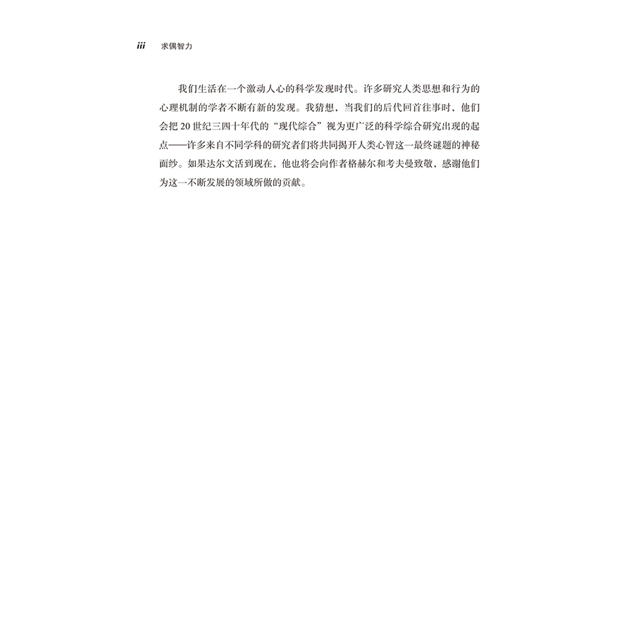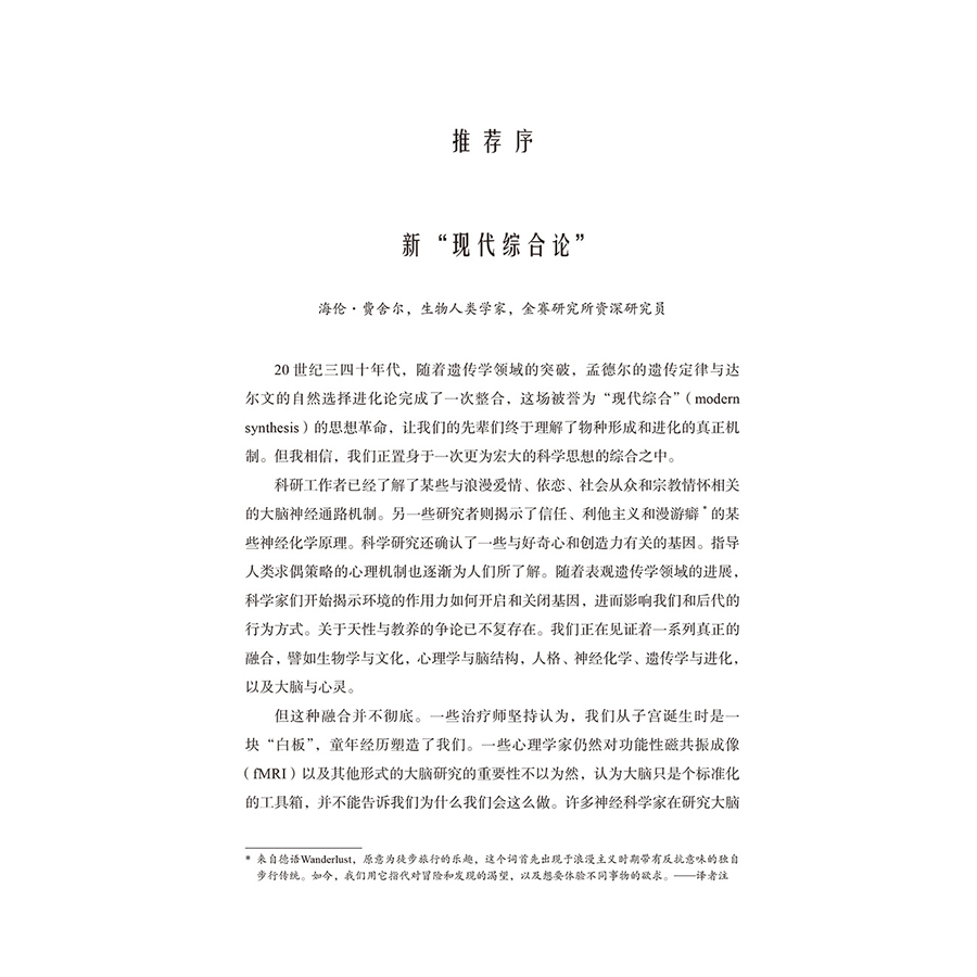 20世纪三四十年代,随着遗传学领域的突破,孟德尔的遗传定律与达尔文的自然选择进化论完成了一次整合,这场被誉为;现代综合(modernsynthesis)的思想革命,让我们的先辈们终于理解了物种形成和进化的真正机制。但我相信,我们正置身于一次更为宏大的科学思想的综合之中。科研工作者已经了解了某些与浪漫爱情、依恋、社会从众和宗教情怀相关的大脑神经通路机制。另一些研究者则揭示了信任、利他主义和漫游癖的某些神经化学原理。科学研究还确认了一些与好奇心和创造力有关的基因。指导人类求偶策略的心理机制也逐渐为人们所了解。随着表观遗传学领域的进展,科学家们开始揭示环境的作用力如何开启和关闭基因,进而影响我们和后代的行为方式。关于天性与教养的争论已不复存在。我们正在见证着一系列真正的融合,譬如生物学与文化,心理学与脑结构,人格、神经化学、遗传学与进化,以及大脑与心灵。但这种融合并不彻底。一些治疗师坚持认为,我们从子宫诞生时是一块;白板,童年经历塑造了我们。一些心理学家仍然对功能性磁共振成像(fMRI)以及其他形式的大脑研究的重要性不以为然,认为大脑只是个标准化的工具箱,并不能告诉我们为什么我们会这么做。许多神经科学家在研究大脑活动时,并不考虑这些激活模式演变的原因。更有人不无嘲讽地说,进化心理学只不过是一大堆故弄玄虚的故事。无论是从实用层面还是知识层面看,我都觉得这种狭隘的关注点很奇怪。在我30年与媒体打交道的生涯中,还从未见过一个记者拒绝用进化论、神经化学或遗传学的方法来解释人类行为,记者和科学界以外的许多人都希望获得更为全面的理解。而且,揭示人类行为的生物学基础并不会威胁社会科学。相反,我认为,我们越是了解驱动人类认知和行为的生物和进化力量,就越能发现文化在塑造人类行为方面所起到的强大作用。不管那些唱反调者如何狡辩,社会科学与生物科学的日益融合正带给我们一个更加广阔和深刻理解人性的视角。而格赫尔和考夫曼的这部《求偶智力》正是对这一新综合论的精彩贡献。
