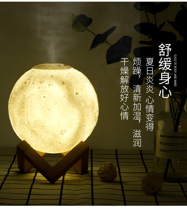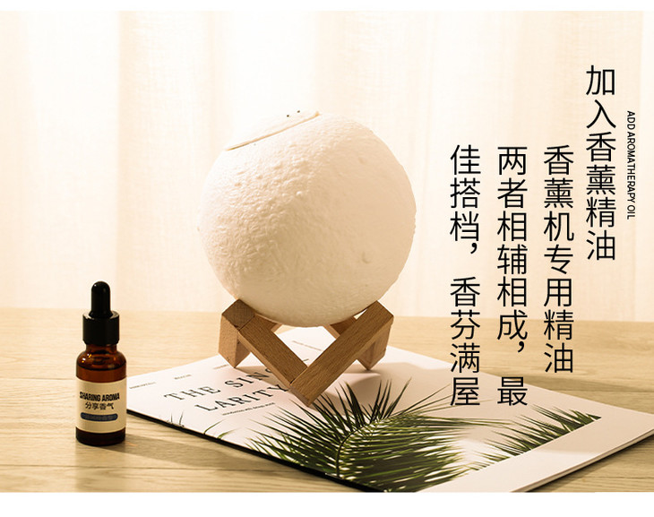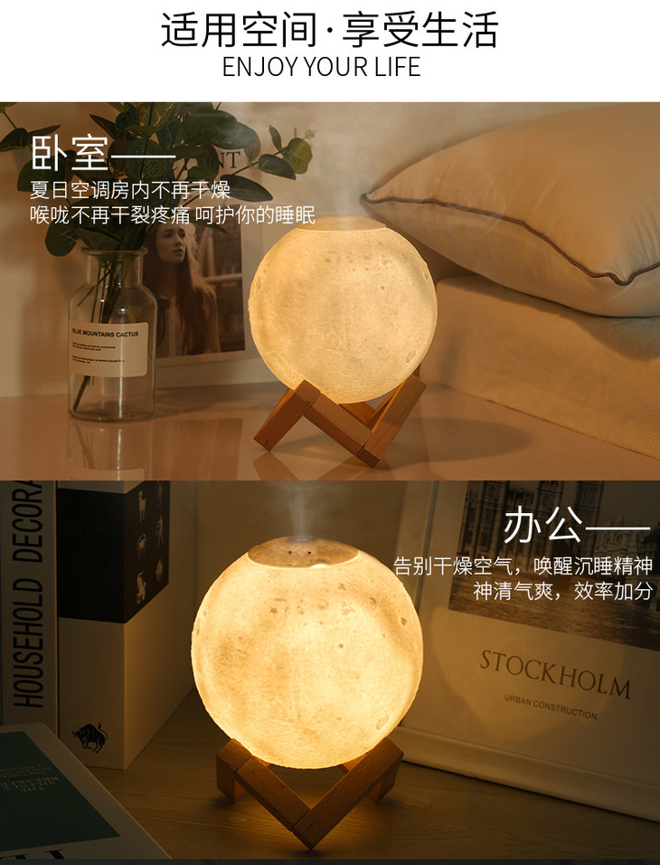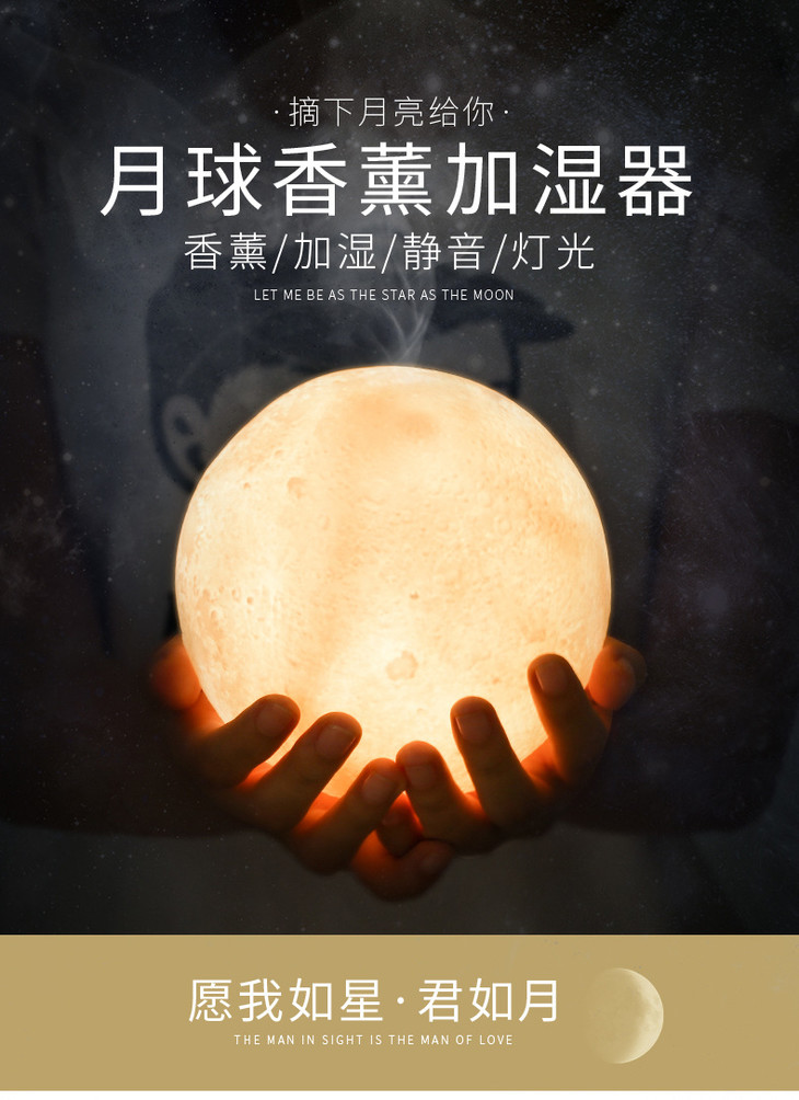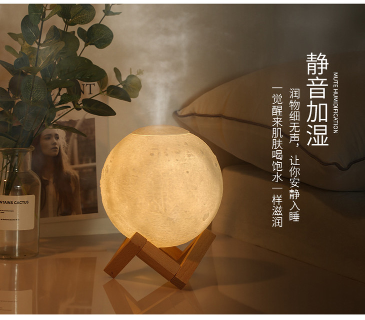 月球灯超可爱,实木底座配上球球,就像是小小的装饰品,而且拥有多种灯光模式,包括白光、暖白光和黄光,可以根据心情调节,真的温馨浪漫!月球灯尺寸为13CM,重量仅为245克,由环保可降解材料制作,使用功率仅为2W,非常节能环保。使用起来也很方便,香薰灯配有两个金属触摸开关和0.5CM充电口,只需要接通电源,通过点触探针开启夜灯和变换颜色,还有一个是喷雾功能,按一下一直喷,按两下间歇喷,按三下关闭!