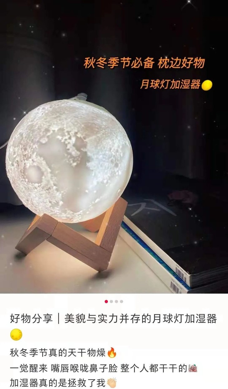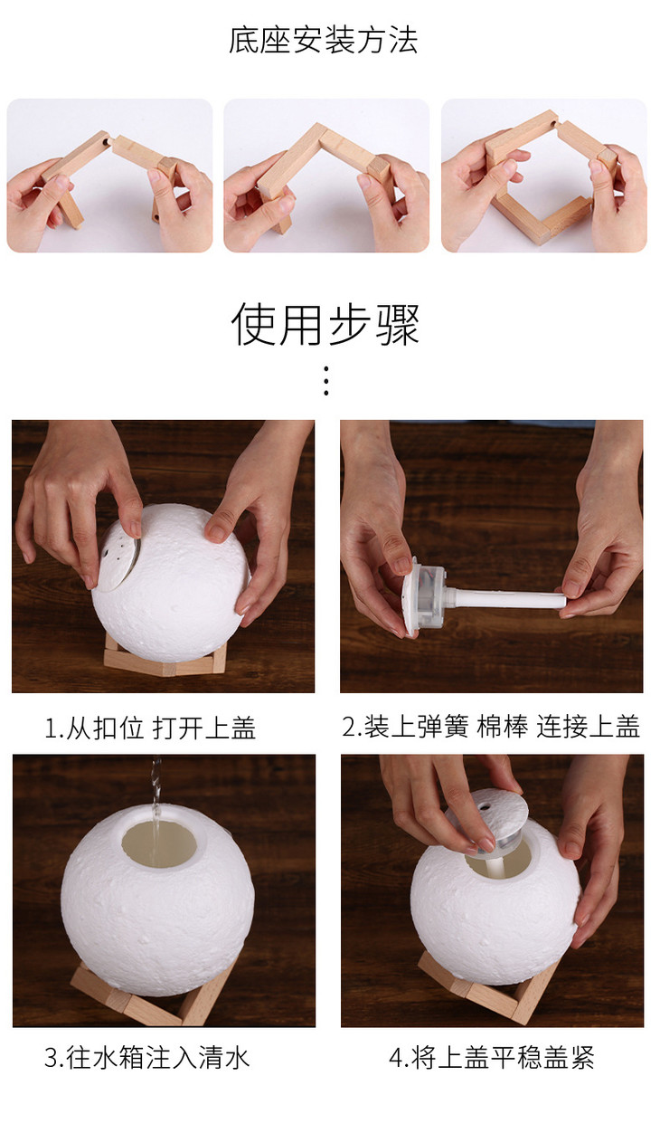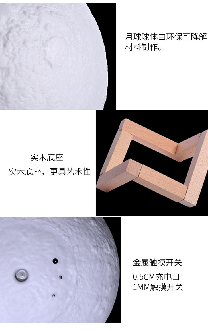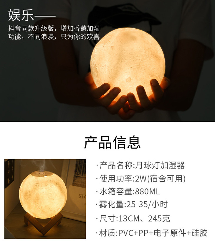 月球灯超可爱,实木底座配上球球,就像是小小的装饰品,而且拥有多种灯光模式,包括白光、暖白光和黄光,可以根据心情调节,真的温馨浪漫!月球灯尺寸为13CM,重量仅为245克,由环保可降解材料制作,使用功率仅为2W,非常节能环保。使用起来也很方便,香薰灯配有两个金属触摸开关和0.5CM充电口,只需要接通电源,通过点触探针开启夜灯和变换颜色,还有一个是喷雾功能,按一下一直喷,按两下间歇喷,按三下关闭!