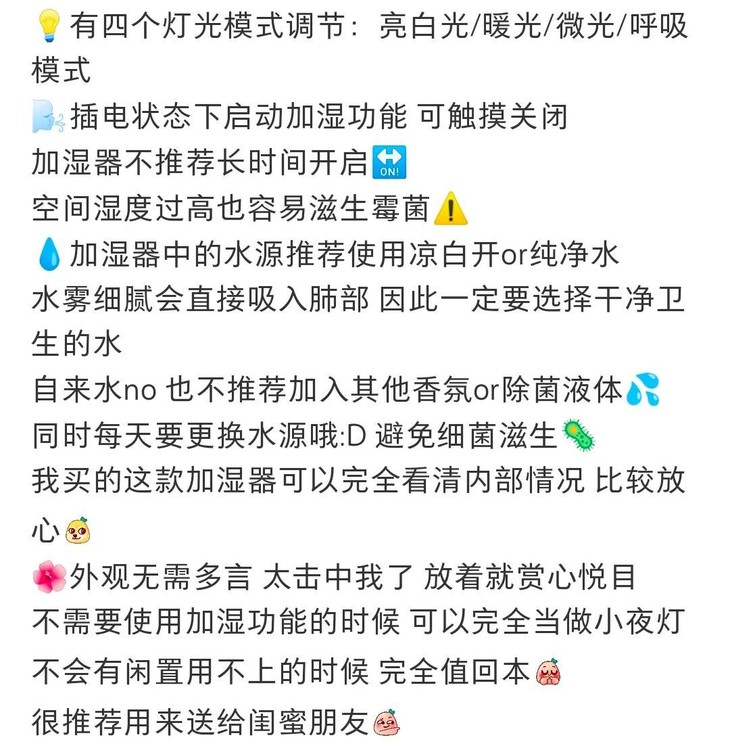 秋冬也是有点干燥,月球灯就是一个小加湿器啦!只要从扣位打开上盖,在球球中注入清水,再把棉棒浸湿后,盖紧,开启后就能喷出细密的水雾啦!它的容量有880ML,雾化量为25-35毫升/小时,加满一桶能足足使用30小时,连续10小时或水见底了会自动关机,很贴心!当然,我更推荐直接加ayu的精露啦,玫瑰,苦橙、香蜂草和薰衣草都很可,也可以按比例调制,喷雾静音技术完全不会影响睡觉,非常治愈,梦都能香甜不少!如果没囤上精露,在水中加入几滴精油,也是可以的。