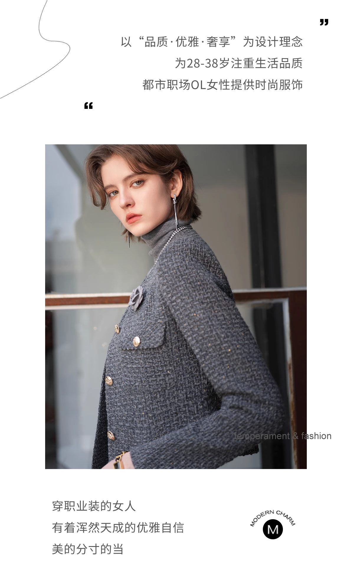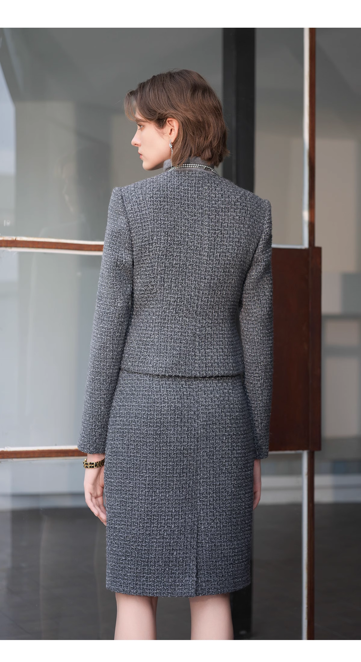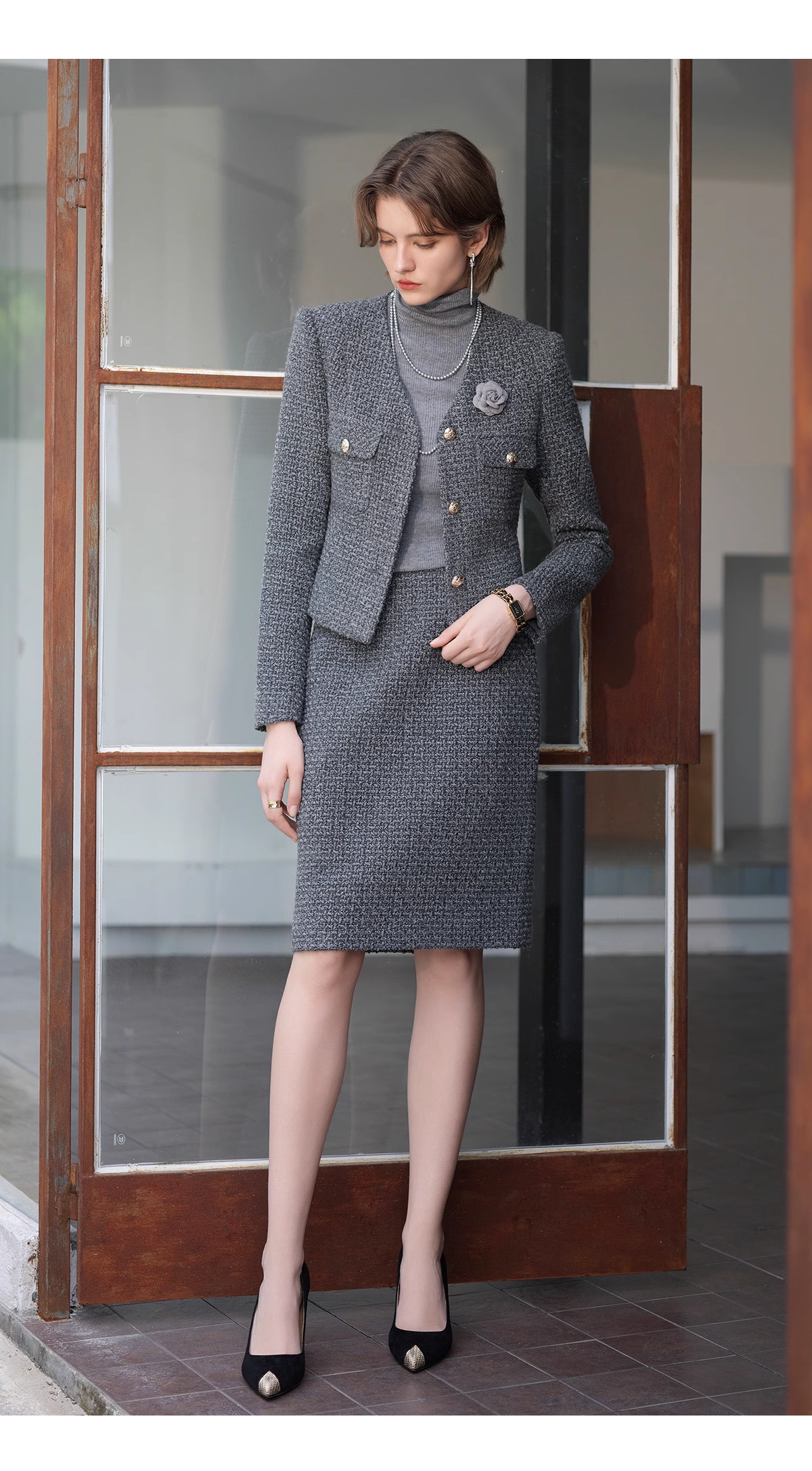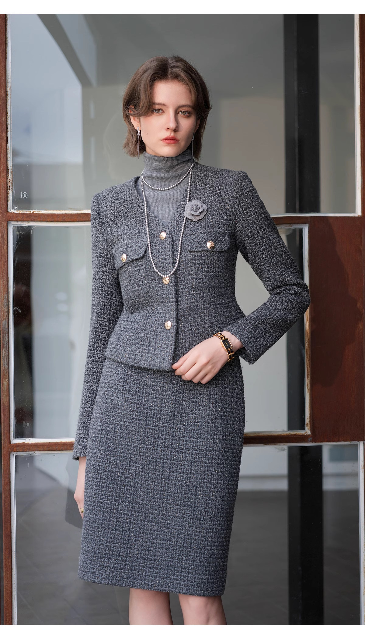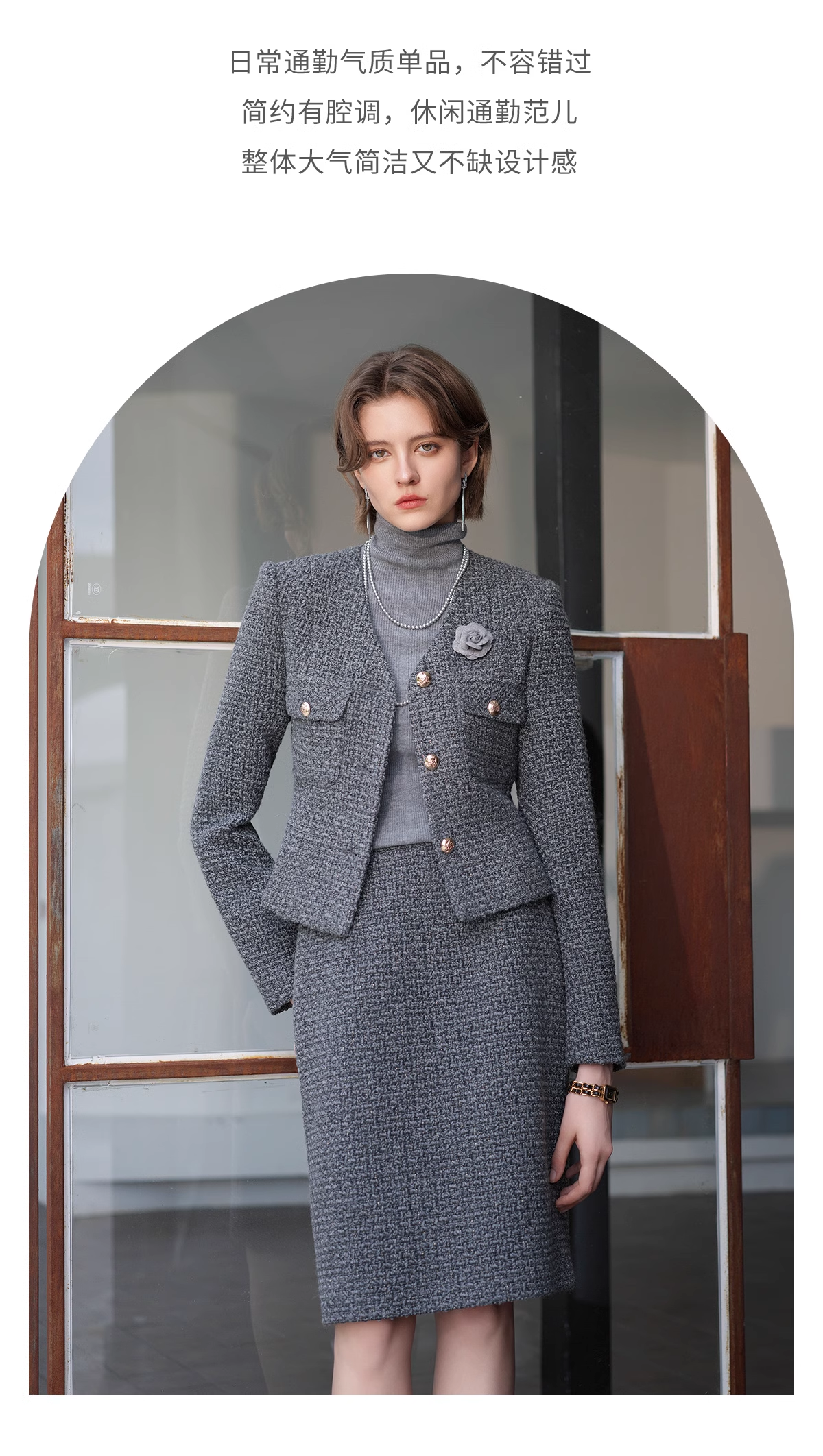 AD小香风套装2026新款爆款灰色羊毛呢子两件套轻熟风V领编织外套