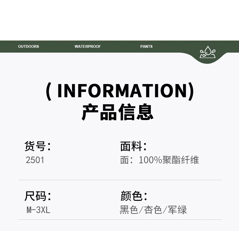 【品名】senlinjeepsd 森林吉普 山系冲锋户外休闲裤 防水 防风 防刮 男女同款ELXM99-2501 【规格】杏色、军绿、黑色 【尺寸】M-3XL 【产地】国内 【材质】聚酯纤维100% 【发货包装】独立包装袋 【发货地】福建 【发货快递】申通 【不发货区域】新疆、西藏、港澳台 【补邮费地区】内蒙古、宁夏、甘肃、青海+8元 【发货时效】48-72小时,周末节假日顺延 【特别提示】七天无理由退货或拦截扣3.5元 |