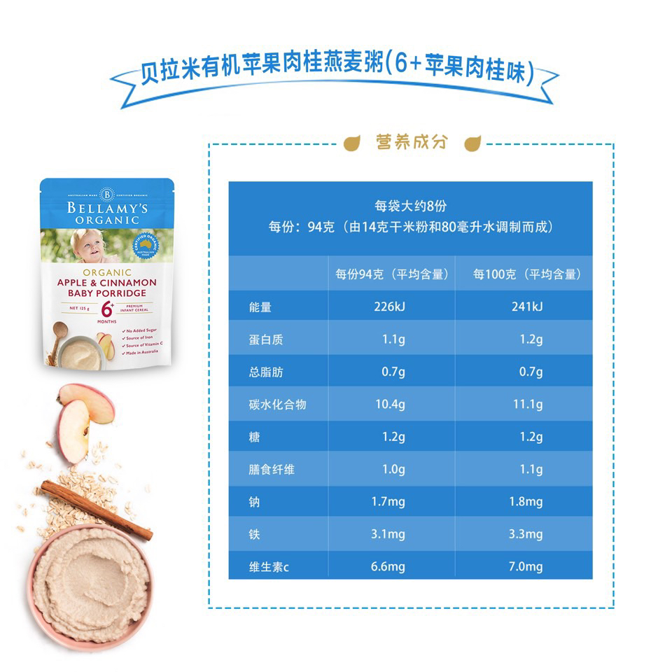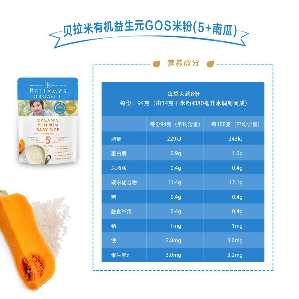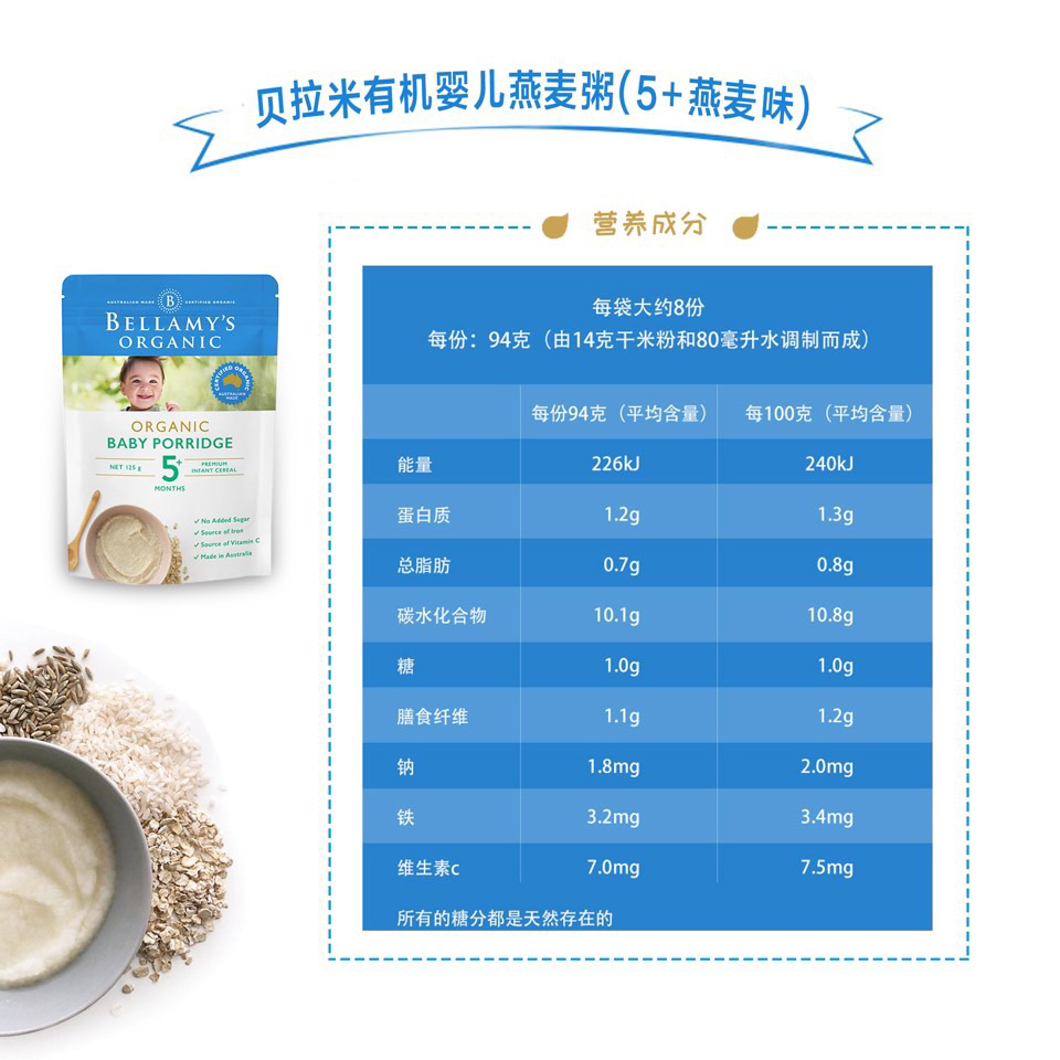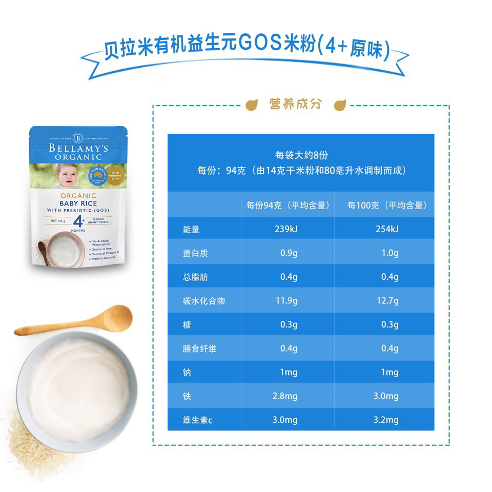 100%澳洲生产,甄选高品质有机大米和谷物,强化铁和维生素C,无添加防腐剂或糖,只有纯纯的大米和谷物的清香,粉质细腻,易冲泡。🥣建议两顿奶餐之间喂食,搭配贝拉米有机果泥,营养更丰富。