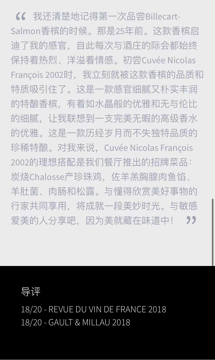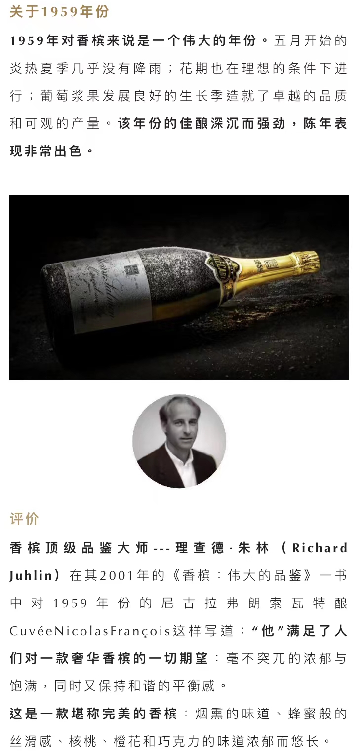 2002年份是香槟产区的大年,这款尼古拉弗朗索瓦年份特酿香槟经过二十年的时光更是焕发更大的魅力。