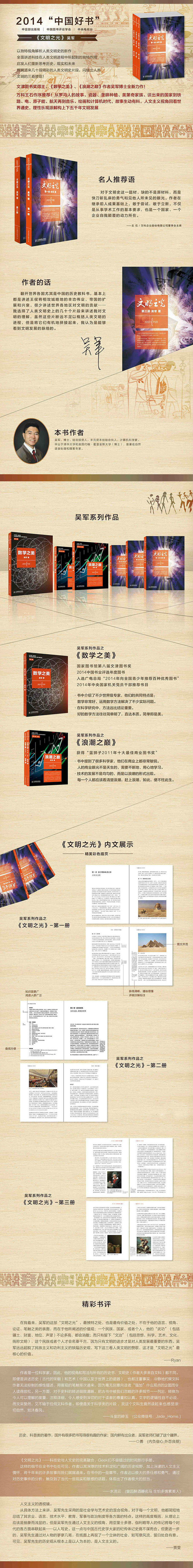 ★著史需史才、史学和史识。吴军博士的史才,我们在《浪潮之巅》中已经领略;他在不同文化、不同机构下科研工作的积累,加上他长期游历欧美实地考察,也赋予了他难得的史料厚度和相关知识底蕴;从科学家向投资家身份的成功转型,使得他常常能道出超越同侪的见识。这些独特条件,确保了他能以一人之力,从浩瀚的原材料中,合理选择片段,拼成一幅文明之光的拼图。