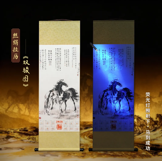 【福气满满+双骏图 百福环绕 马到成功】2026《马年挂历》系列 北研所出品 丝绢装裱 荧光防伪 133*42cm尺寸(京东快递送货上门)