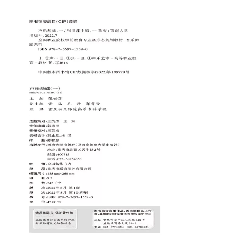 *书名:声乐基础(一) | *ISBN:978-7-5697-1559-0 |