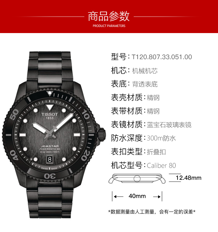 【时计廊】天梭海星1000系列俊朗黑钢带80机芯机械腕表龚俊同款T120.807.33.051.00