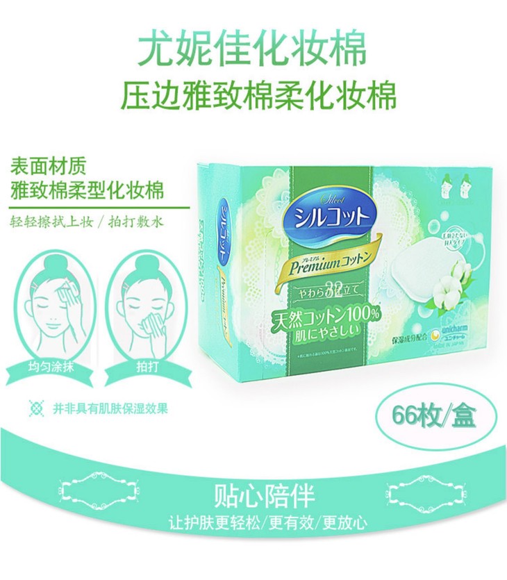 尤妮佳100%天然棉花化妆棉66枚👍这款采用加强版丝花化妆棉,两层芯,表面为天然棉,内层夹纯棉,不含各种荧光剂和添加料✅。相对来说比较厚的一款,对皮肤摩擦小,用完脸上很光滑😇。且添加保湿成分配合💦,保湿蓄水性更好。非常适合用来擦拭化妆水或者卸妆,二次清洁首选🙋!