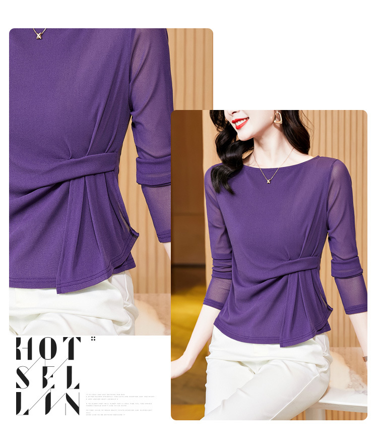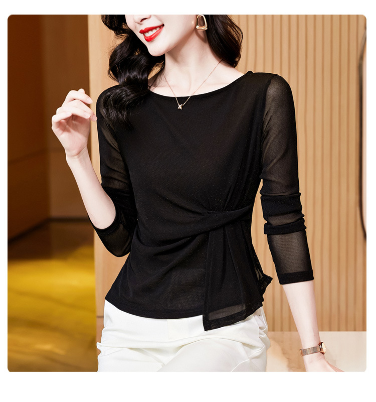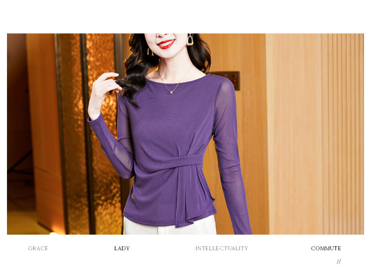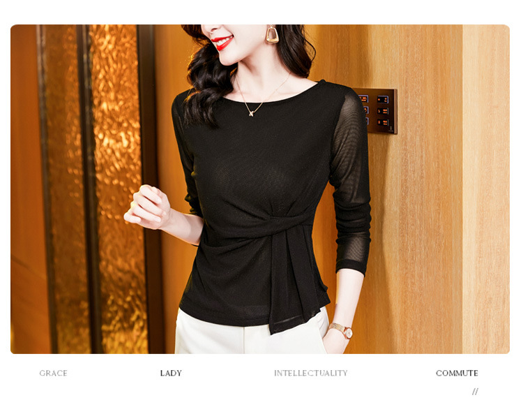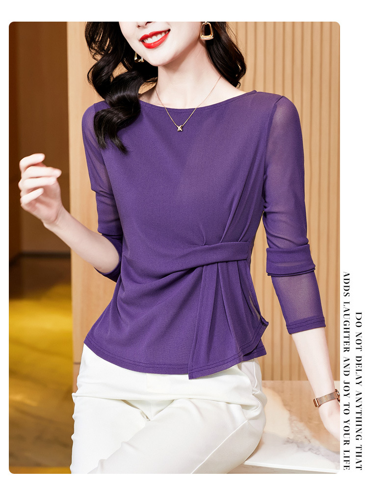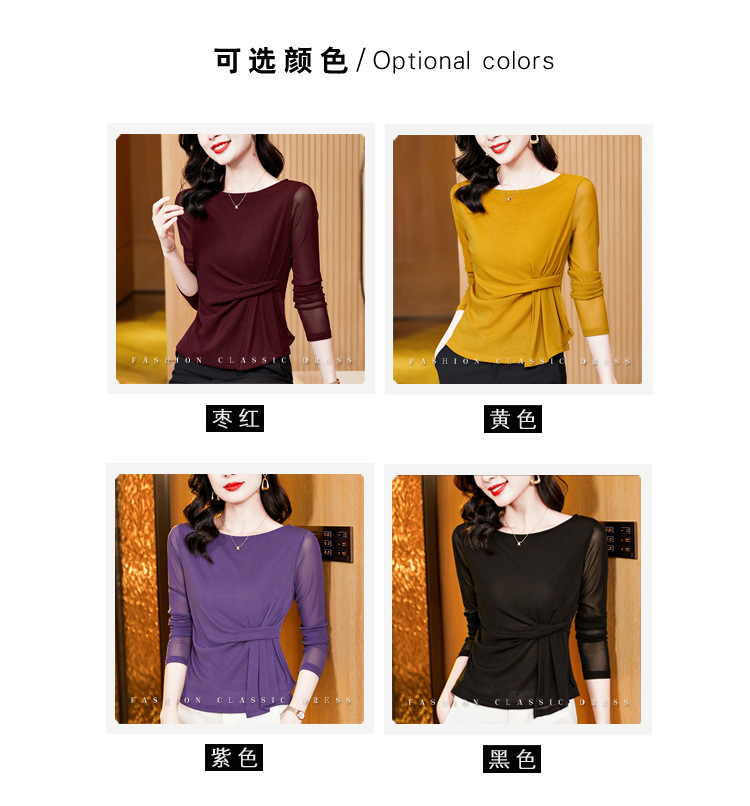 KQL E37M2925洋气一字领纯色气质网纱长袖打底衫t恤