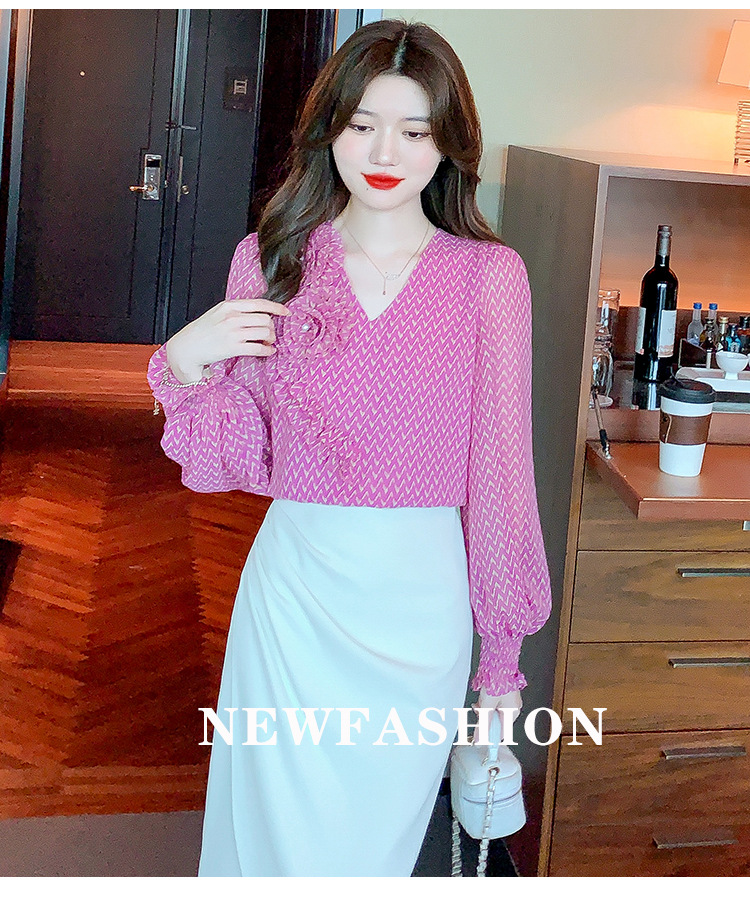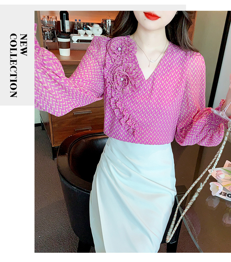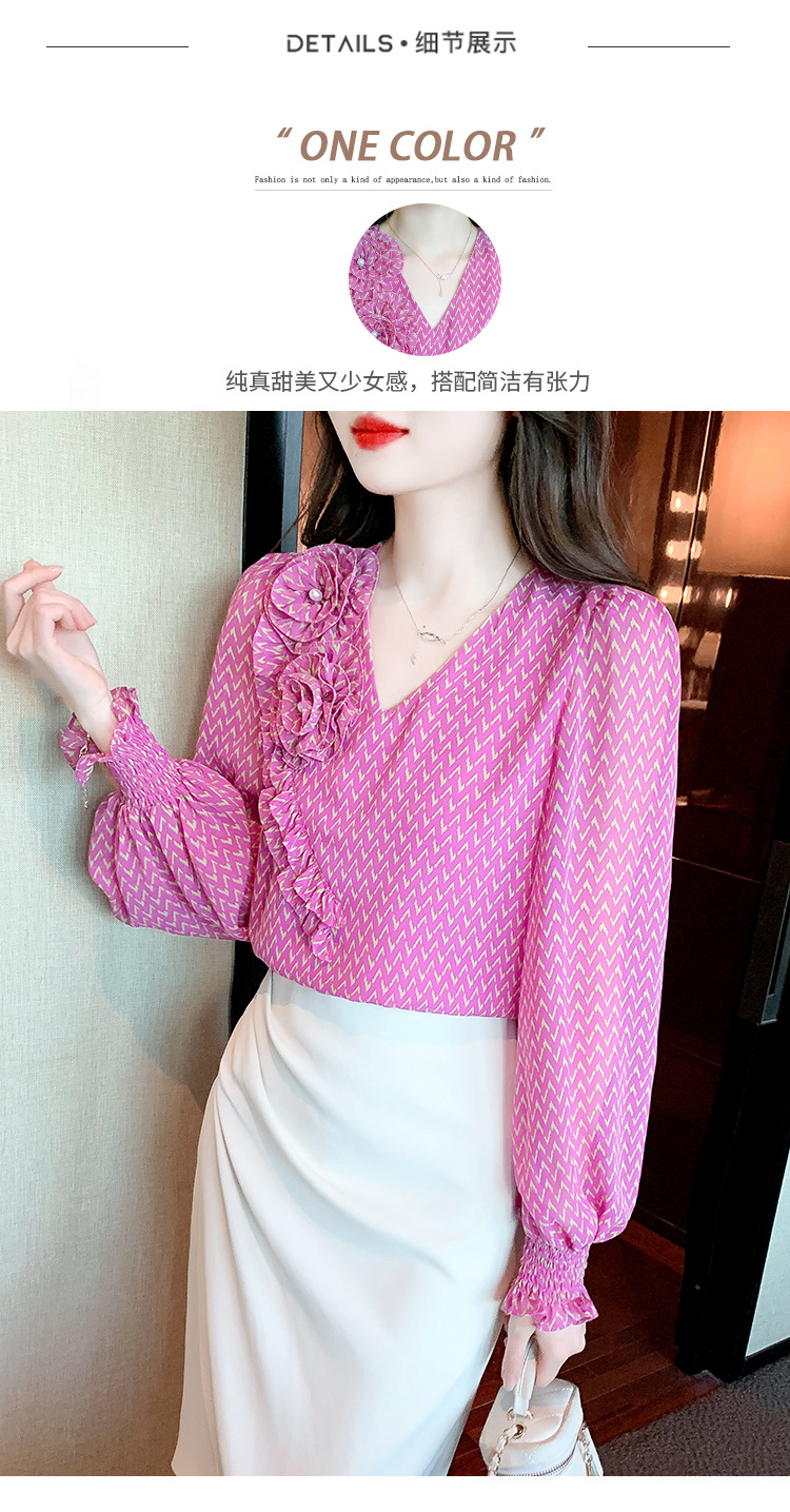 AHMlsyj7600玫瑰红色洋气减龄衬衫女2023秋季新款法式小众设计感印花长袖上衣 商品图2