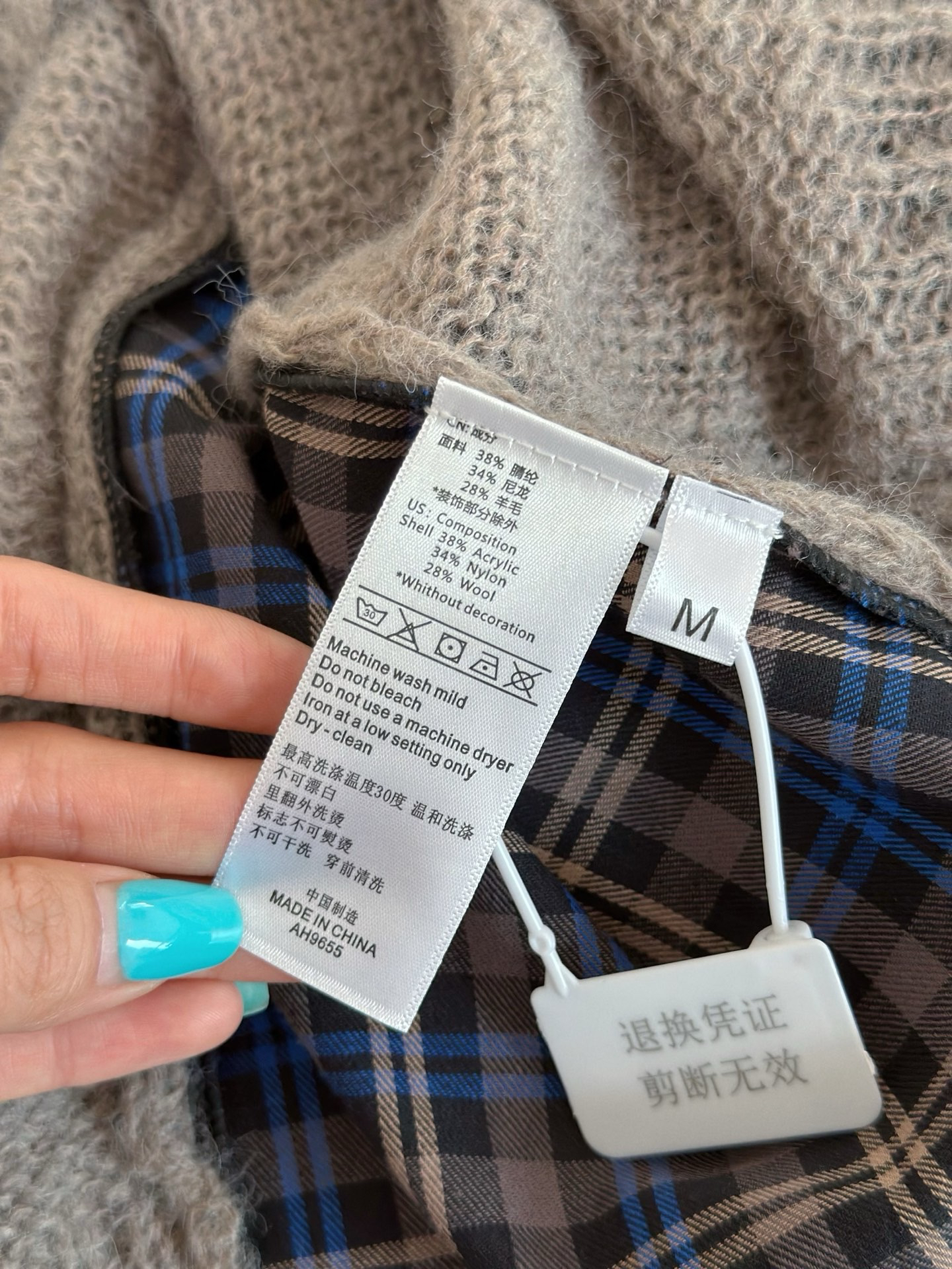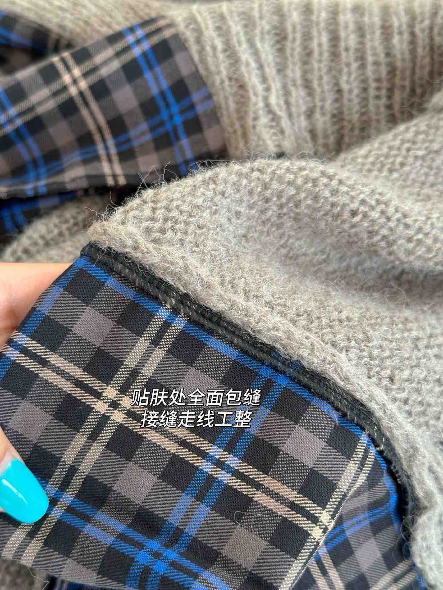 真的都是细节成本!全部单独定纺格纹面料 再将格纹与毛纱缝制成型 接缝走线工整,内里拼接部分整齐细密,重工繁复!