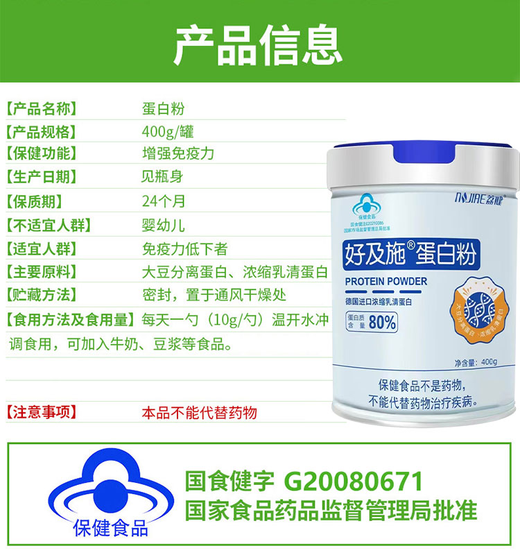 荔健-好及施蛋白粉400g/罐 蓝帽子保健食品 蛋白质含量80% 进口乳清蛋白