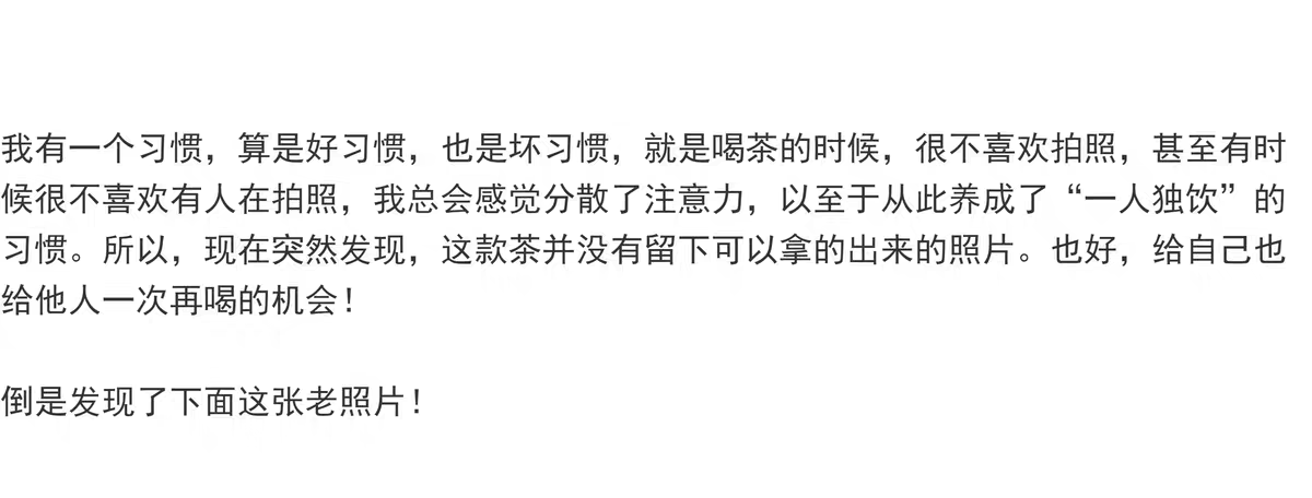 - 2021年,嘉木会创办了“藏茶密室”,开启了全新的藏茶模式,秉持“不将就,不迎合”的理念,通过“选、藏、养、醒”的方式,再度诠释藏茶的深意,沉醉杯汤,苦乐自知,茗透于心,迷之不悔!